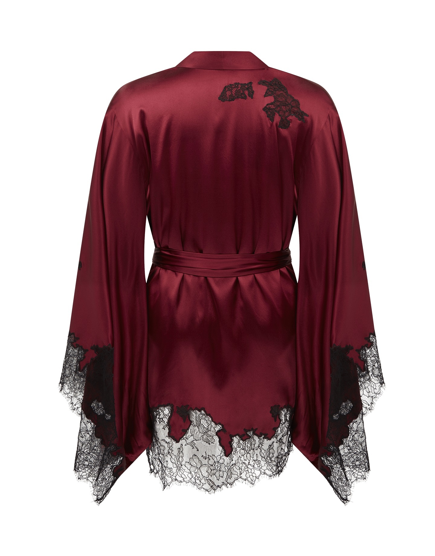 Роскошь и классические детали соединились в предметах коллекции Christi. Короткий халат-кимоно выполнен из нежного стрейч-шелка в роскошном оттенке бургунди и украшен тончайшим французским кружевом черного цвета. Модель идеально дополнит образ с боди или сорочками Christi.
