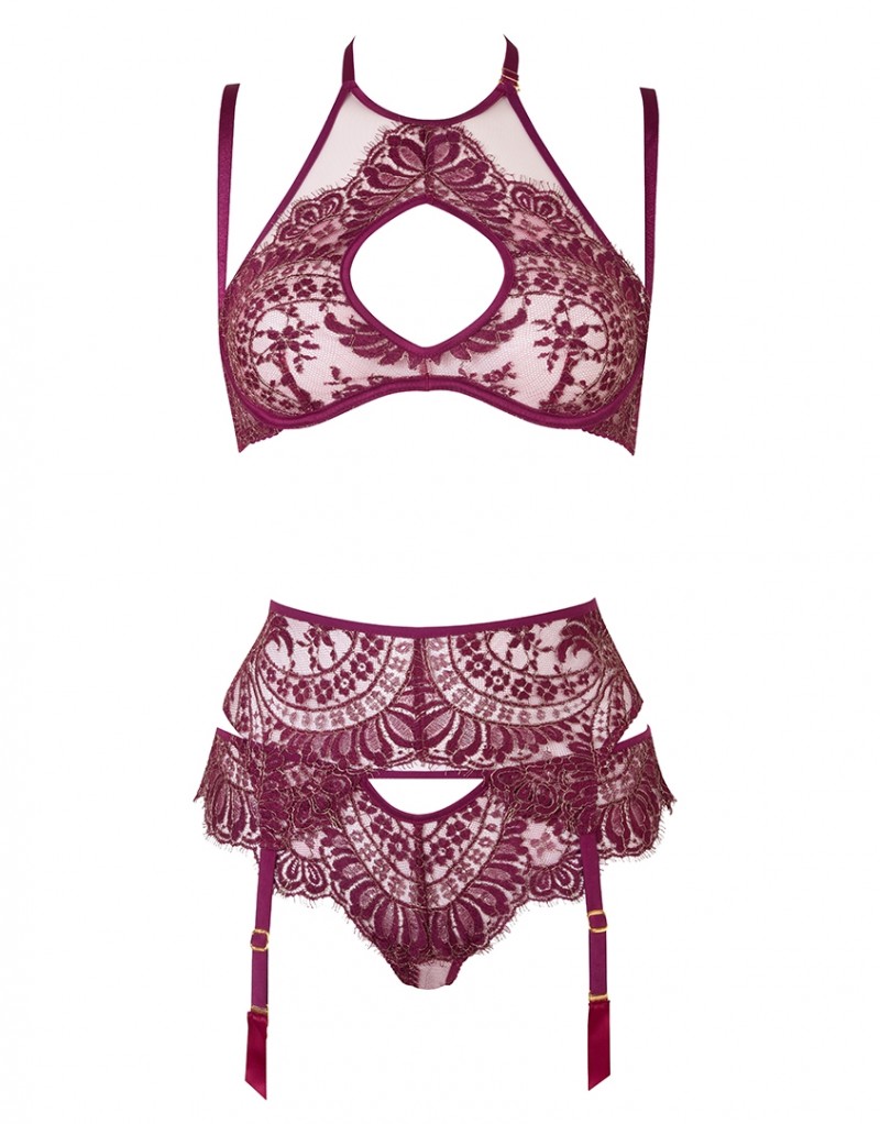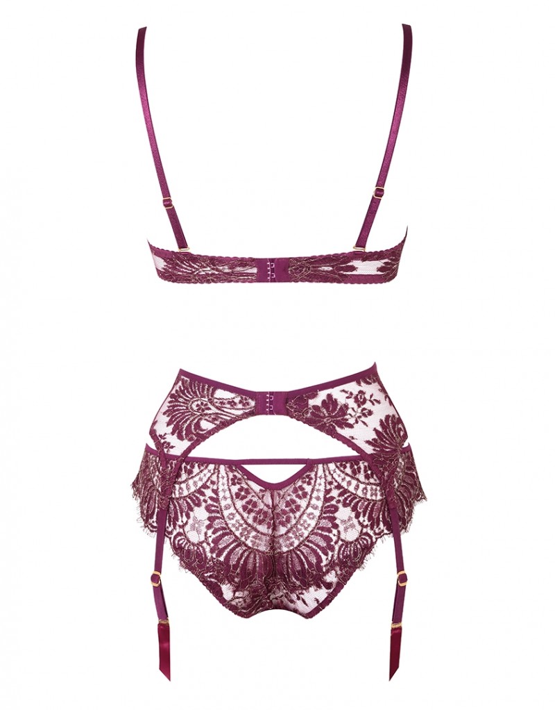 Почувствуйте себя на высоте в Zalia, роскошном и богато украшенном кружевном комплекте. Пояс из французского кружева ливерс винного оттенка, расшитого нитями золотого люверса дополняют шелковые пажи. Лепестки кружева соблазнительно обрамляют бедра.