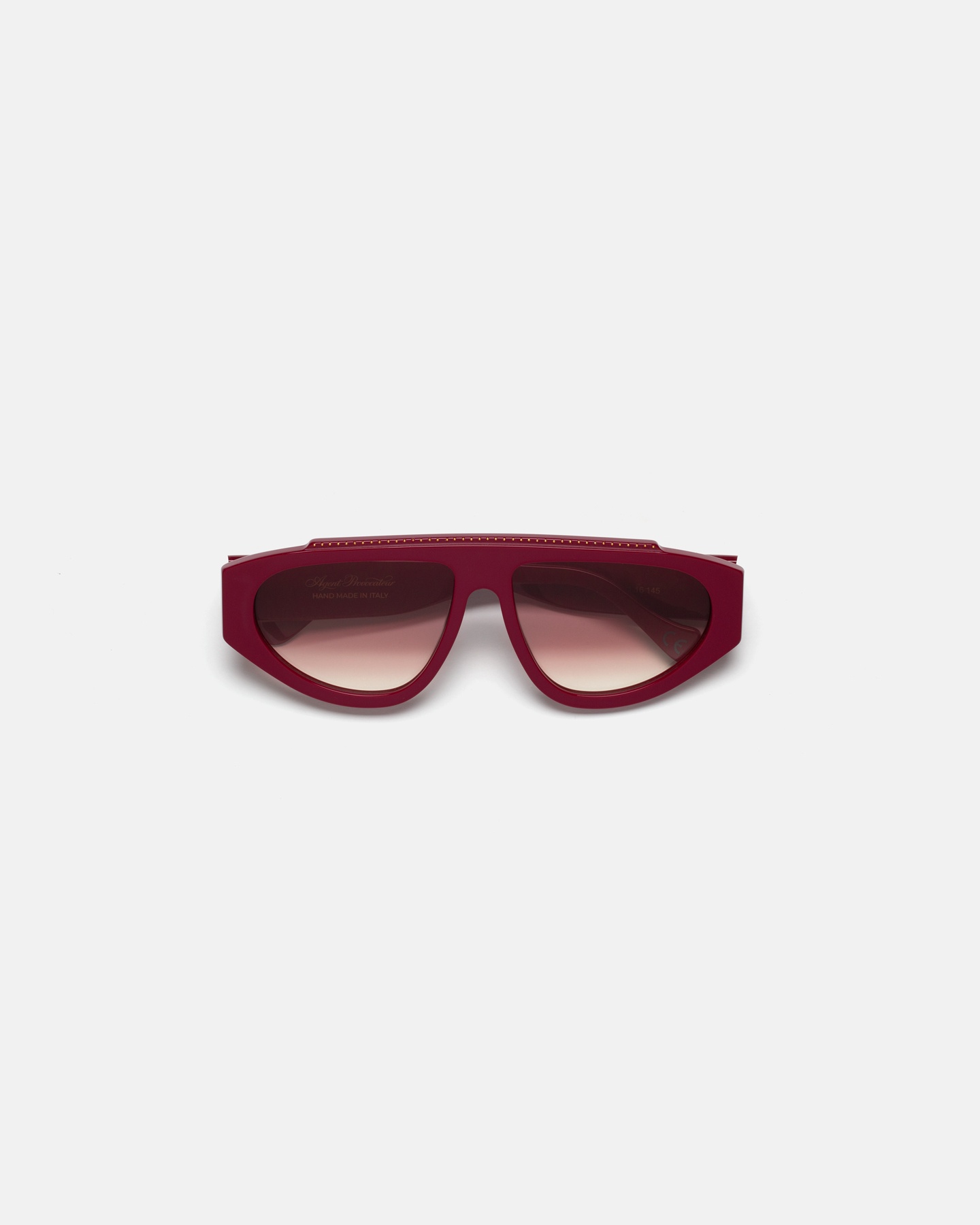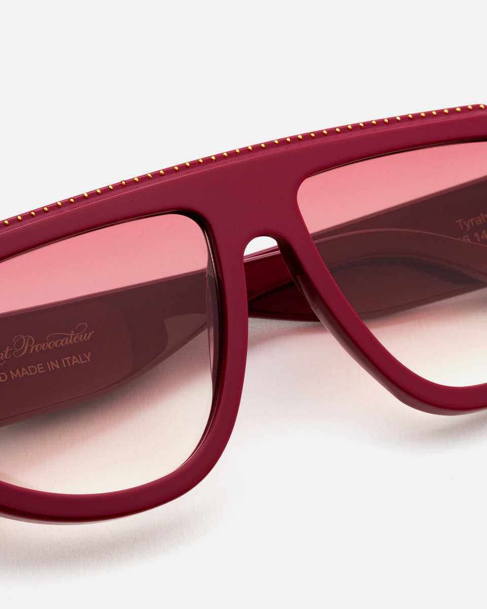 Солнцезащитные очки из коллекции Tyrah заключены в угловатую оправу бордового цвета, на верхней части которой расположена перфорированная часть. Линзы с градиентной тонировкой защищают от UVA и UVB излучений.