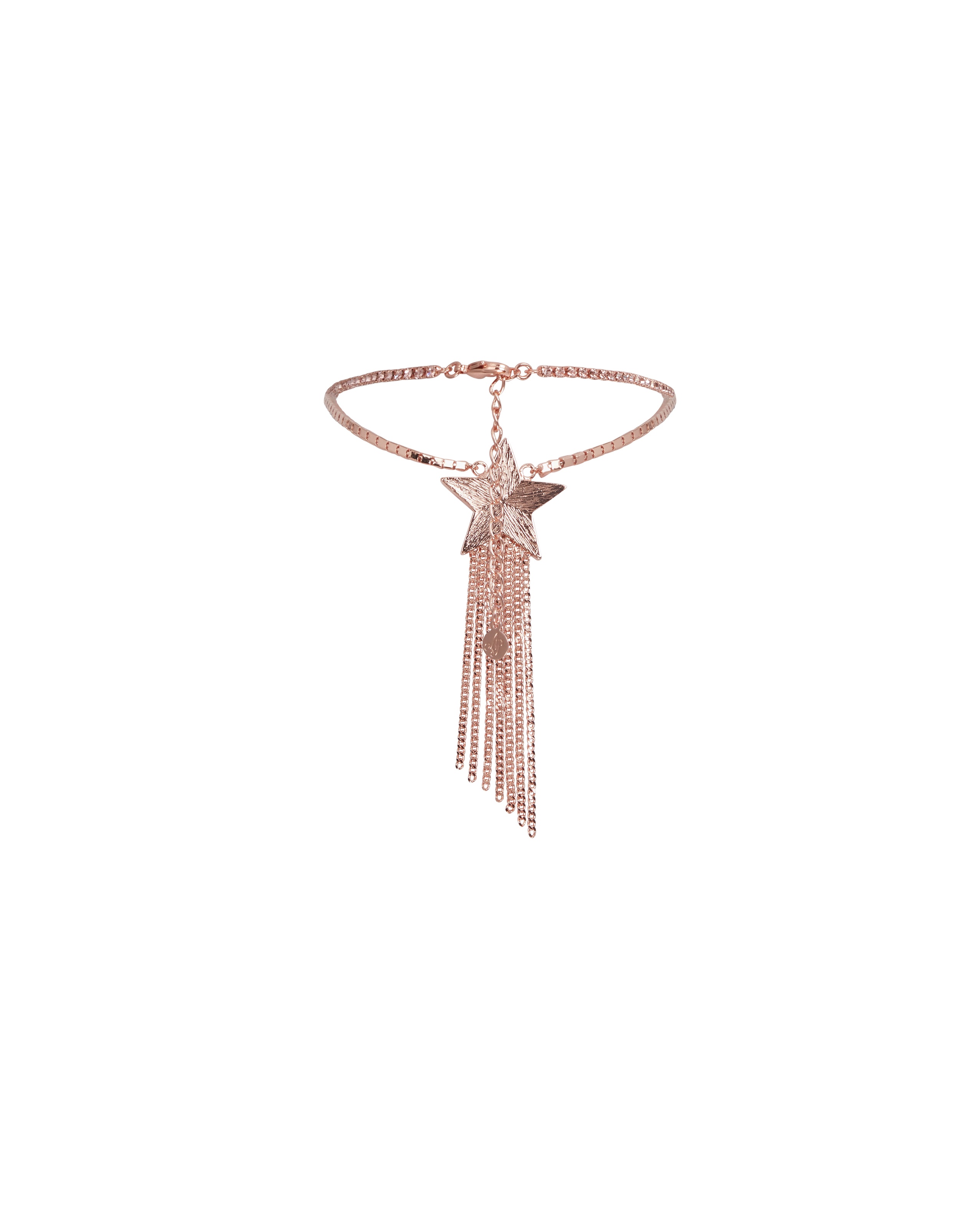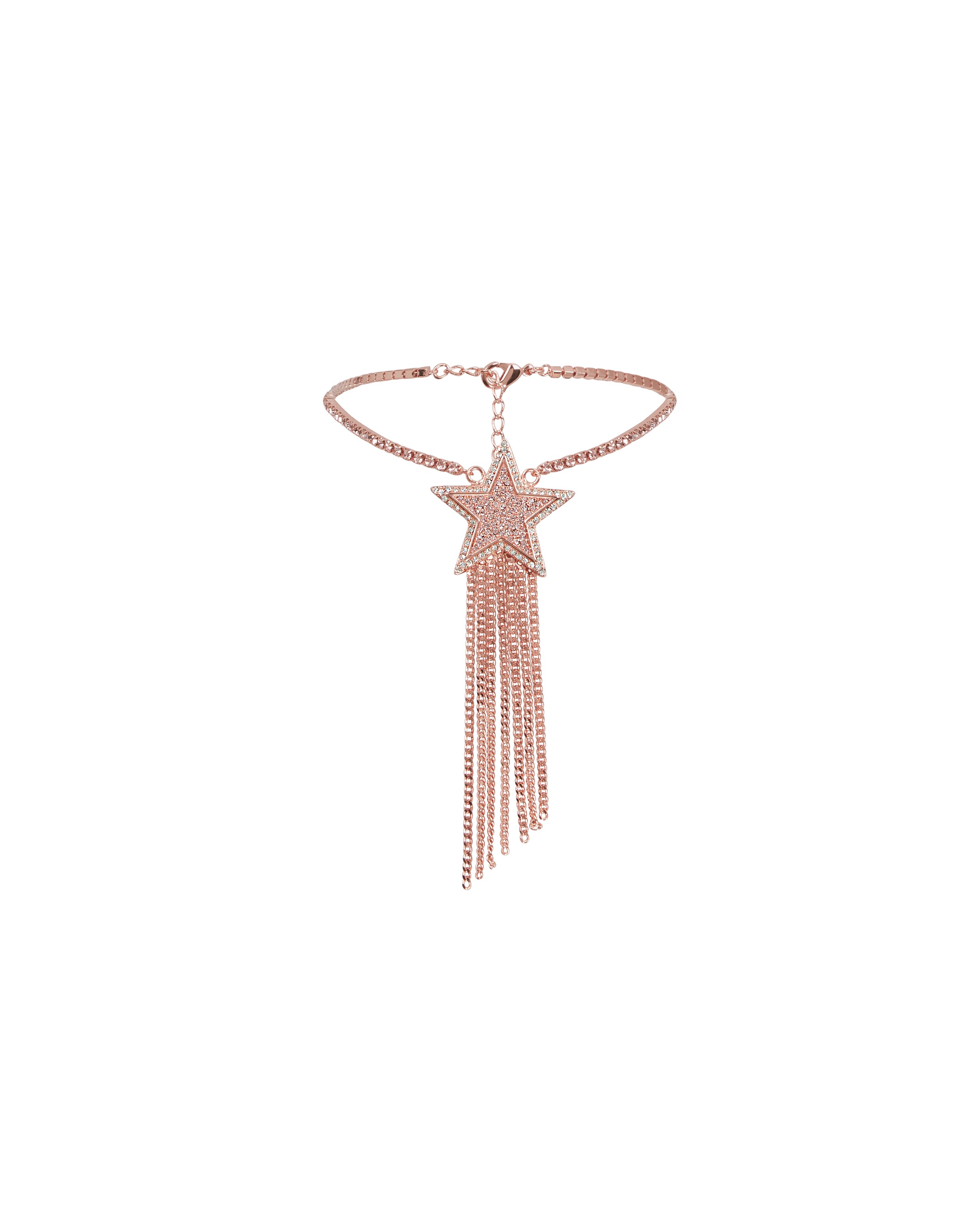 Браслет на ногу Dustie цвета розового золота украшен звездой с кристаллами розового и прозрачного цвета и цепочками-кистями. Вокруг щиколотки – цепочка со стразами, регулируемая застежка-краб. Сочетайте с коллекцией Dustie для игривого образа.