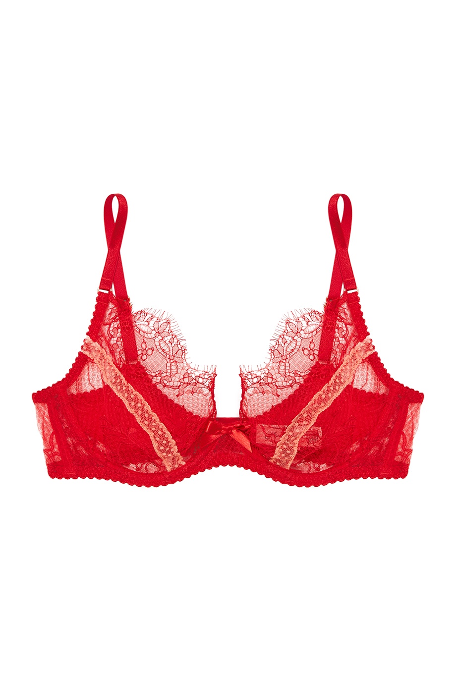 Новая кружевная коллекция Alannah сделает каждый день незабываемым. Высокий бюстгальтер на косточках из двуслойного красного кружева украшают бледно-розовые ленты, спускающиеся вдоль чашек. Тончайшие кружевные лепестки обрамляют декольте. Петельная отделка по краю и красный бантик между чашек завершает образ.