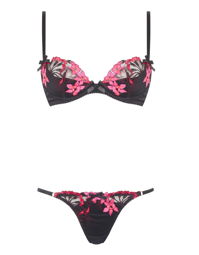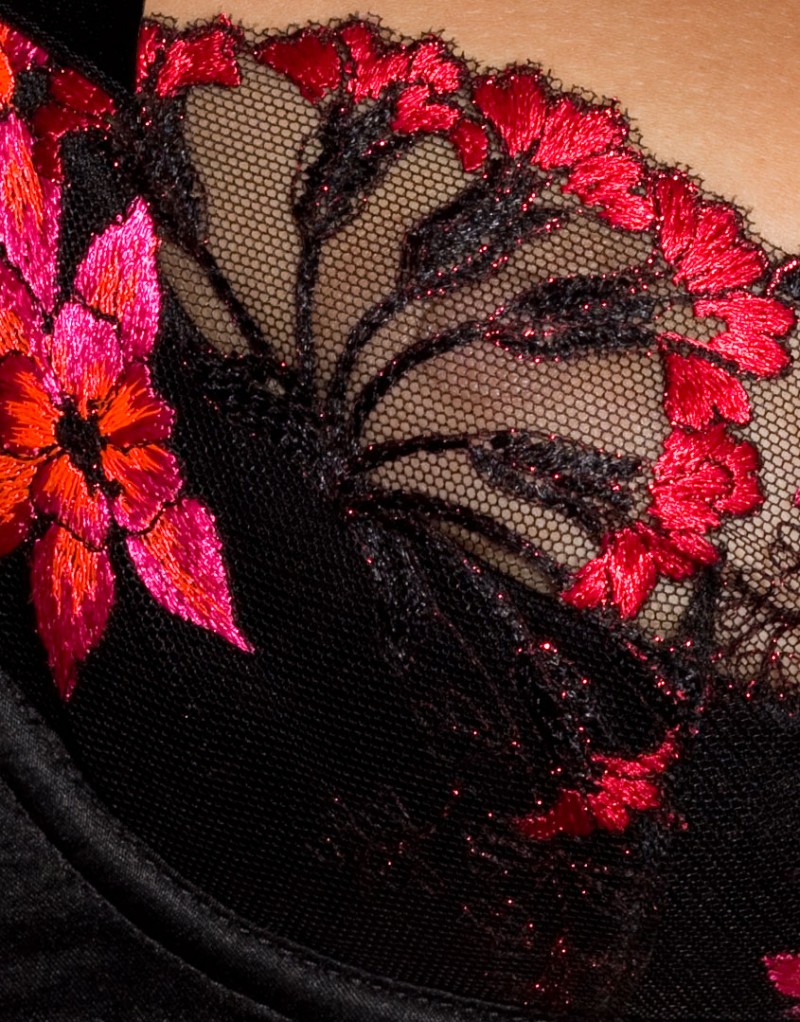 Brianna – это загадочное и манящее сочетание черного шелка и ярко-розовой флоральной вышивки. Бюстгальтер с внутренней чашкой ¼ потрясающе поднимает грудь. Верхний слой чашечек украшен декоративной вышивкой насыщенного розового и черного цвета. Небольшие бантики из ткани пико у основания лямок и между чашечками завершают образ.