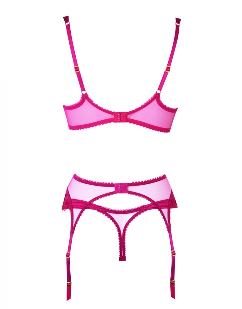 Встречайте новый игривый бестселлер. Бюстгальтер цвета фуксии с глубокими чашками создан из легчайшего полупрозрачного тюля. Чашки бюстгальтера разделены швами на три части, нижняя из которых дополнена двойным слоем материи для дополнительной поддержки. Спинка из крупной сетки, нежная кружевная отделка вдоль декольте и сатиновые бантики завершают женственный образ.