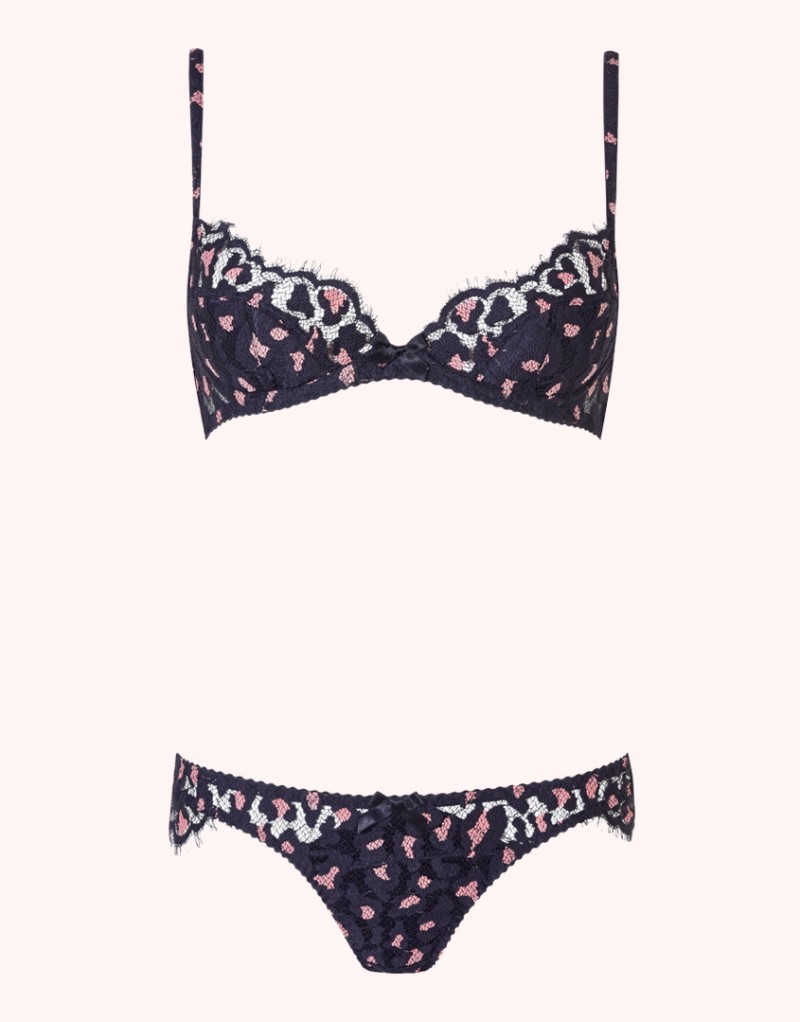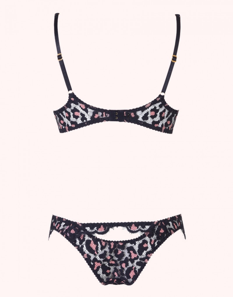 Выполненная в наших фирменных цветах, черном и пудрово-розовом, коллекция Effie подходит как для ежедневной носки, так и для романтического вечера. Must-have этого сезона - бюстгальтер с половинчатой чашкой и эффектом пуш-ап придает груди пышную и округлую форму. Бюстгальтер выполнен из шелка, покрытого нежным кружевом леопардовой расцветки. Линию декольте подчеркивает ажурный вырез и игривая бахрома, а нежный бантик между чашек завершает женственный образ.