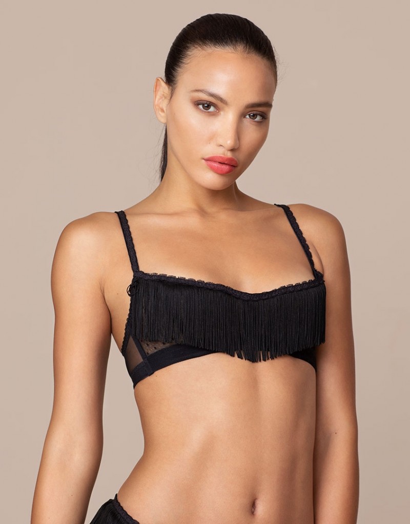 Бюстгальтер без косточек, выполненный из изящной сетки, цитирует викторианский стиль. Модель дополнена принтом в горошек и игривой шелковой бахромой вдоль линии груди.