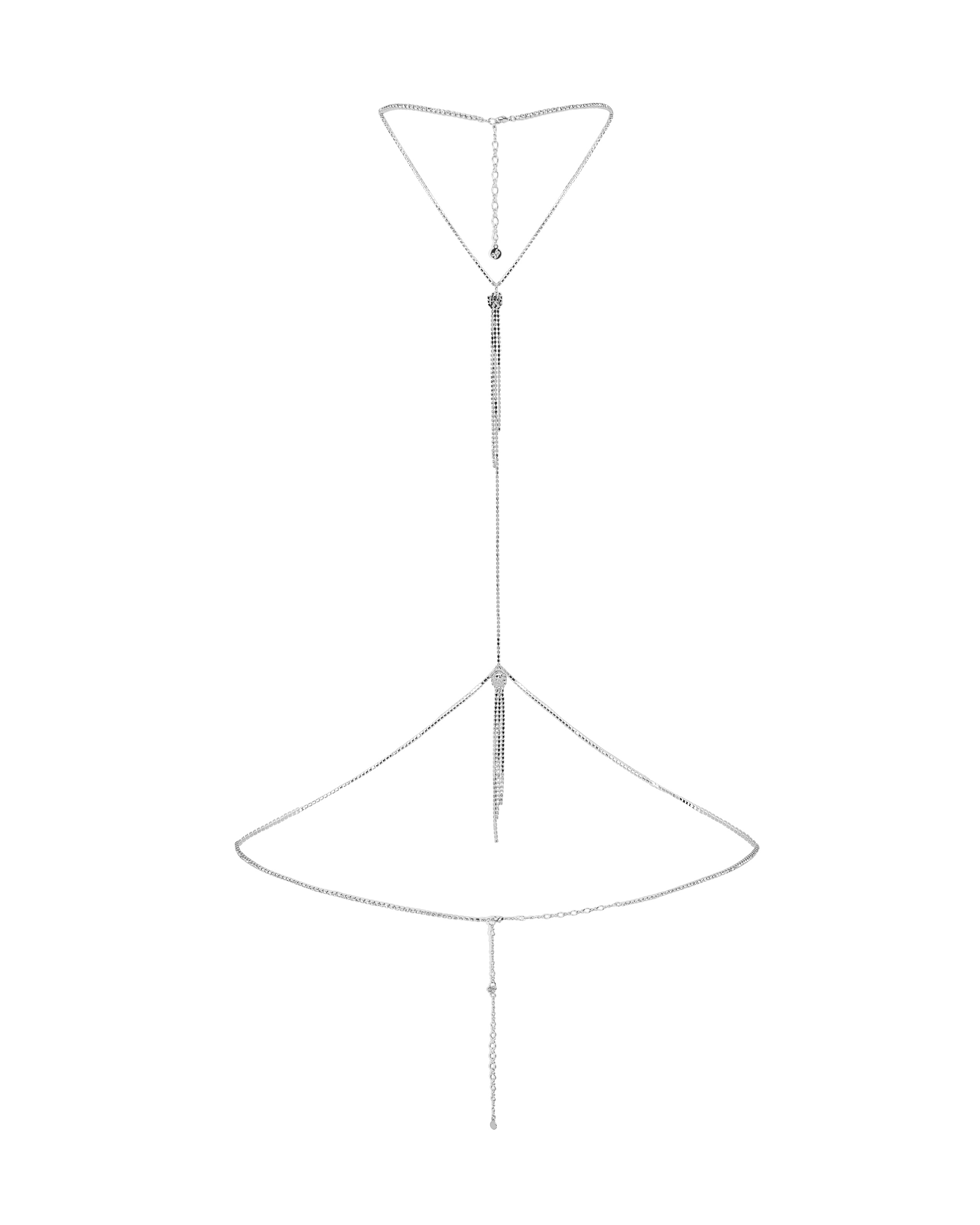 Цепочка на тело Chrystalina серебристого цвета с нежными кристаллами элегантно ниспадает по телу, с кистями на шее и талии. Водостойкое покрытие и универсальность позволяют носить ее с нижним бельем, любимой одеждой или как самостоятельный акцент.