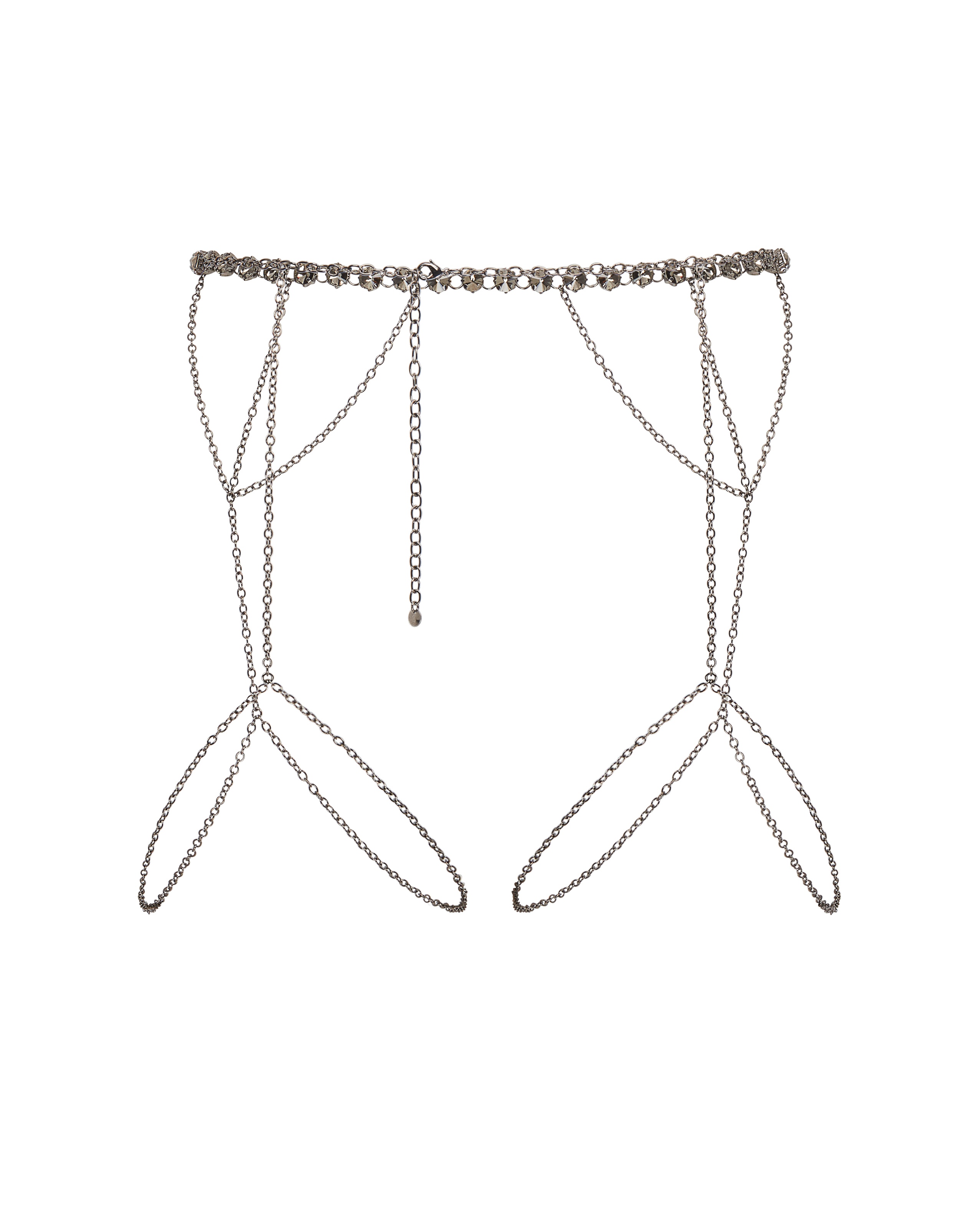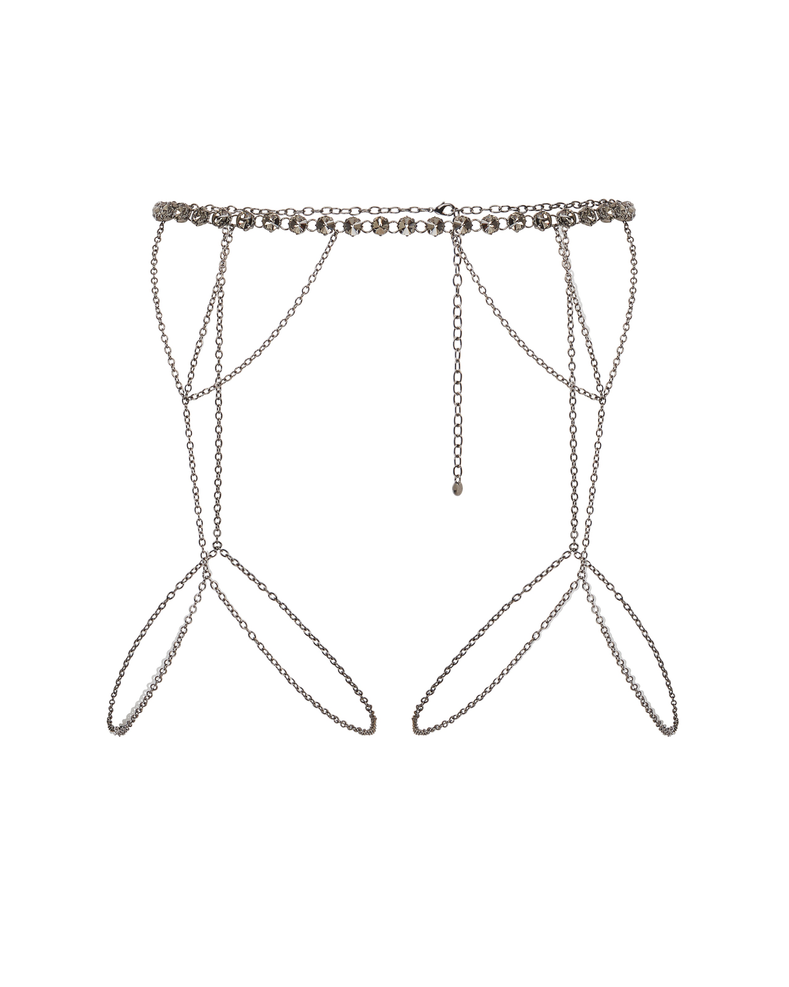 Черные подвязки-чапсы Kensia: черные кристаллы, металлический шик и скульптурные линии. Дерзкий аксессуар, подчеркивающий бедра. Идеальная посадка благодаря регулировке. Дополните свой образ коллекцией Kensia, чтобы почувствовать себя закованной в броню соблазнительницей.