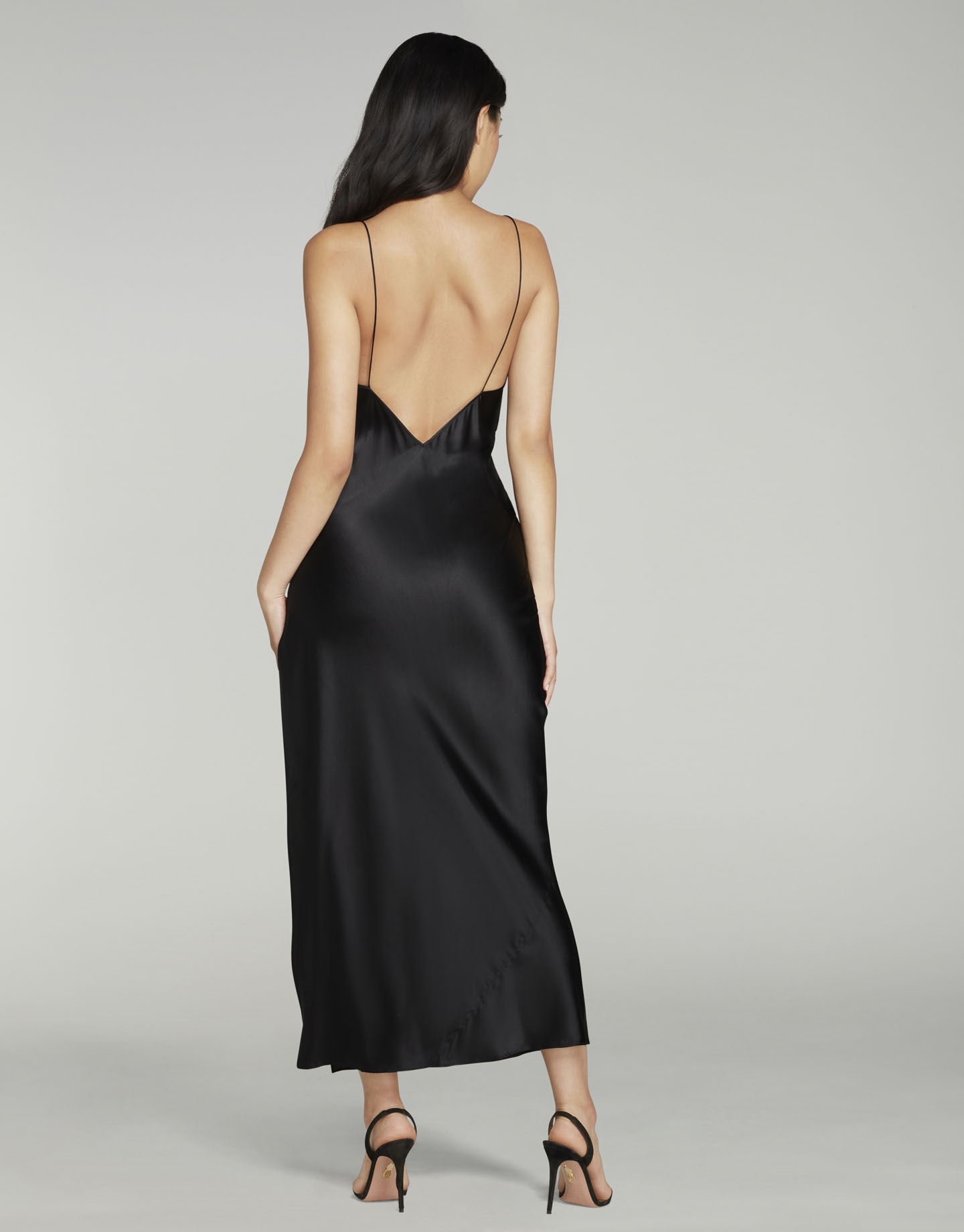 Сорочка длины миди сшита из струящегося шелкового атласа. Утонченный классический крой подчеркнут графичным V-вырезом. Тонкие бретели мягко огибают плечи, продляясь на спине в углубленное декольте. Глубокий разрез сбоку ставит яркий акцент в стиле классического декаданса.