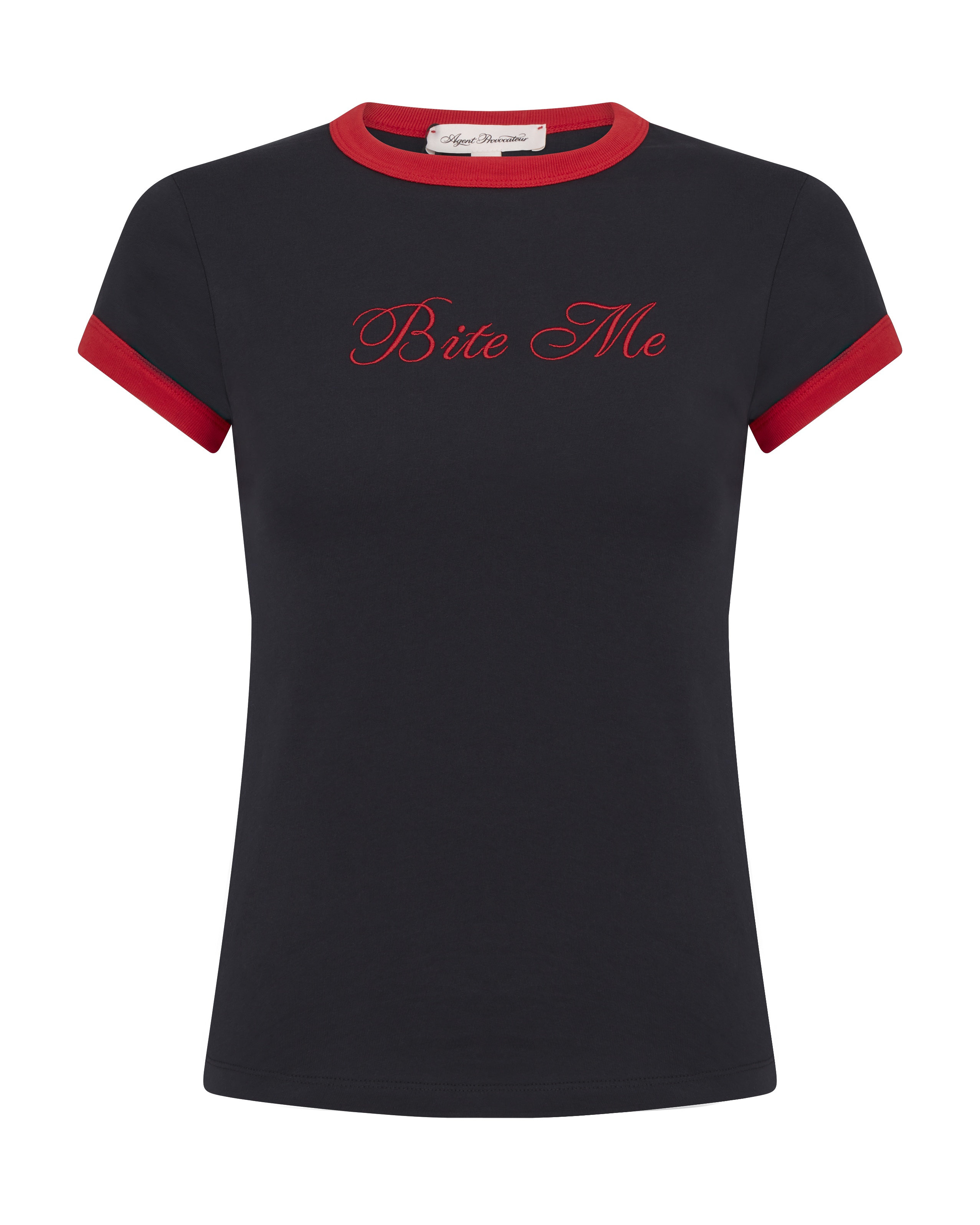 Футболка Bite Me черного цвета с красной вышивкой на груди. Мягкий трикотаж из органического хлопка. Попробуйте надеть вместе с трусами и маской для глаз Bite Me для полного комплекта.