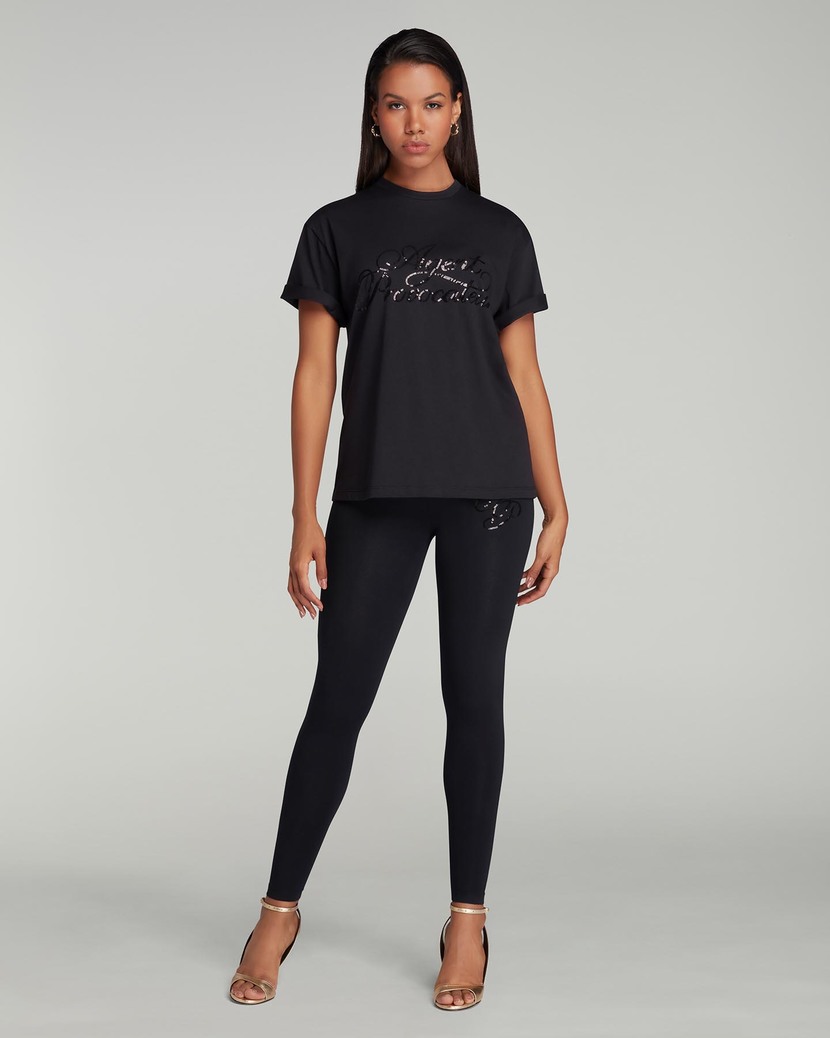 Черная футболка из коллекции Rayley выполнена из эластичного хлопчатобумажного двухслойного трикотажа. Модель прямого кроя с короткими рукавами декорирована однотонным логотипом Agent Provocateur на груди, собранным из пайеток. Расслабьтесь уютным вечером, надев полный комплект Rayley.
