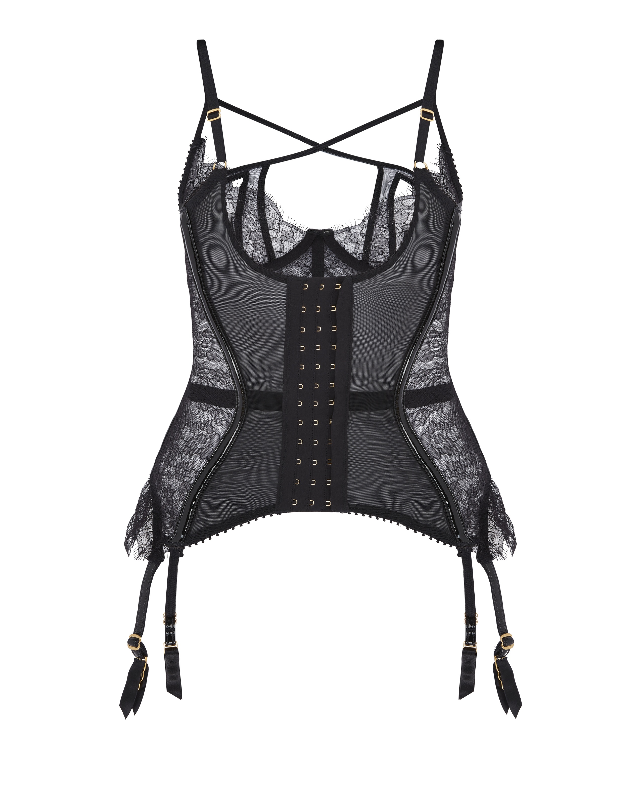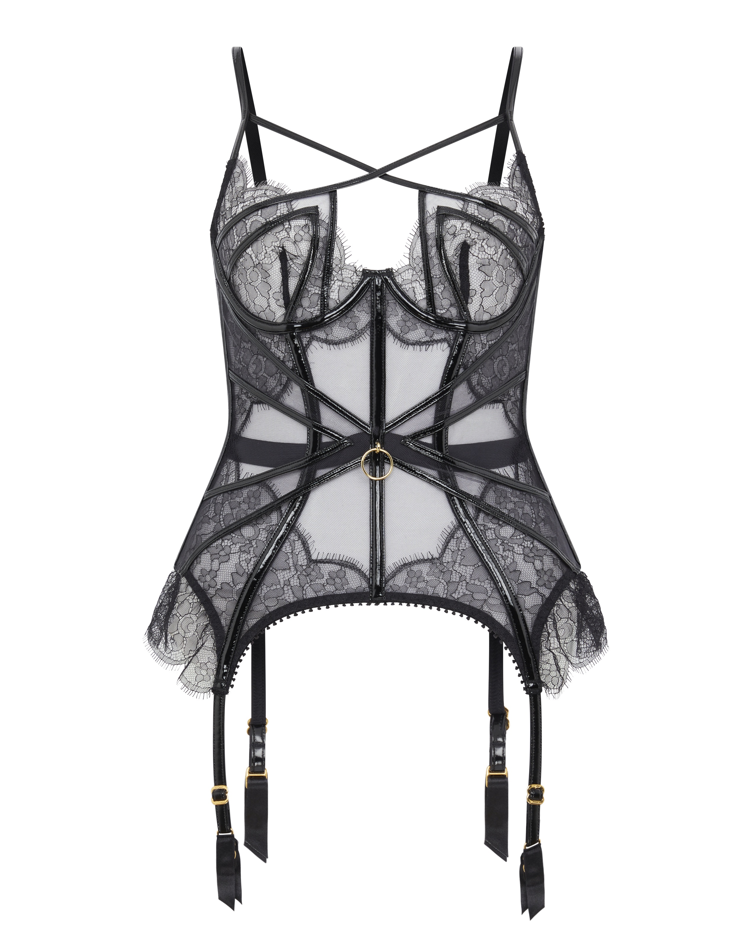 В коллекции Foxie представлена черная грация, которая украшена глянцевыми ремнями из ПВХ и дополнена нашивками из цветочного кружева Leavers. Украшениями модели служат крупное кольцо на талии, оборки из резинки и фурнитура с покрытием из настоящего золота. Комбинация с другими изделиями из серии Foxie обеспечивает создание эффектного ансамбля.