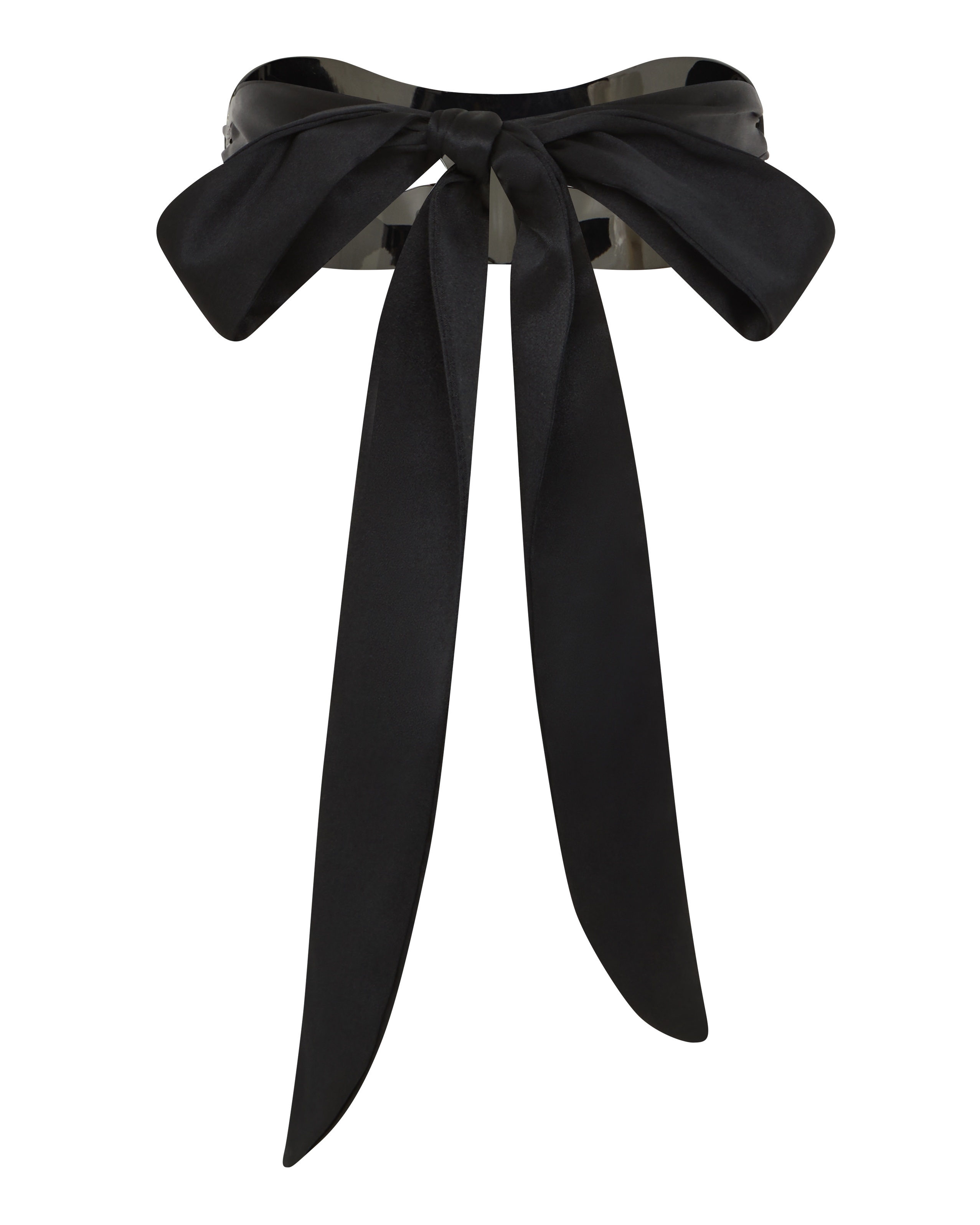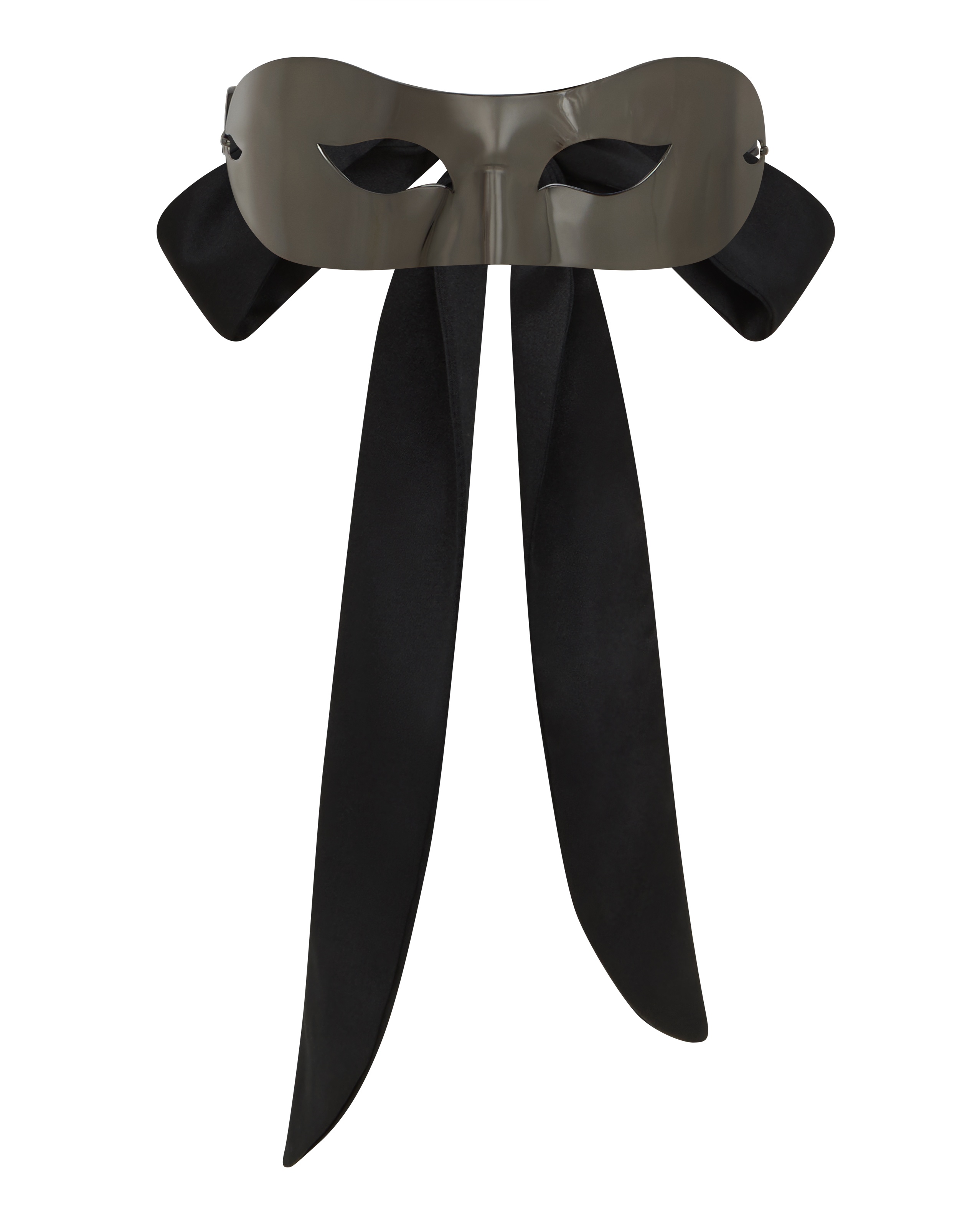 Черная маска Melody: таинственный аксессуар, который можно изогнуть для безупречной посадки. Роскошные атласные завязки и фирменные детали обеспечивают надежную фиксацию.