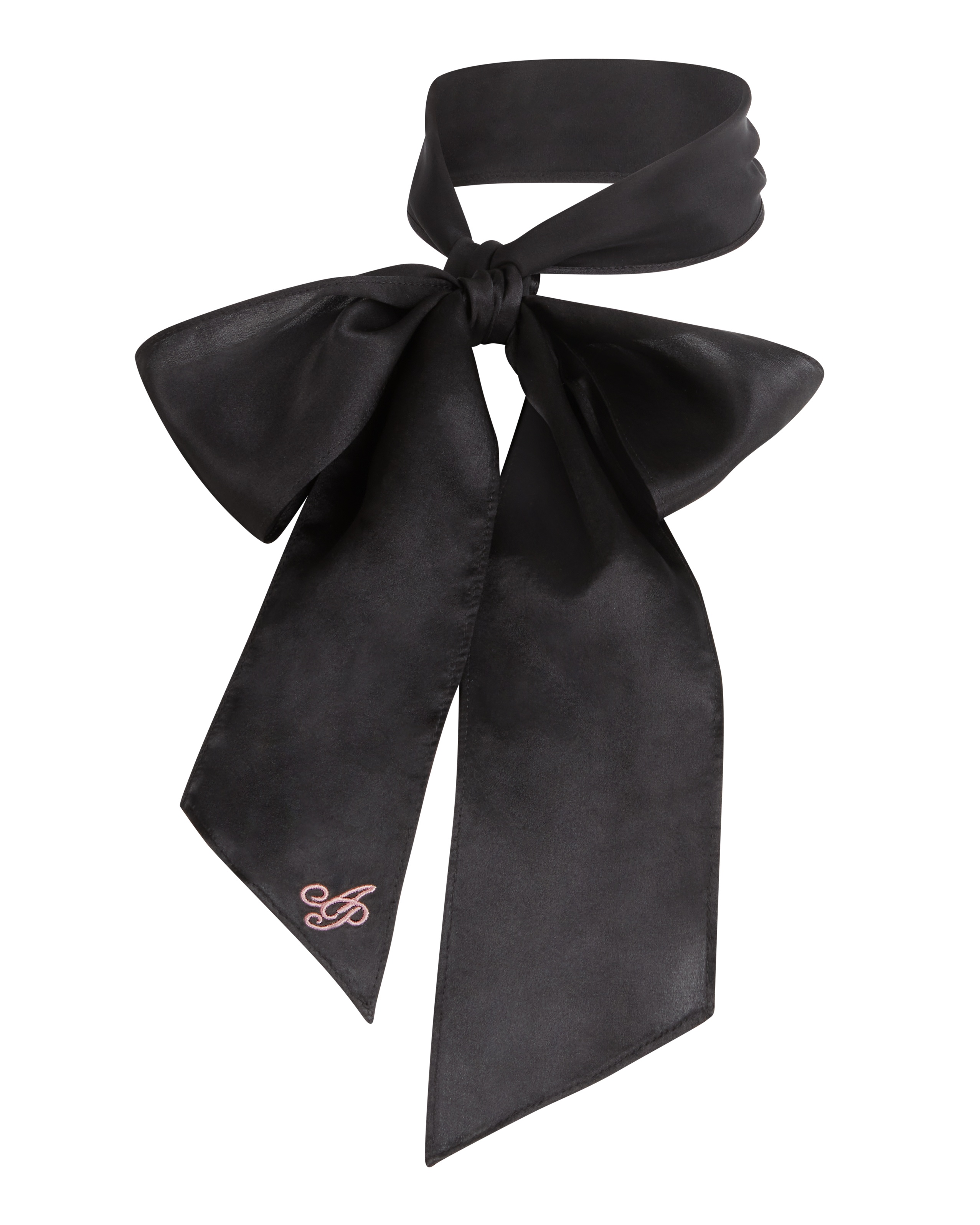 Черная маска Nikita: длинный шарф из шелкового атласа с розовой вышивкой AP. Идеальный аксессуар к комплекту Nikita или любимому маленькому черному платью Agent Provocateur.