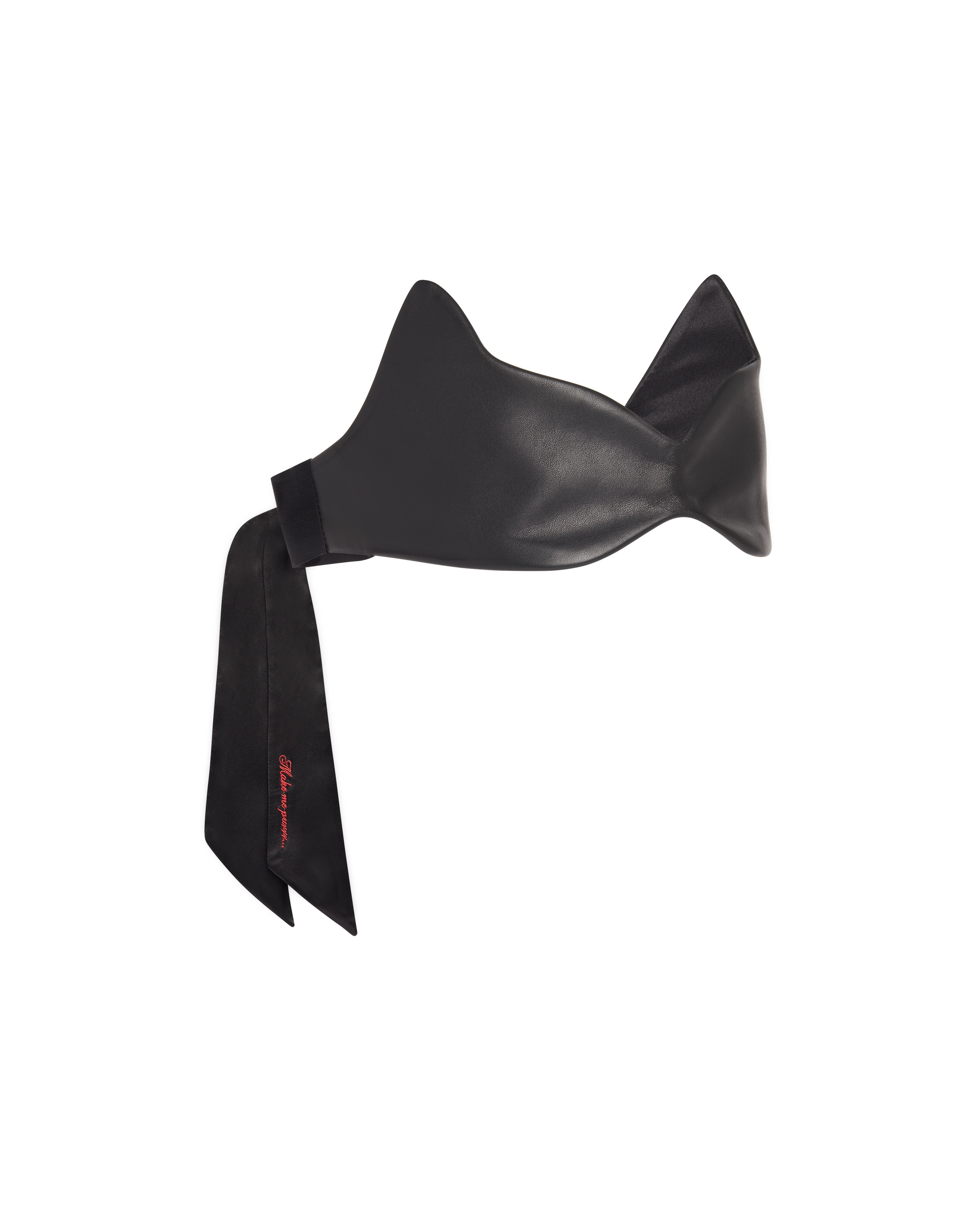 Маска Stormer выполнена в форме кошачьей маски и изготовлена из матовой кожи с шелковой подкладкой. Черные шелковые завязки украшены вышивкой "Make Me Purrr" красного цвета на конце одной из лент. Попробуйте сочетать её с изделиями из коллекции Kitykat для создания игривого и соблазнительного образа.