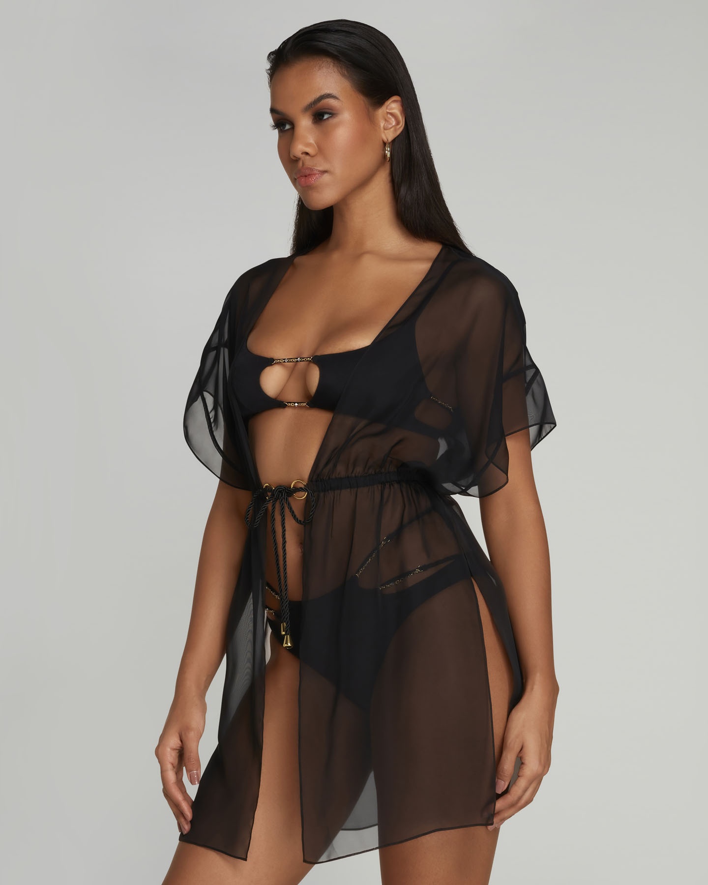 Короткая пляжная накидка Evelyn выполнена черном цвете. Модель дополнена шелковистыми завязками на талии и золотистой фурнитурой. Носите поверх вашего любимого купальника или бикини от Agent Provocateur для создания неповторимого и стильного образа на пляже.