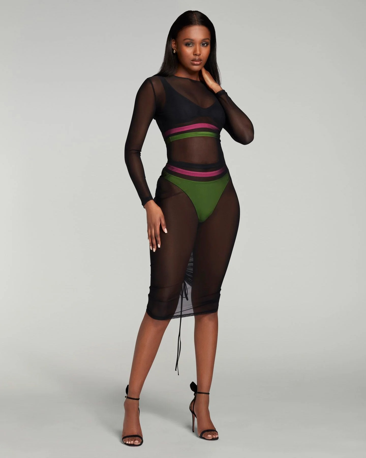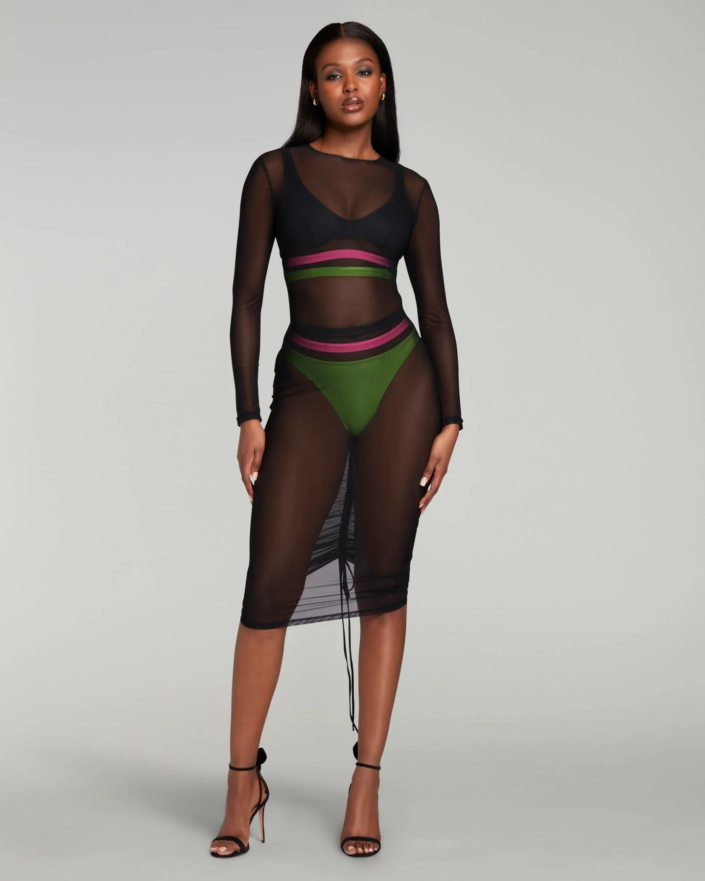 Черное платье-накидка пошито из прозрачного эластичного тюля. Длину облегающей модели можно регулировать с помощью шнурка по центру спины. Идеальное дополнение пляжного образа с любым купальником АР.