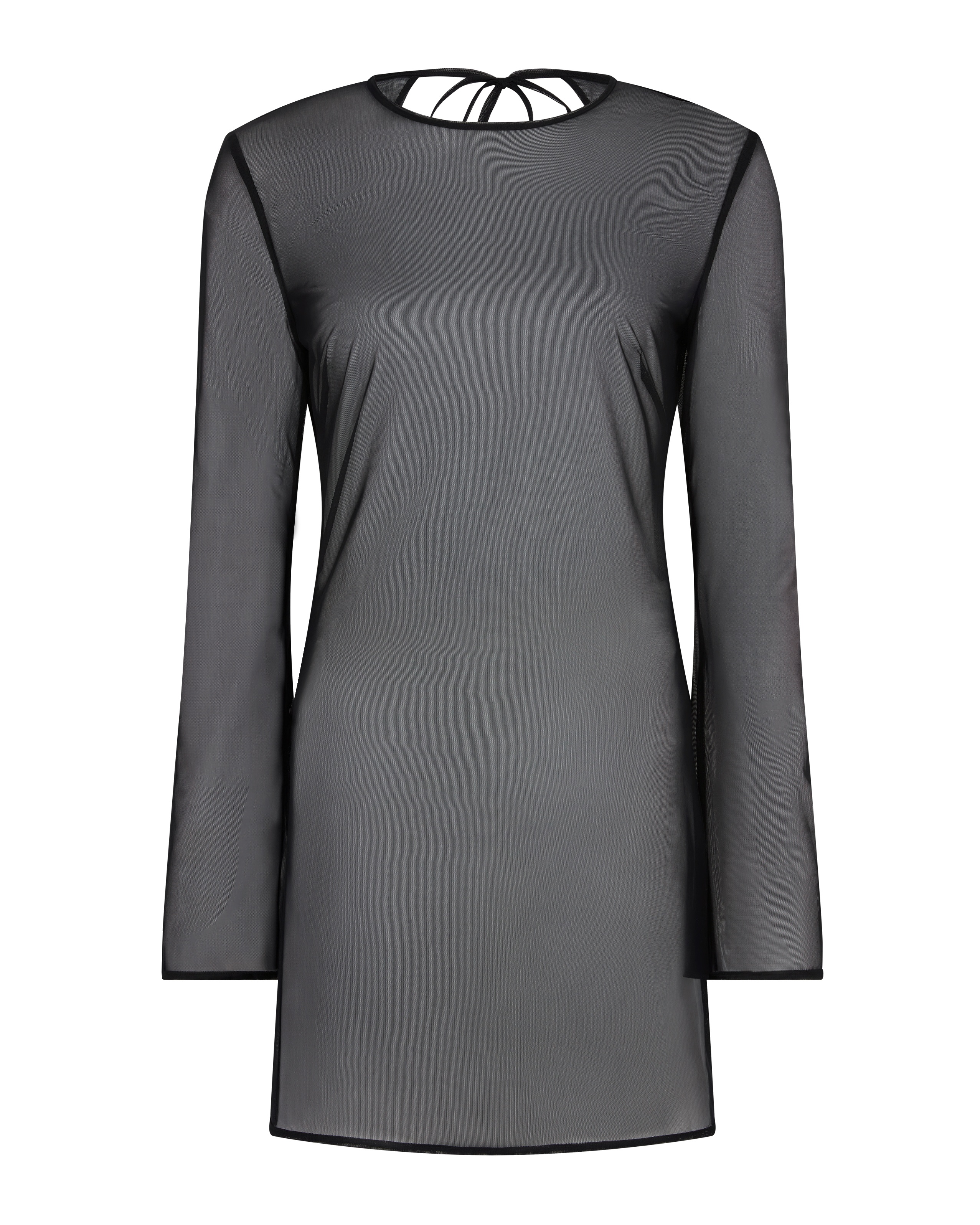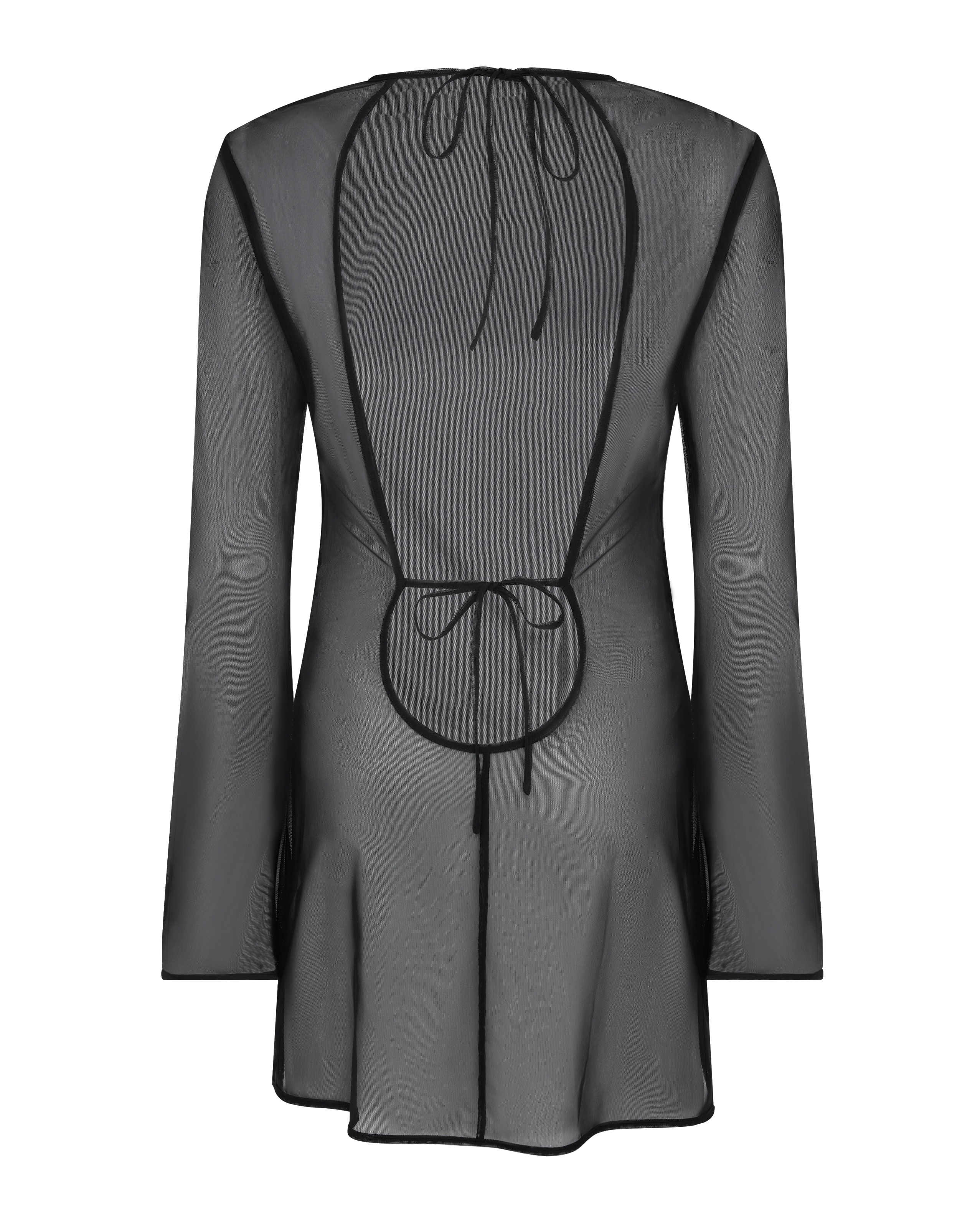 Черное платье-накидка для пляжа Zia с легкой посадкой и полупрозрачной фактурой. Эластичный тюль мягко подчеркивает силуэт и легко сочетается с купальниками.