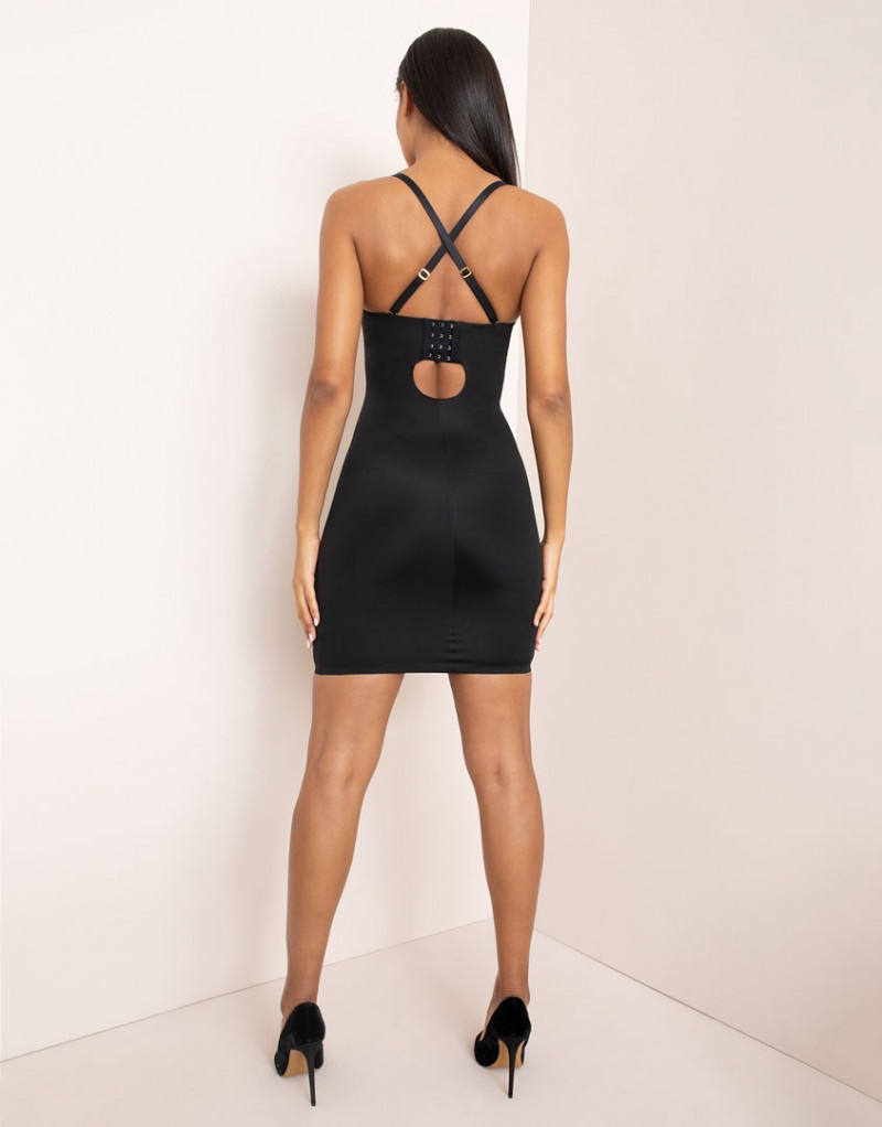 Встречайте Dion - современную классику, созданную для того, чтобы сделать ваш силуэт идеальным. Черная гладкая сорочка лаконичной формы с глубоким декольте дополнена косточками и формованными чашечками. Сочетайте с другими моделями коллекции или носите отдельно как маленькое черное платье.