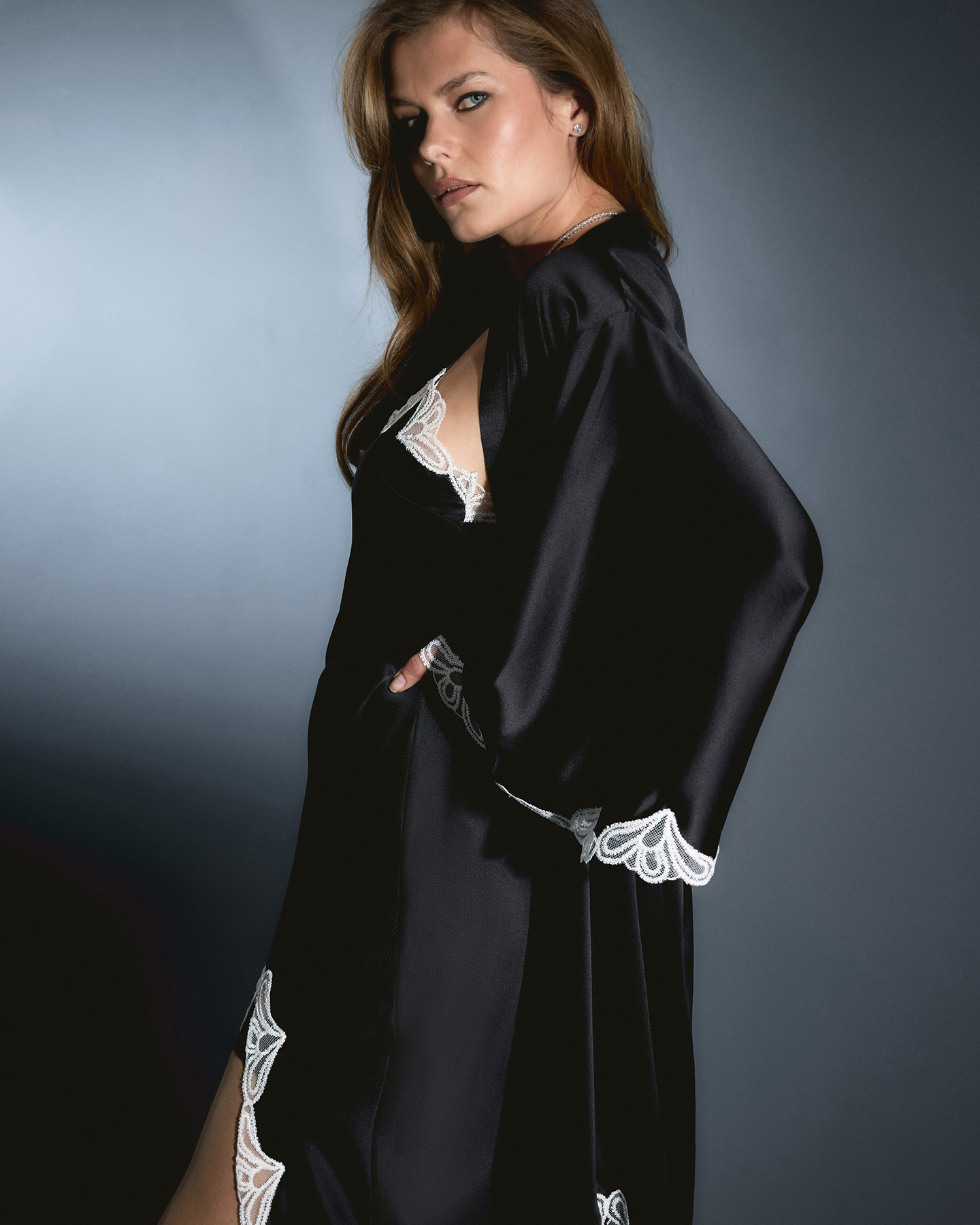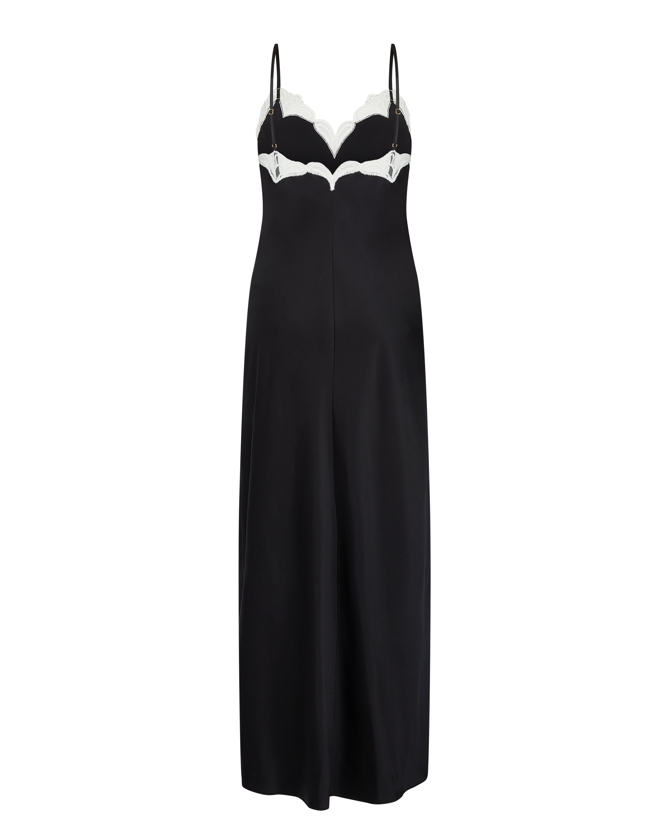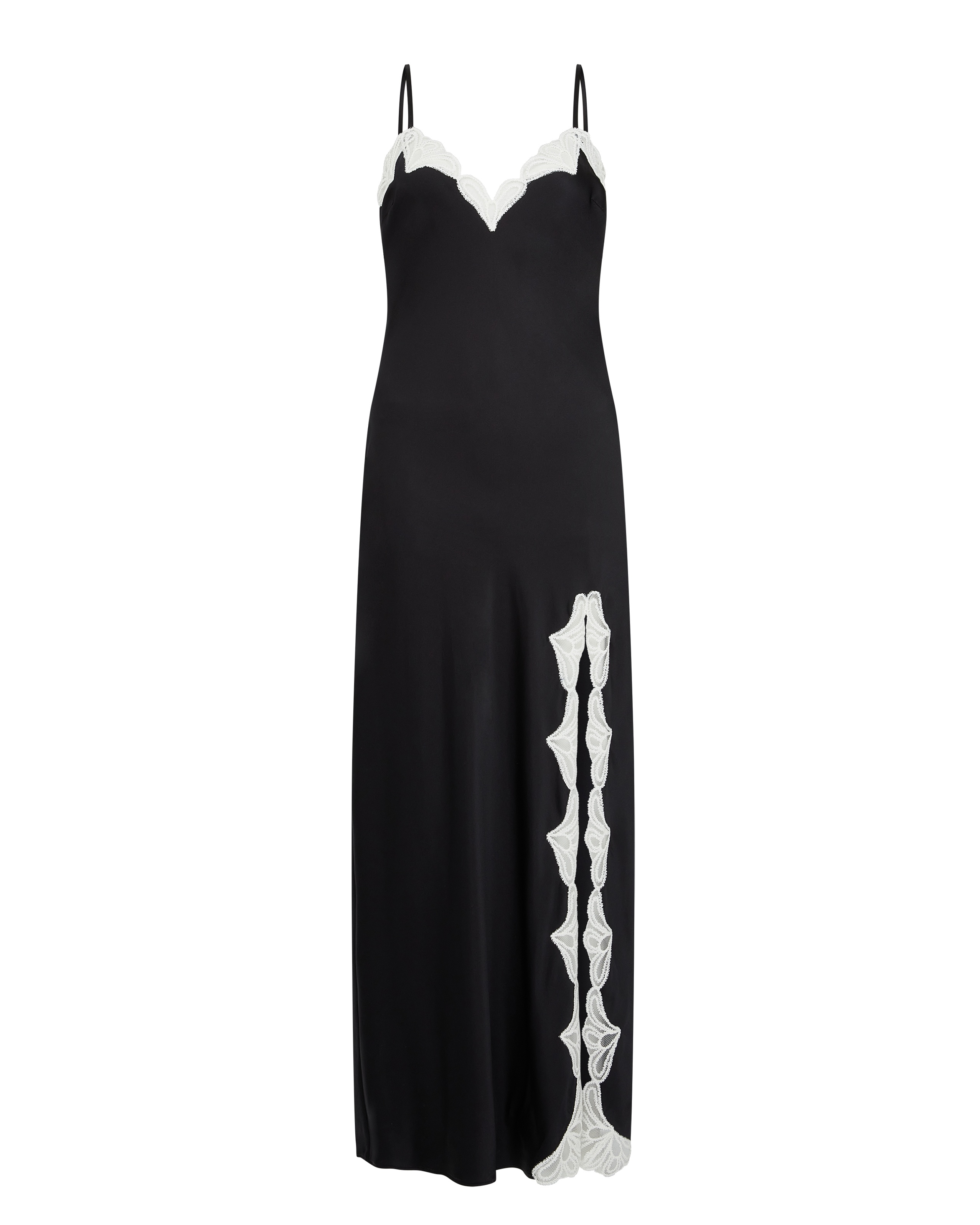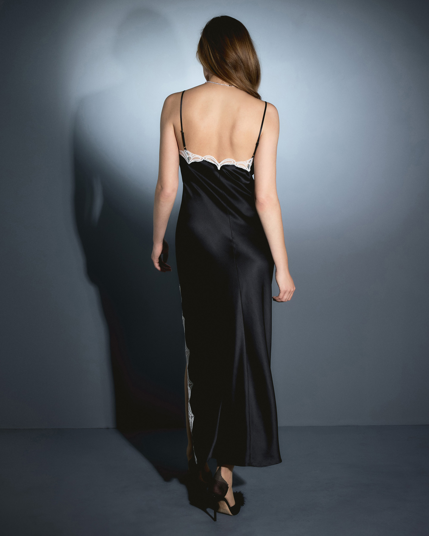 Черная сорочка Nelle: мягкий атлас, тонкие бретели, золотая фурнитура и контрастная вышивка. Независимо от ваших планов, эта сорочка создана для вечеров, полных интриги.