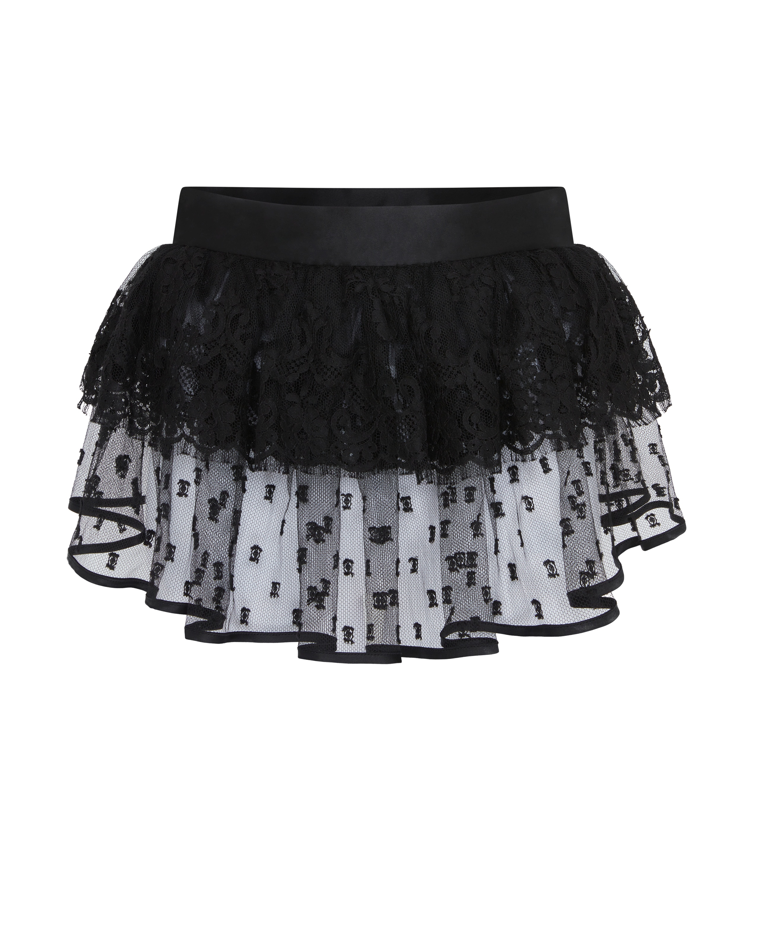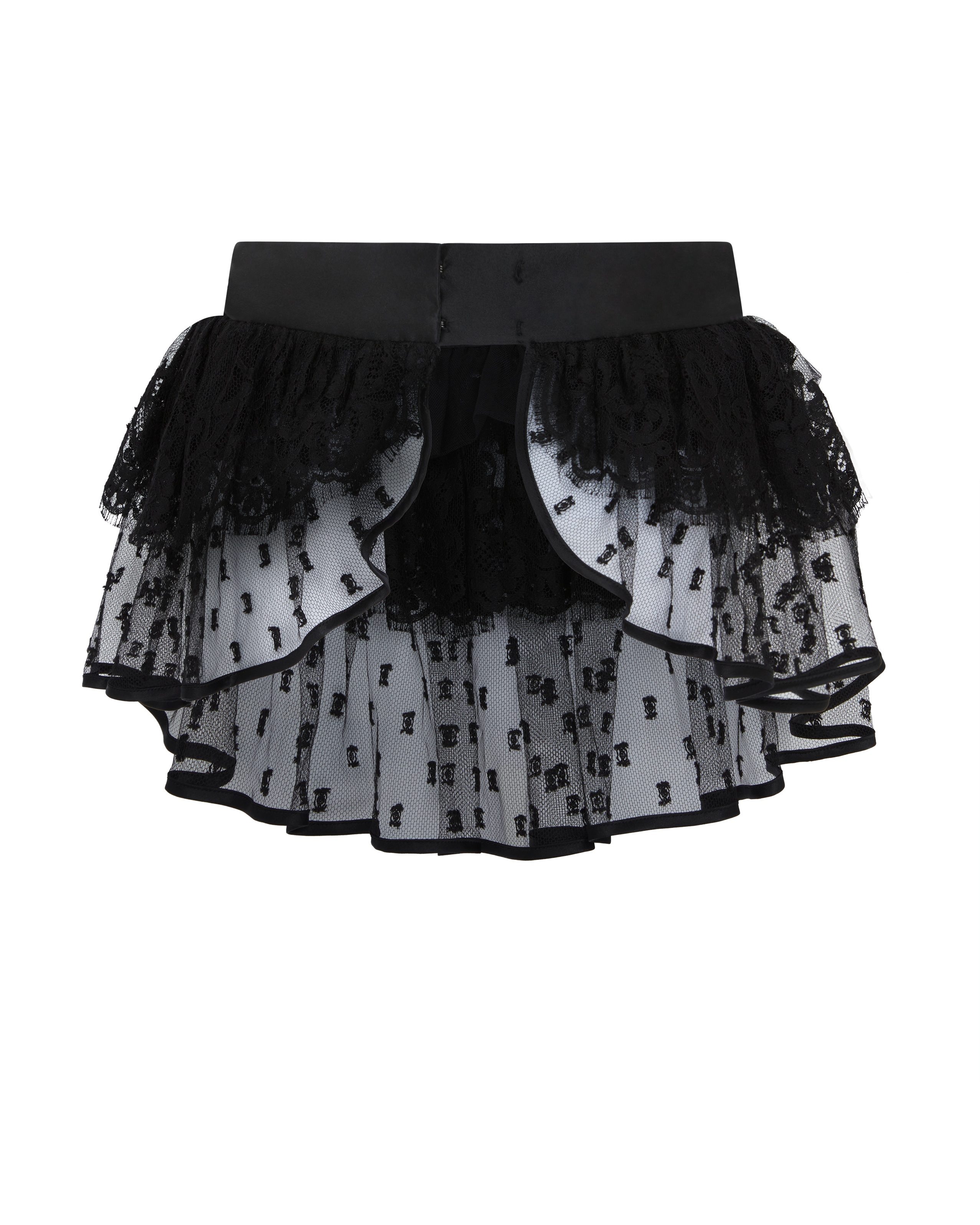 Юбка-баска Lovella черного цвета создана из слоев изысканного французского кружева. Шелковая окантовка пояса и низа подола, а также застежки на пуговицы спереди придают модели винтажный флер.