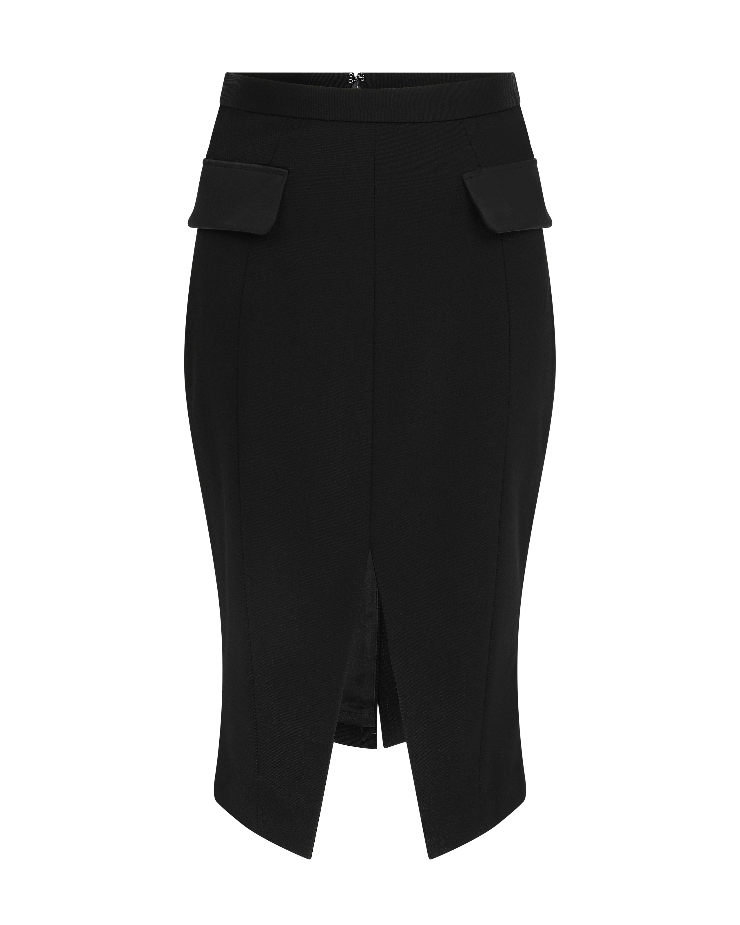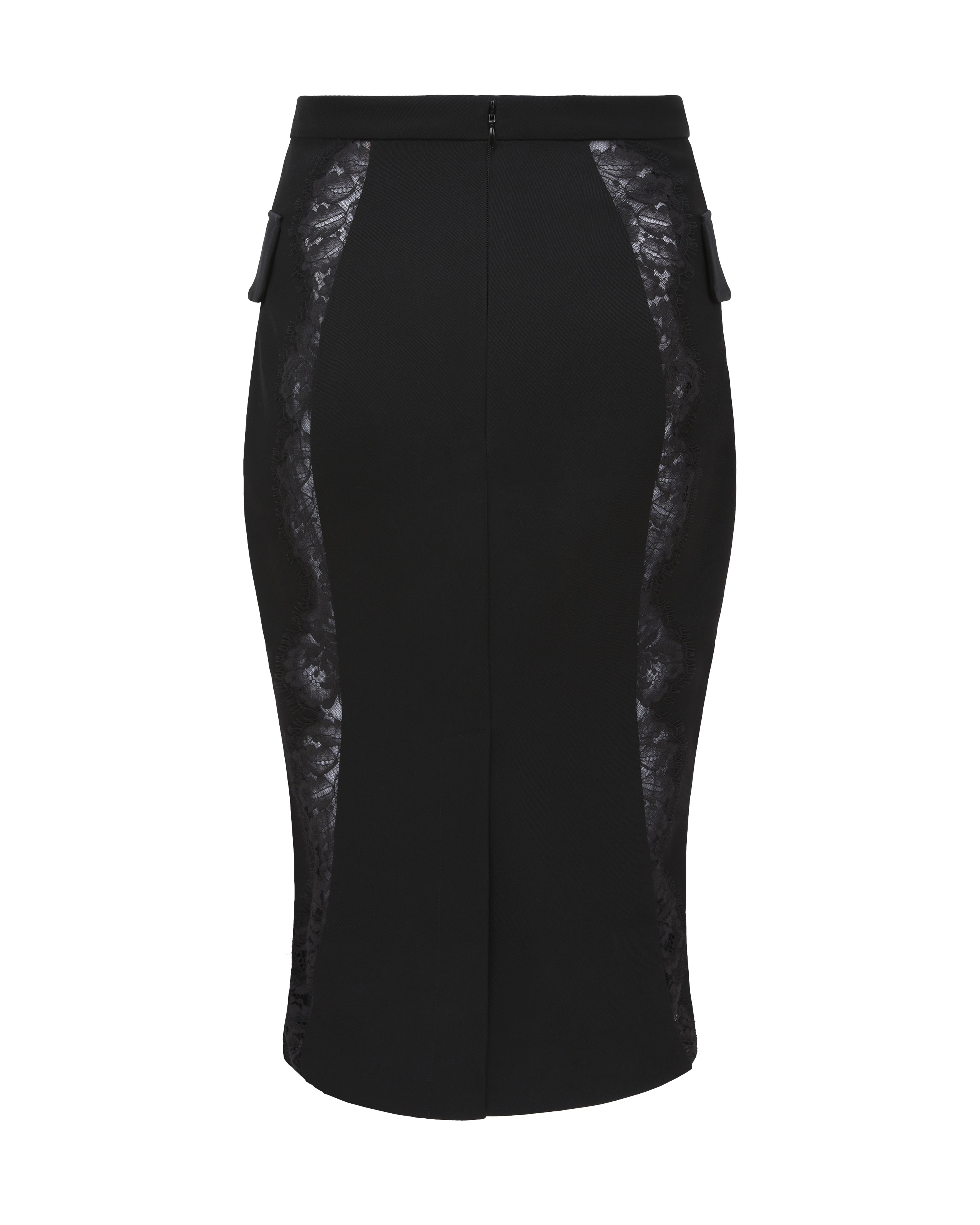 Юбка-карандаш Julietta черного цвета выполнена из шелкового атласа с декоративными фальш-карманами. Ажурные вставки из кружева Leavers по бокам добавляют пикантности, а скрытая молния сзади сохраняет безупречный крой. Атласный пояс, шелковая подкладка, разрез спереди и шлица сзади обеспечивают комфорт движений.