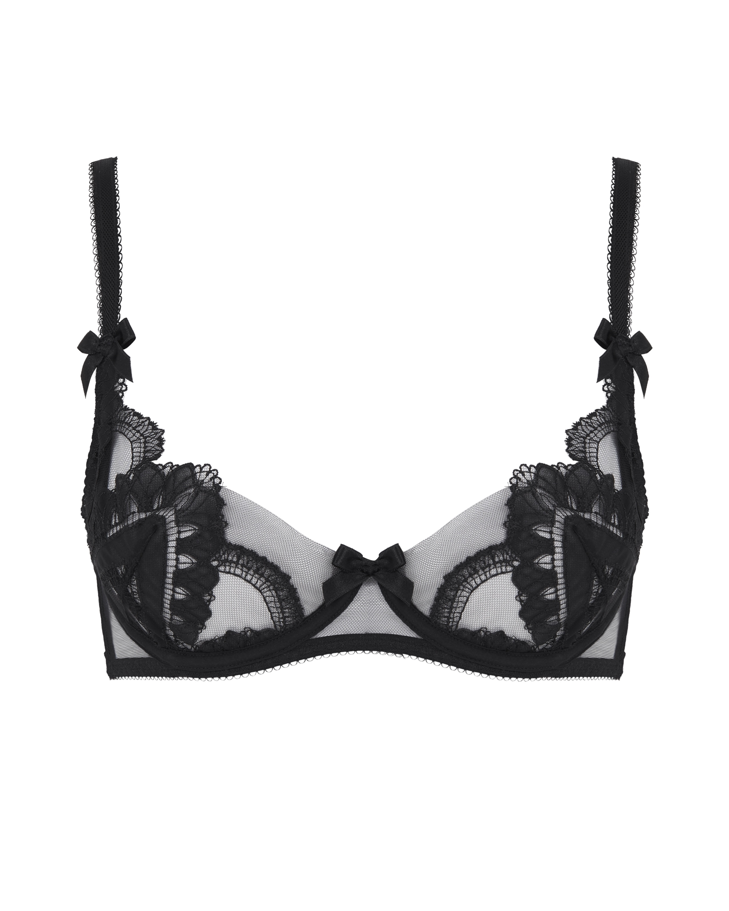 Бюстгальтер балконет Alysia черного цвета с глубоким декольте и вышивкой. Внутренние косточки по бокам обеспечивают поддержку, схожую с корсетом. Ленты и бретели украшены изящной резинкой Picot. Вышивка выполнена лазерной техникой на швейцарском тюле. Металлическая фурнитура покрыта золотом. Рекомендуется носить с элементами той же серии Alysia для завершенности образа.