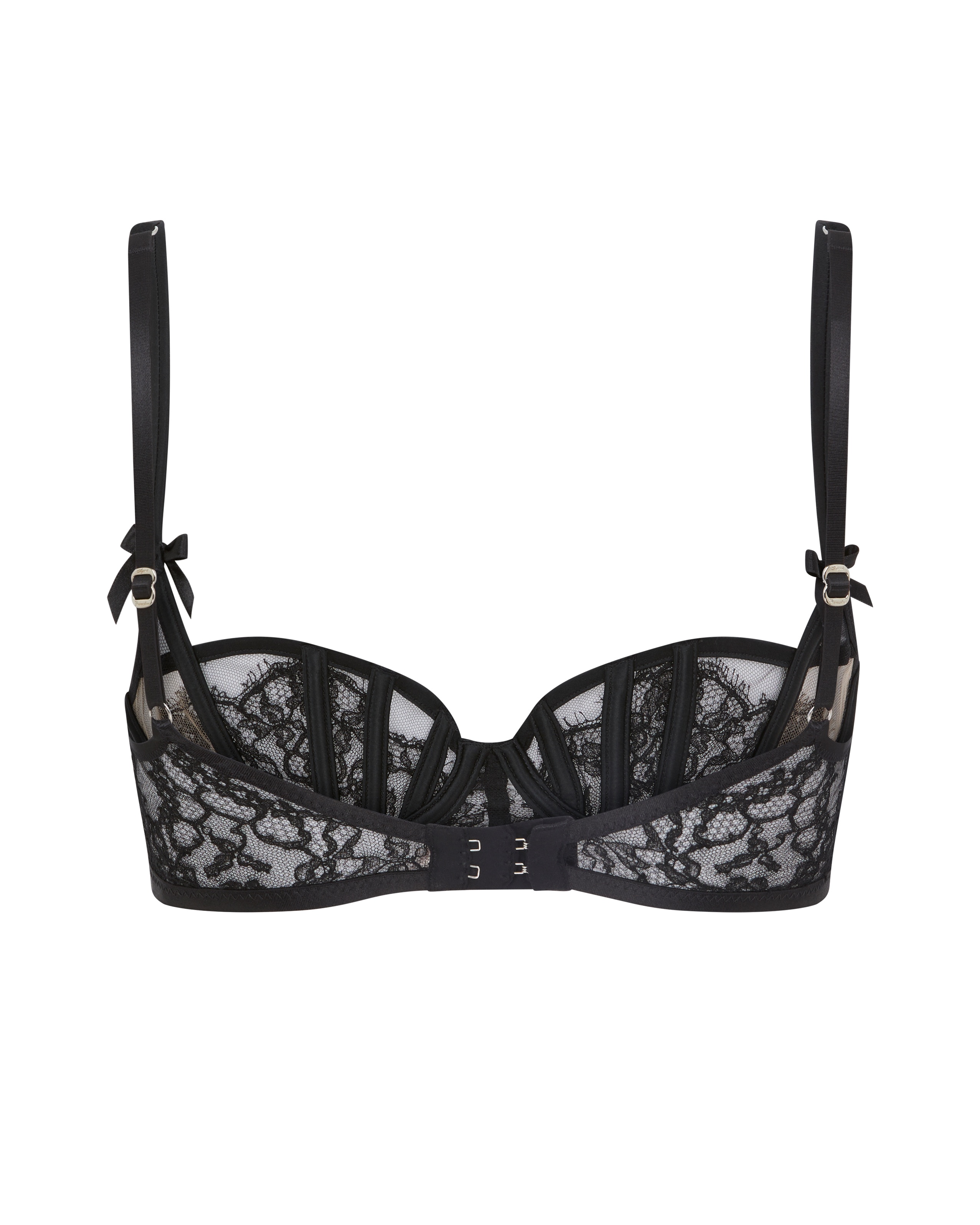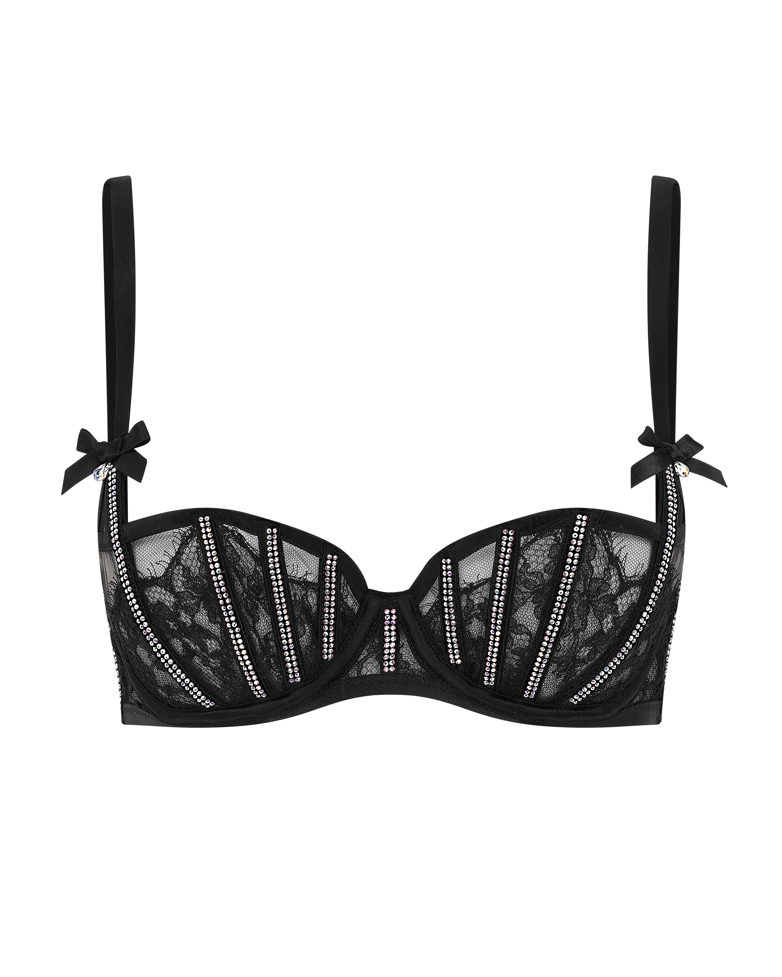 В коллекции Caitriona черный бюстгальтер балконет сочетает французское кружево Leavers, тонкую итальянскую сетку и шелковые вставки. Кристаллы Swarovski® на бретелях и косточках добавляют блеска, а приподнимающий крой формирует соблазнительное декольте.
