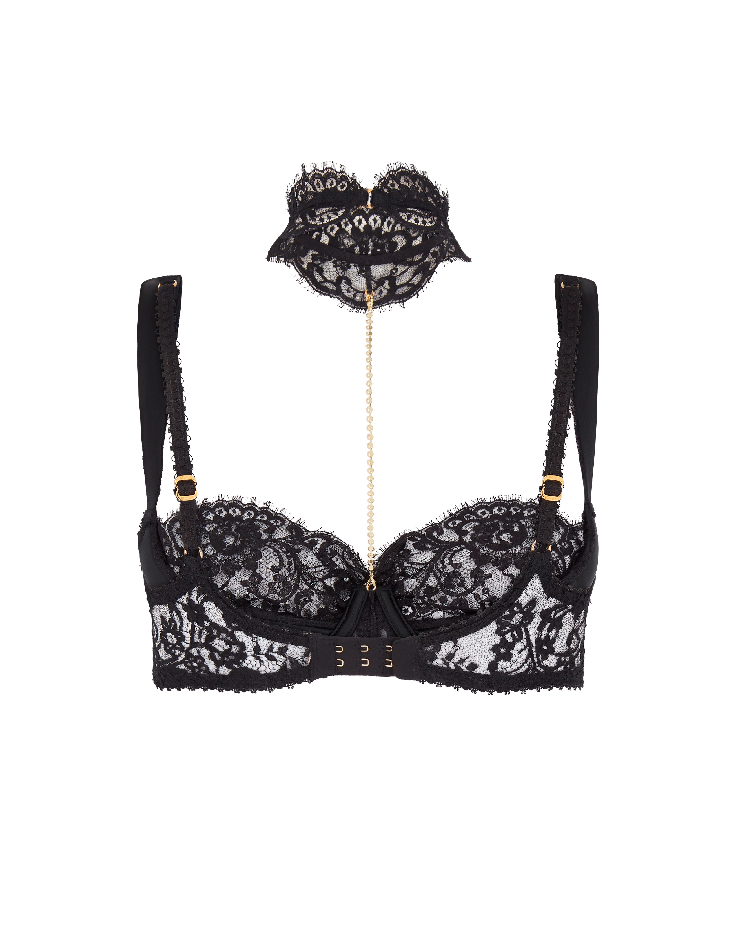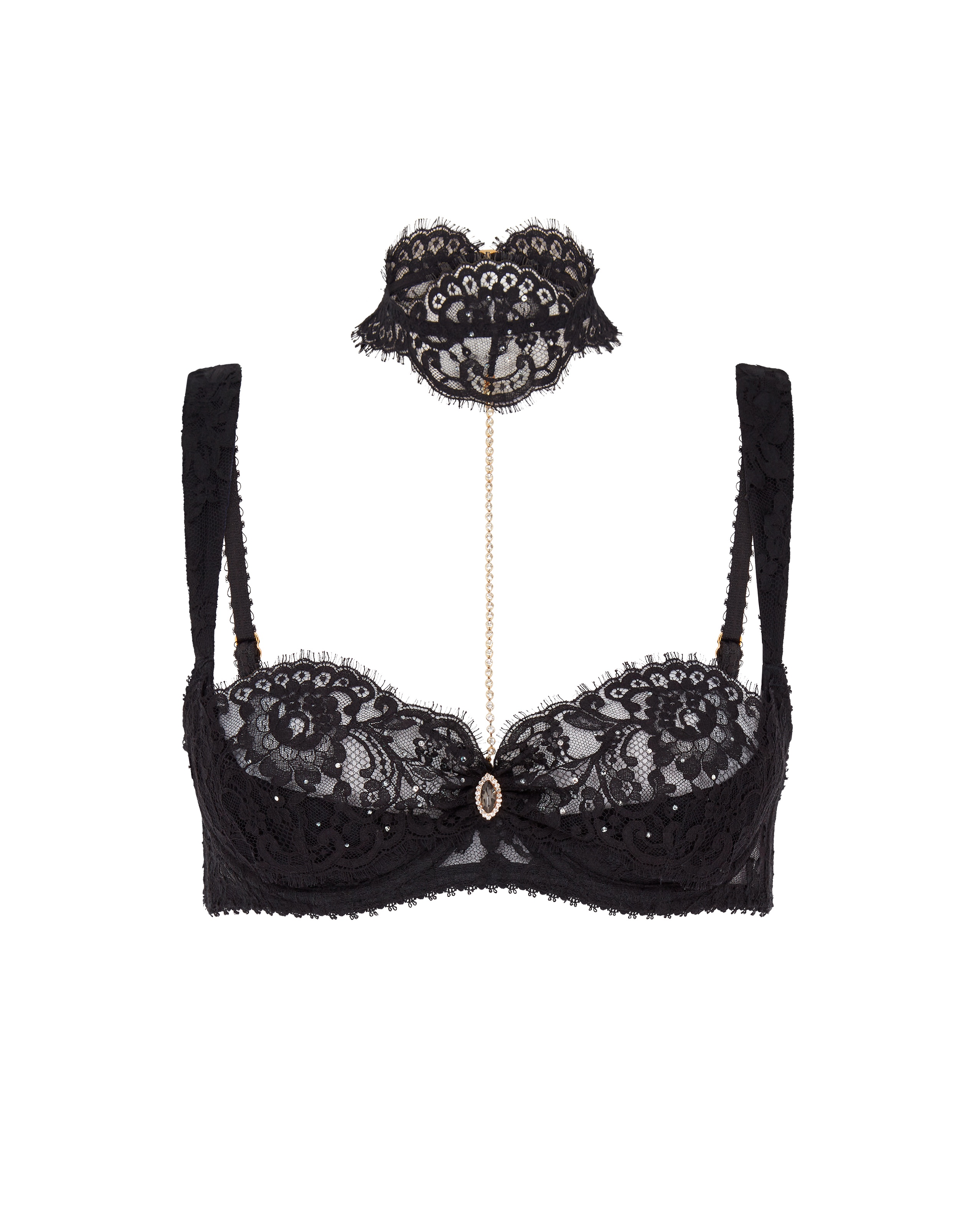Черный бюстгальтер балконет Jewlie с французским кружевом Leavers, дополненным прозрачным тюлем, и шелковыми чашечками, придающими легкий эффект пуш-апа. Съемный чокер и кристальные детали добавляют шарма, а позолоченная фурнитура на бретелях и регулируемая застежка обеспечивают комфорт и идеальную посадку.