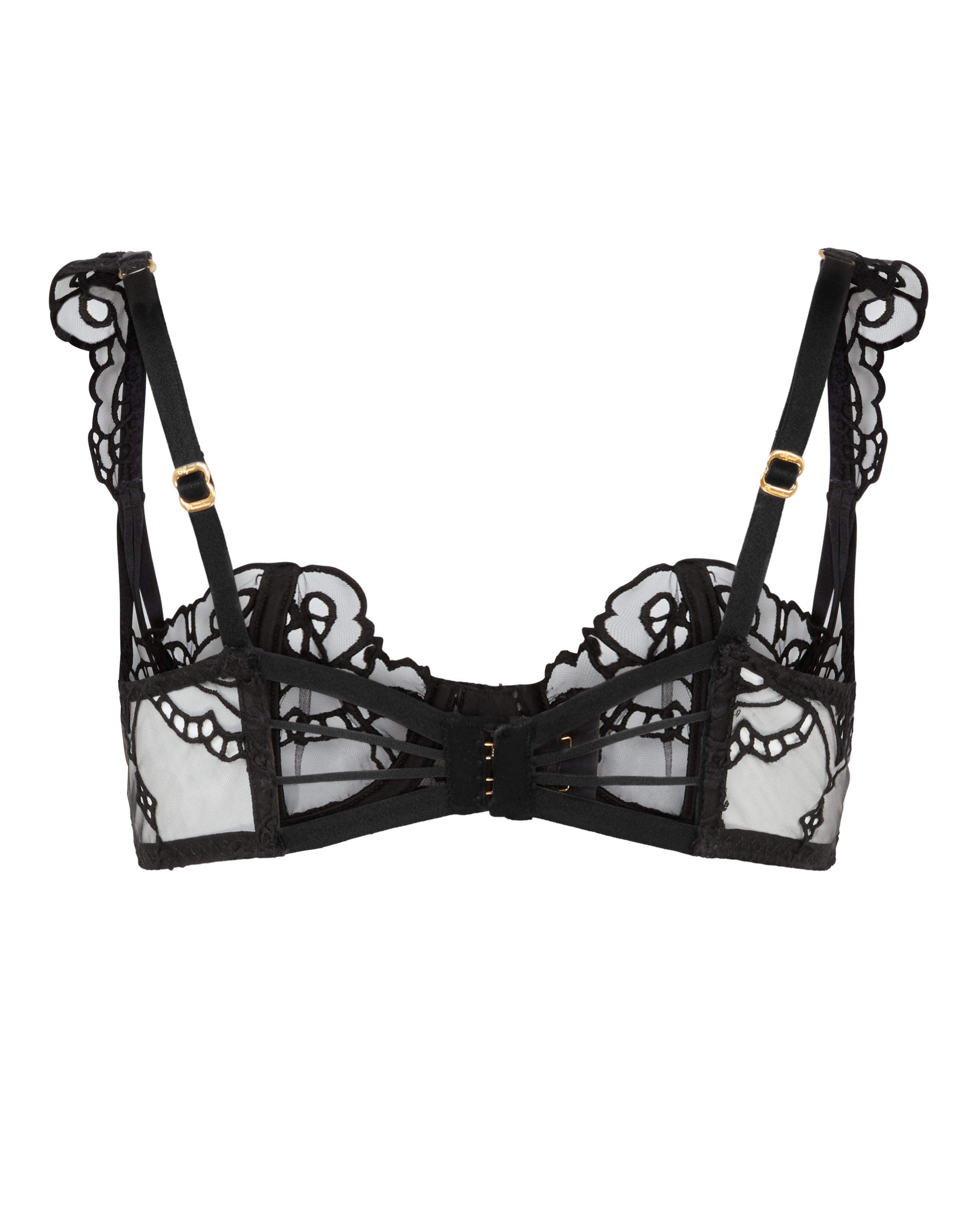Бюстгальтер-балконет Seren черного цвета выполнен на основе итальянского тюля с гипюрной вышивкой. Декоративные пуговицы из кристаллов Swarovski®, косточки и чехлы для проволоки отделаны шелком. Позолоченная фурнитура и ажурная деталь на спинке. Дополните свой гардероб другими предметами коллекции Seren для создания роскошного образа.