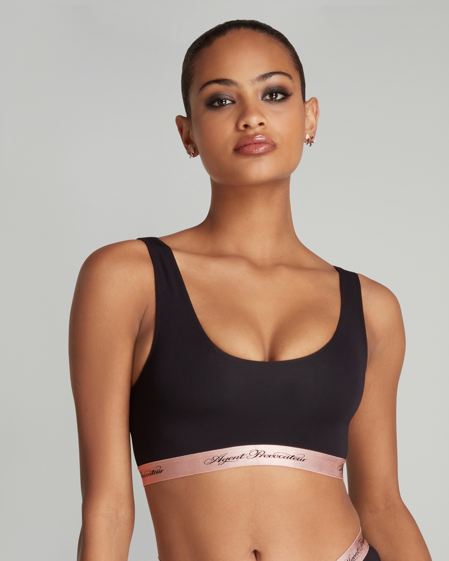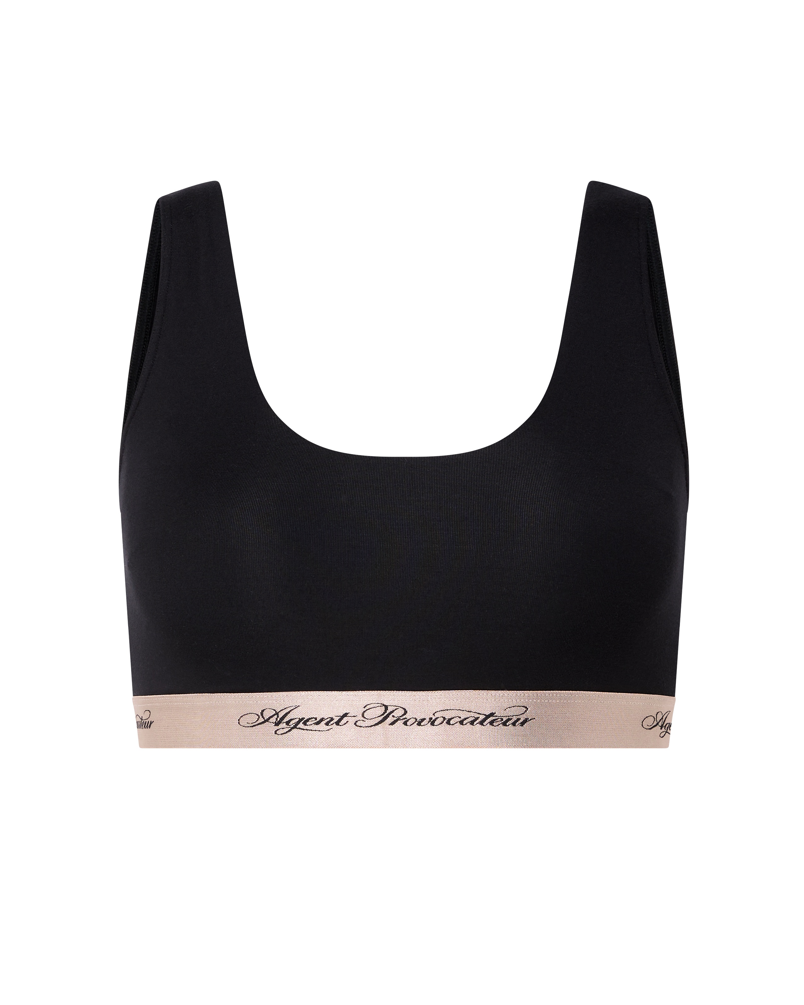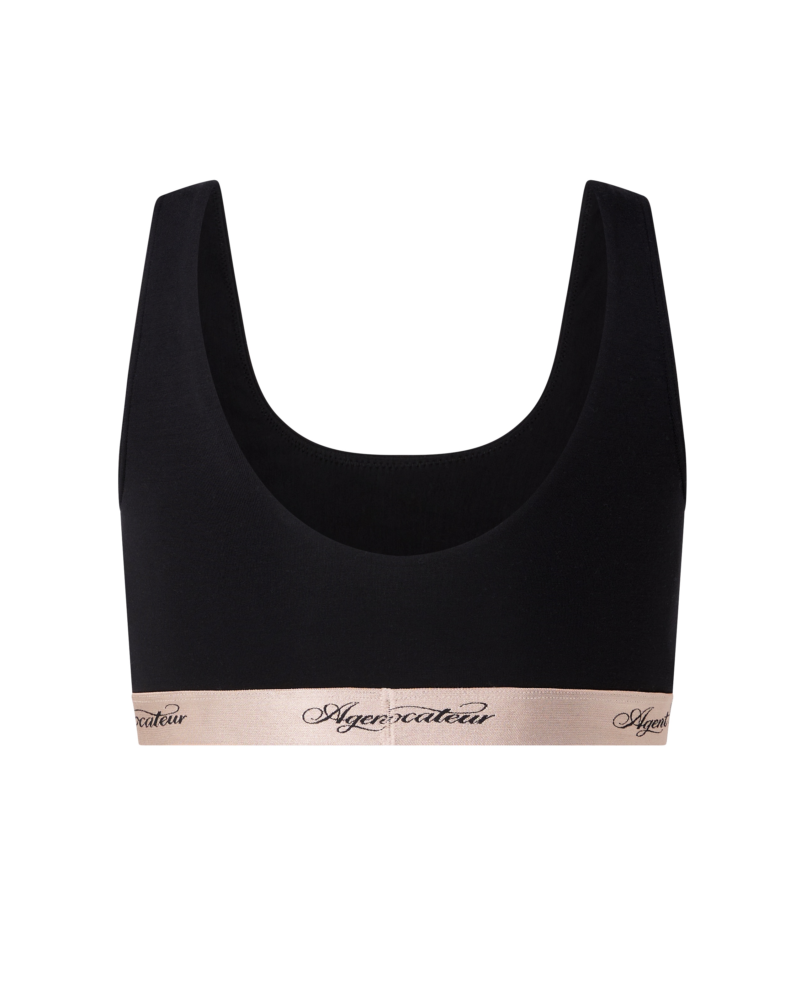 Черный бралет Clea из мягкой модальной ткани с классическим кроем. Нижний край украшен светло-розовой лентой с логотипом AP. Идеальная основа для комплекта с бельем Clea.