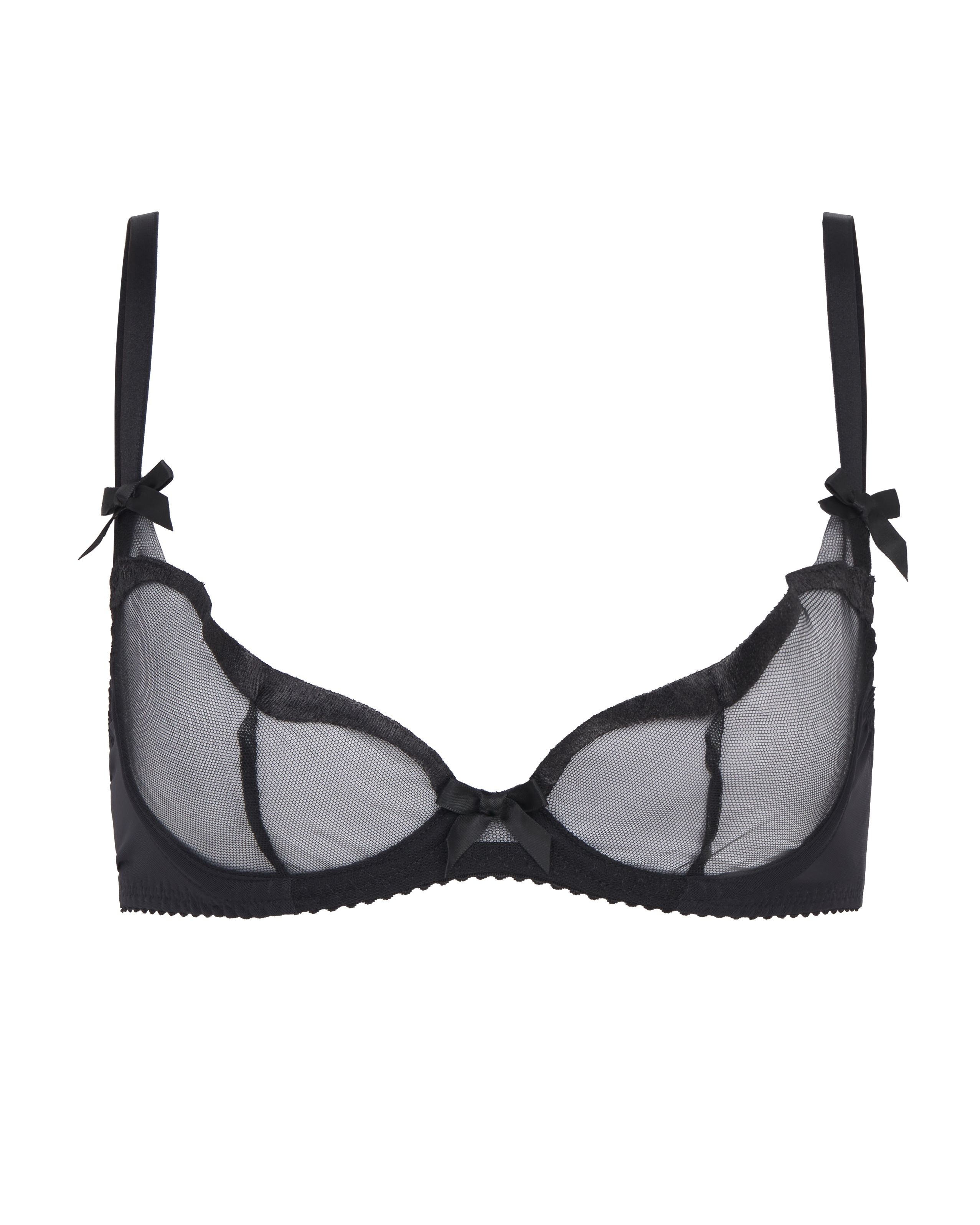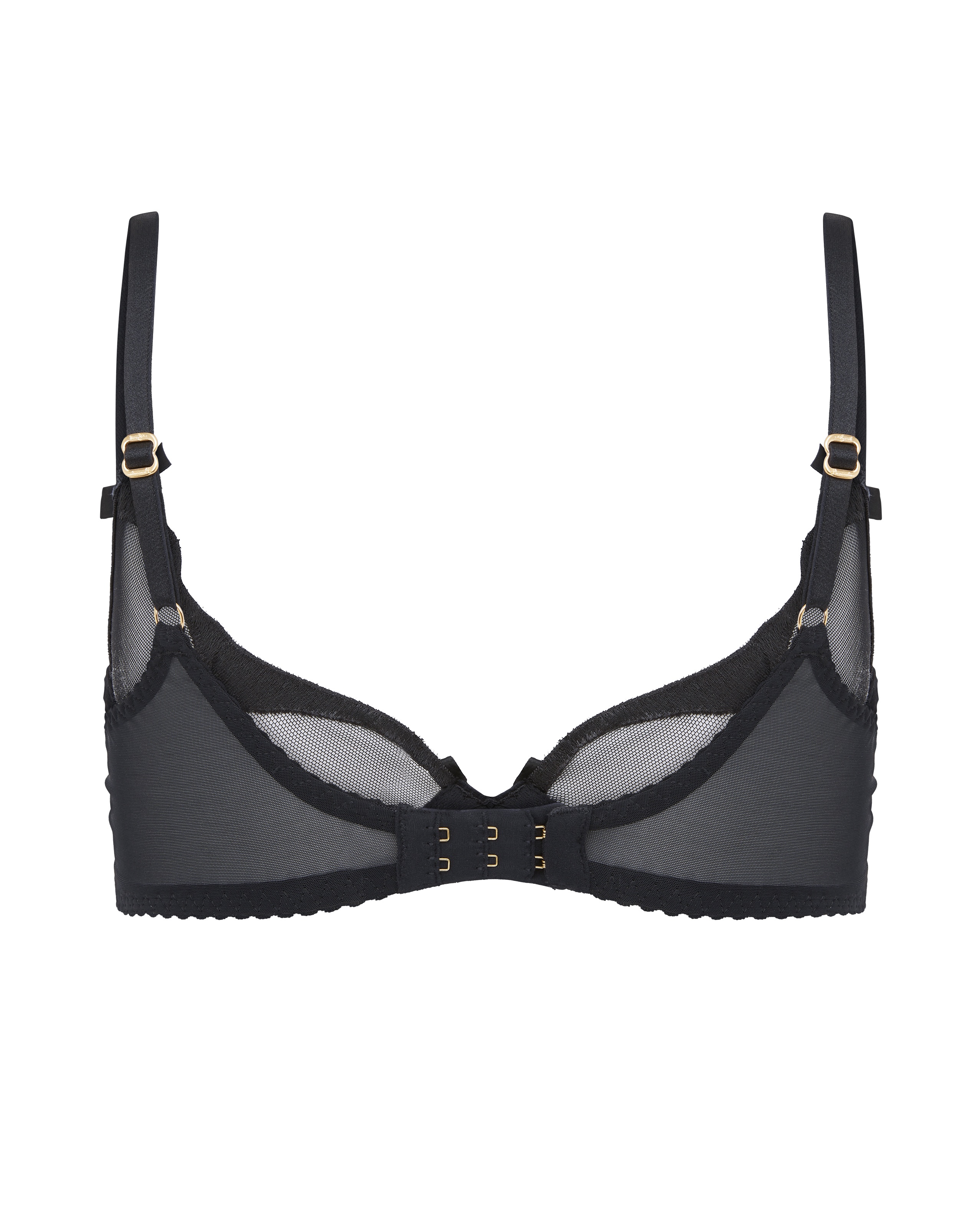 Черный бюстгальтер с декольтированной чашкой Saylor выполнен из прозрачного швейцарского тюля и украшен вышивкой с мокрым блеском, которая подчеркивает контуры декольте. Легкая сетка на крылышках и золотая отделка фурнитуры. Завершите образ другими элементами коллекции Saylor.
