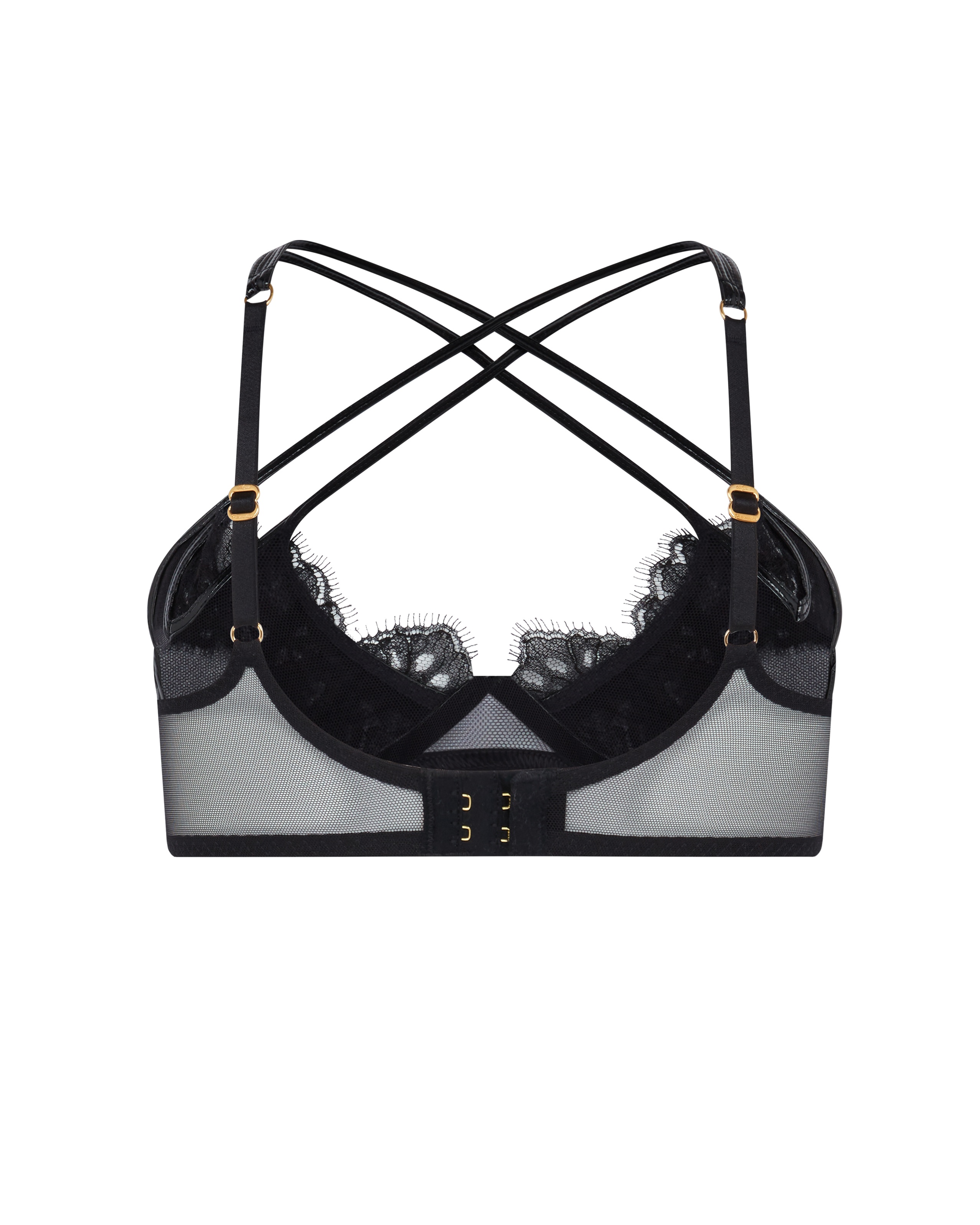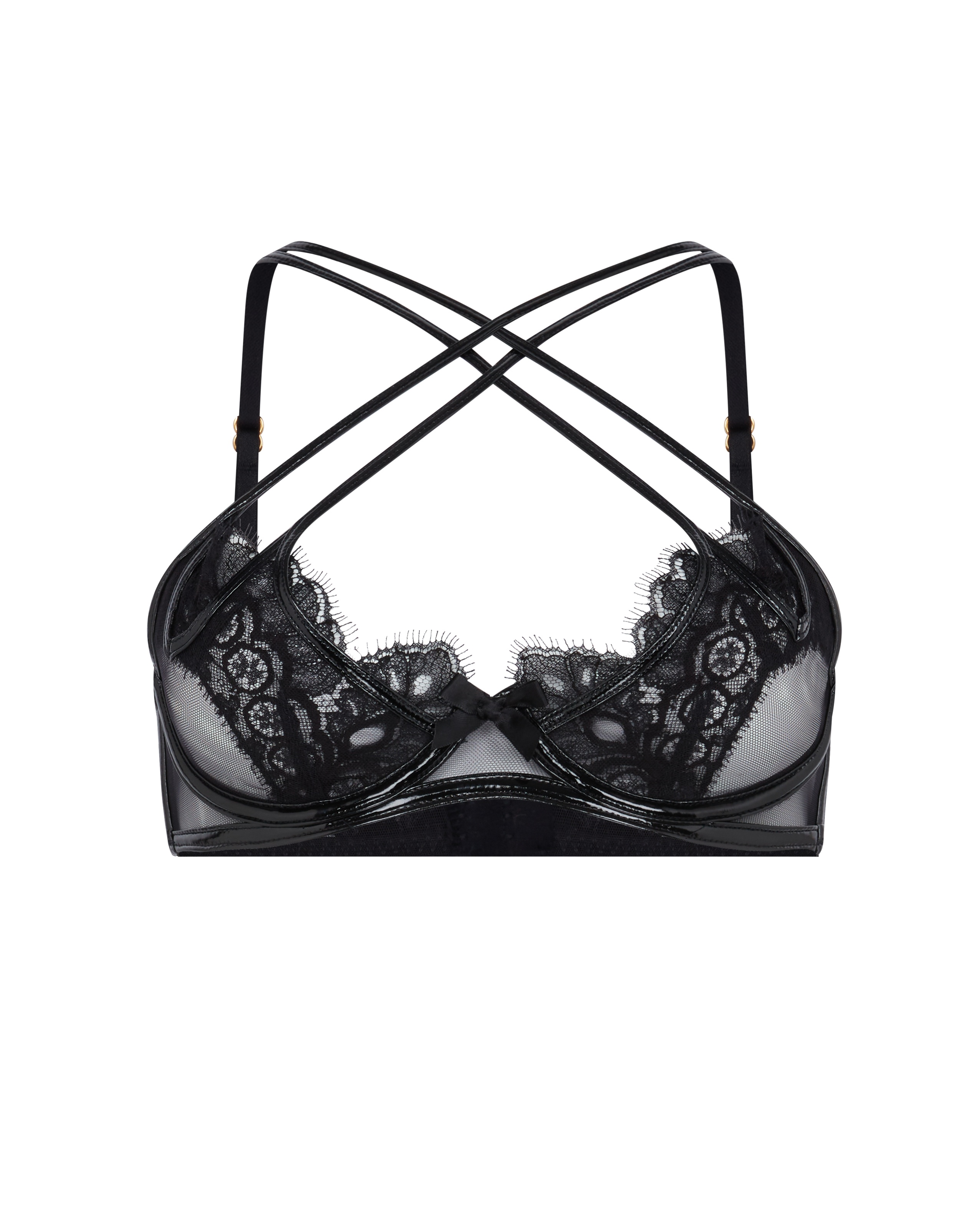 Бюстгальтер Ariella черного цвета с глубоким вырезом имеет внутренние чашки из прозрачного тюля и внешнее покрытие из кружева Leavers. Эластичные стропы из ПВХ перекрещиваются над грудью, создавая эффект высокой горловины. Фурнитура с покрытием из настоящего золота завершает дизайн. Дополните этот смелый бюстгальтер остальными элементами линии Ariella.