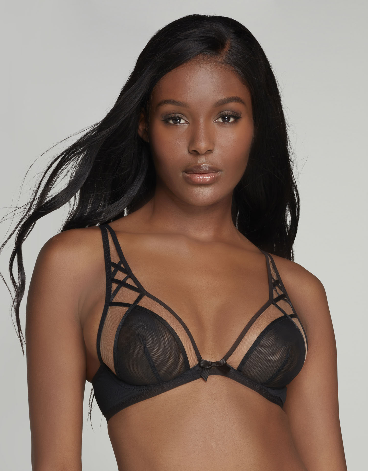 Этот мягкий бюстгальтер на косточках из линии Cherise выполнен из полупрозрачного черного тюля. Верх минималистичных чашек обрамлен иллюзией шнуровки — узнаваемой чертой коллекции. Центр переда украшен классическим атласным бантом.