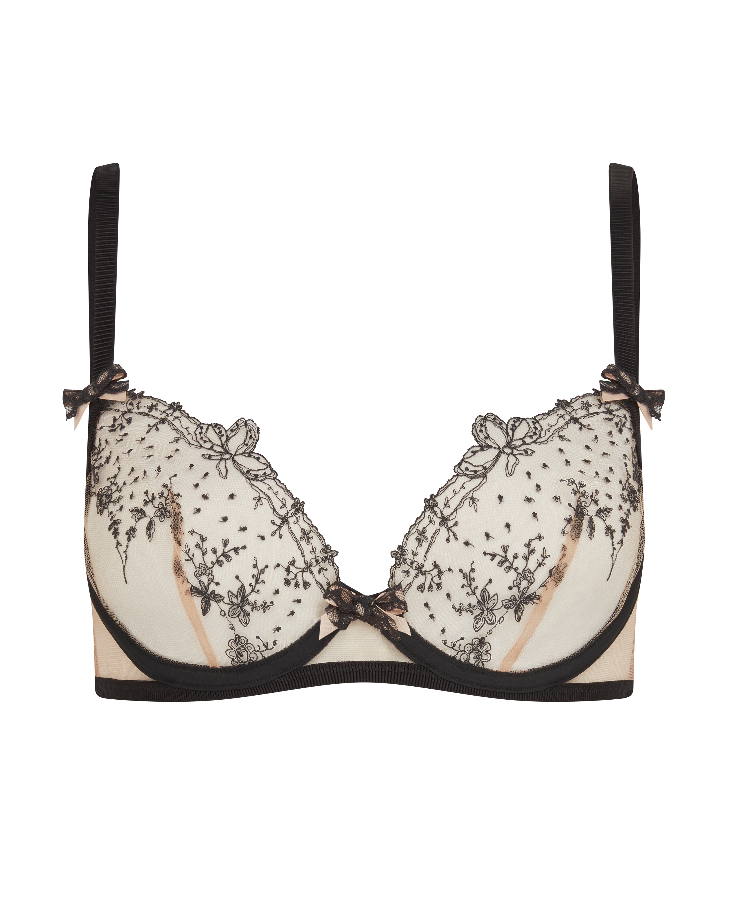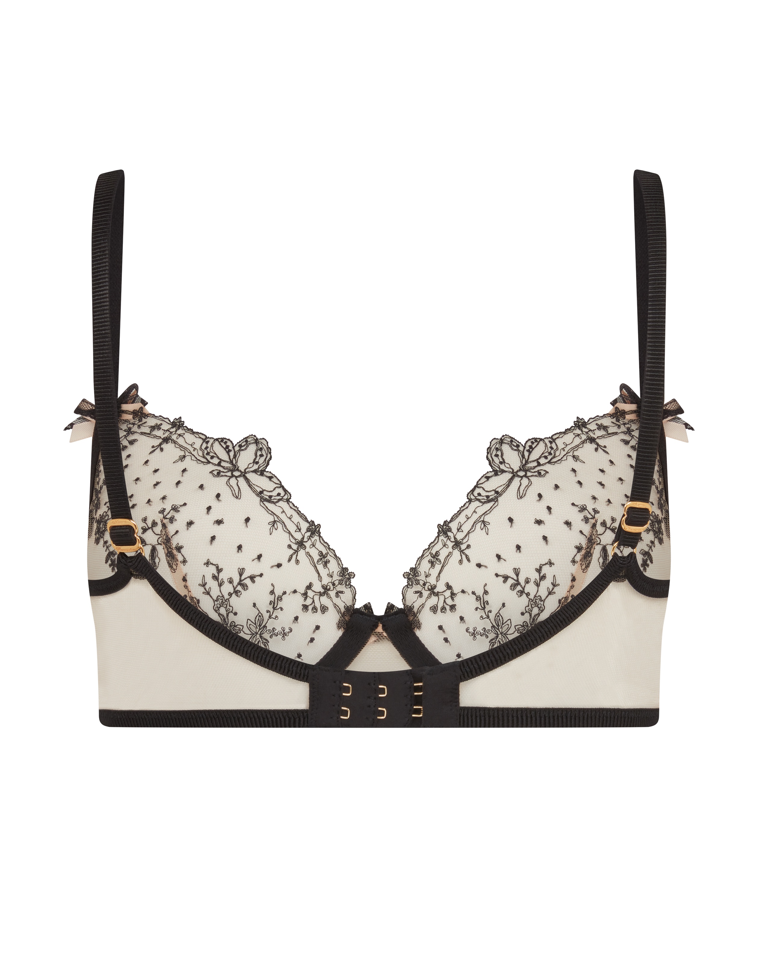 Бюстгальтер Graice черного цвета с глубоким вырезом выполнен из нежного песочного тюля с контрастной черной строчкой, подчеркивающей мягкий силуэт. Банты и роскошный итальянский тюль добавляют элегантности. Золотистая фурнитура ловит свет, пока вы ловите на себе восхищенные взгляды. Изучите искусство соблазна с коллекцией Graice.