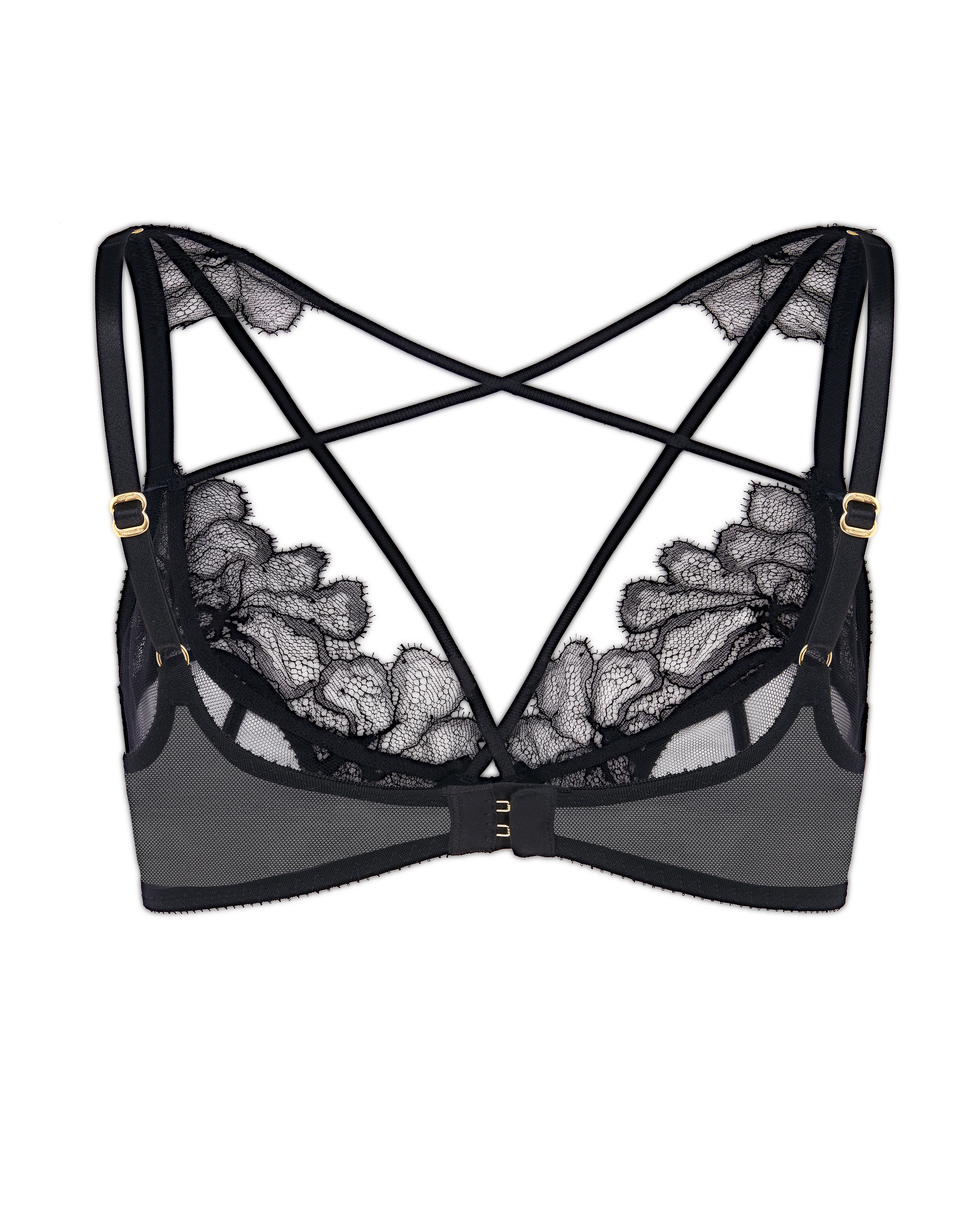 Черный бюстгальтер с мягкой чашкой Kissie изготовлен из прозрачного итальянского тюля с цветочным кружевом Leavers на чашках и плечах. Декоративные детали на декольте создают эффект высокого верха. Золотая фурнитура добавляет роскошный акцент. Сочетайте с остальными элементами коллекции Kissie для элегантного романтического образа.