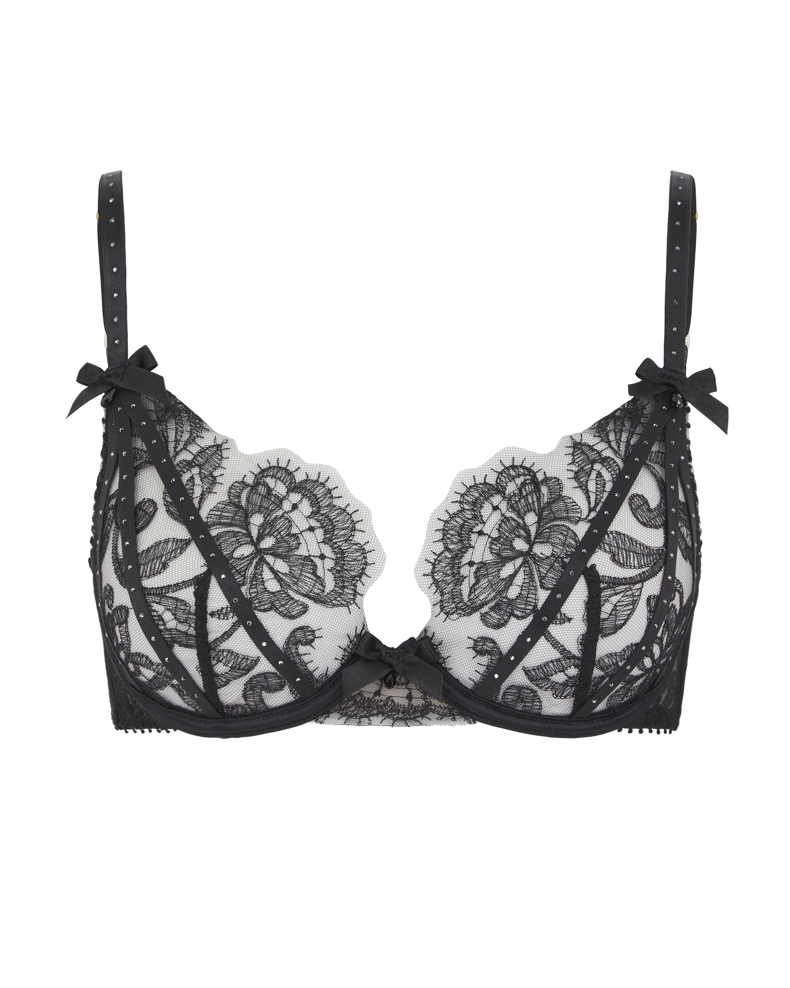 Черный бюстгальтер с мягкой чашкой Krystabell выполнен с глубоким вырезом. Украшен австрийской вышивкой с цветочным мотивом и мягкими эластичными ремешками с кристаллами Swarovski® Jet Hematite. По бокам имеются эластичные вставки и косточки, покрытые шелком, для дополнительной поддержки.