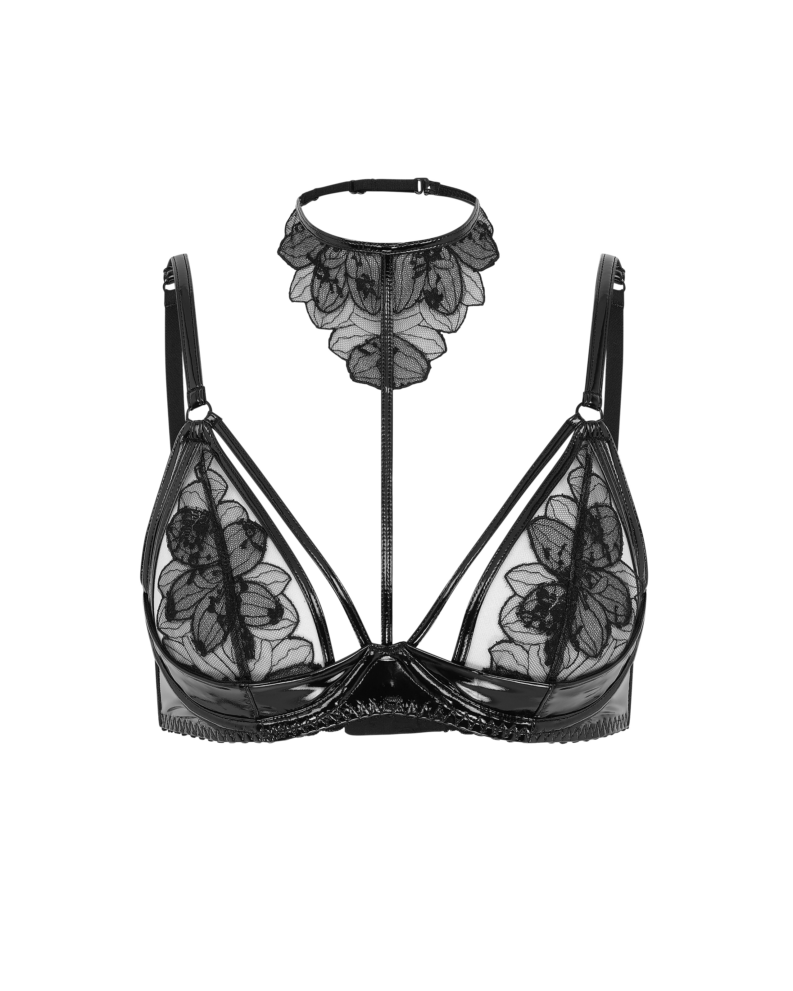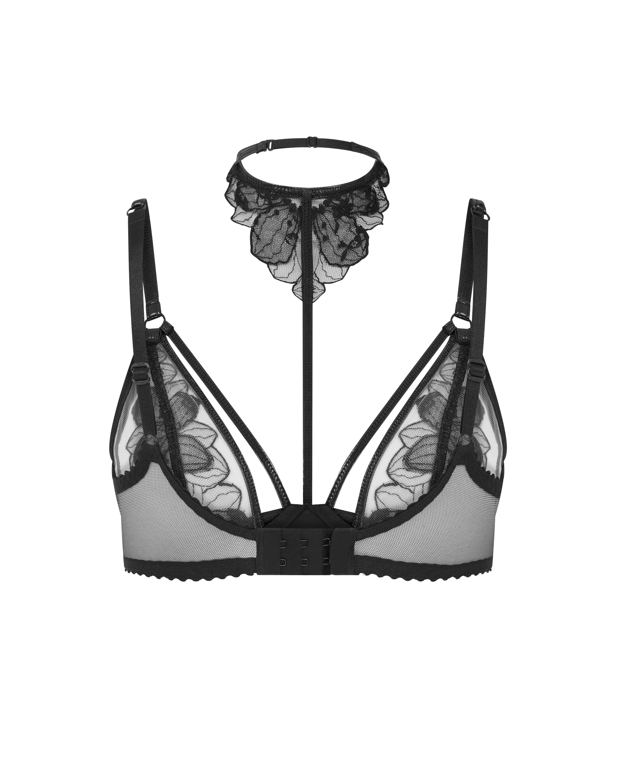 Бюстгальтер с мягкой чашкой Litzia — это сочетание прозрачного тюля с цветочной вышивкой. Чашки и бретели украшены ремешками, а съемный чокер на шее крепится к лифу с помощью крючка. Идеален для создания эффектного вечернего образа с остальными элементами коллекции.