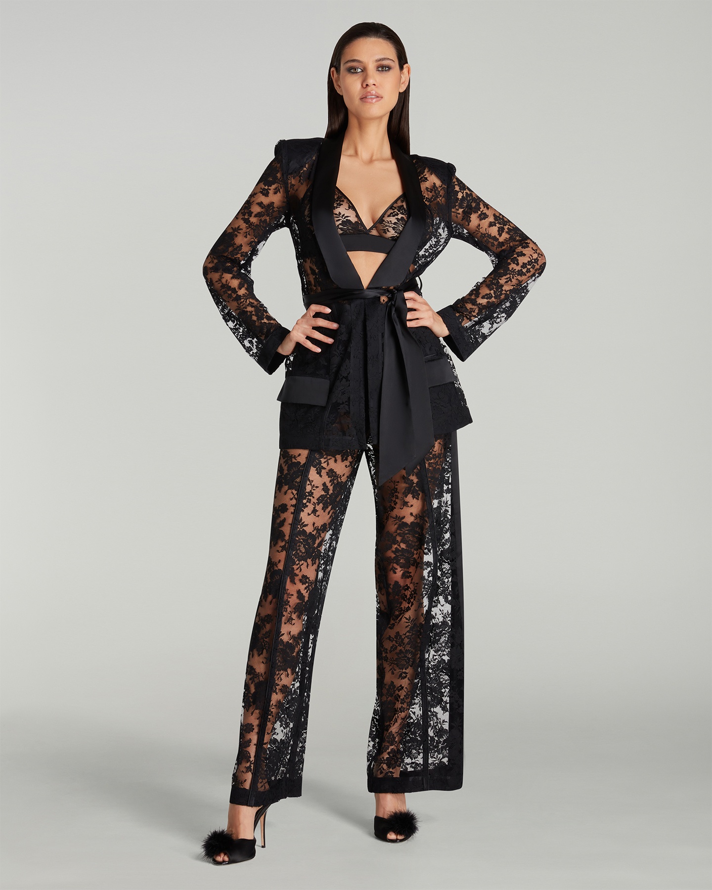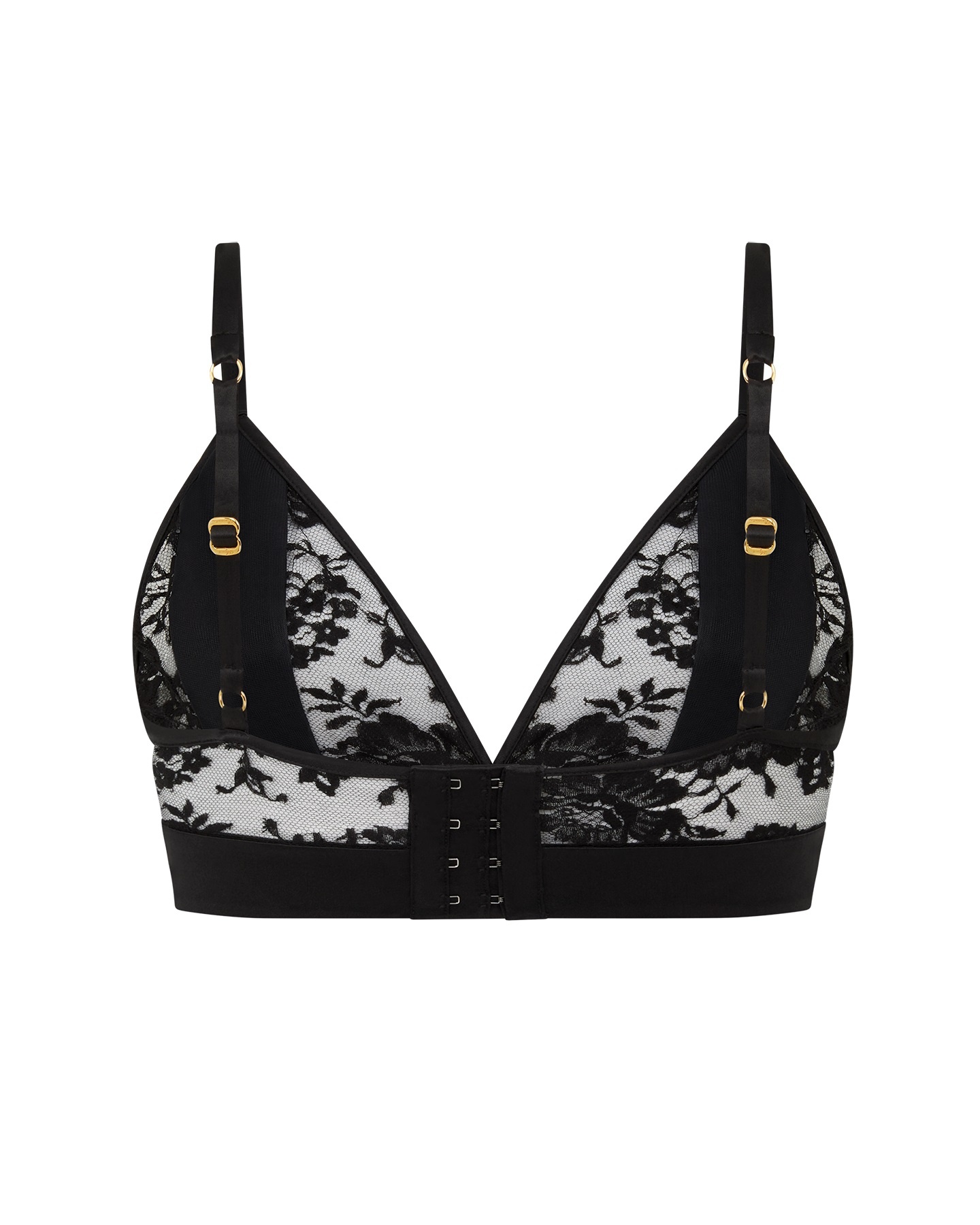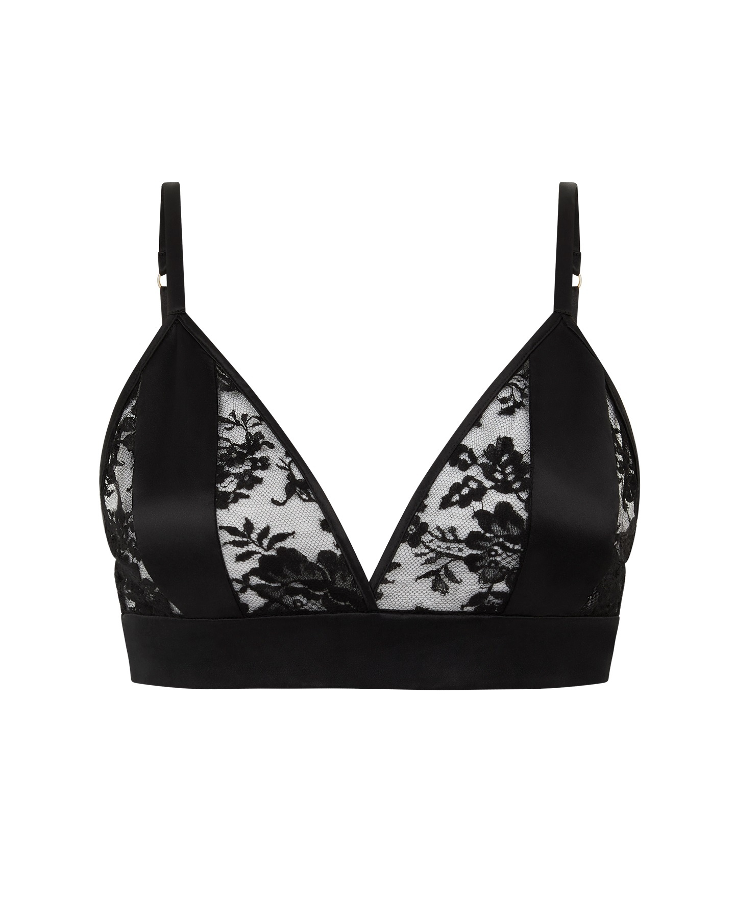 Бюстгальтер Niomi черного цвета с мягкими чашками, полностью выполненный из кружева Leavers. Центральная часть украшена шелковой вставкой. Шелковые бретели-трубочки и нижняя бейка, позолоченная фурнитура.