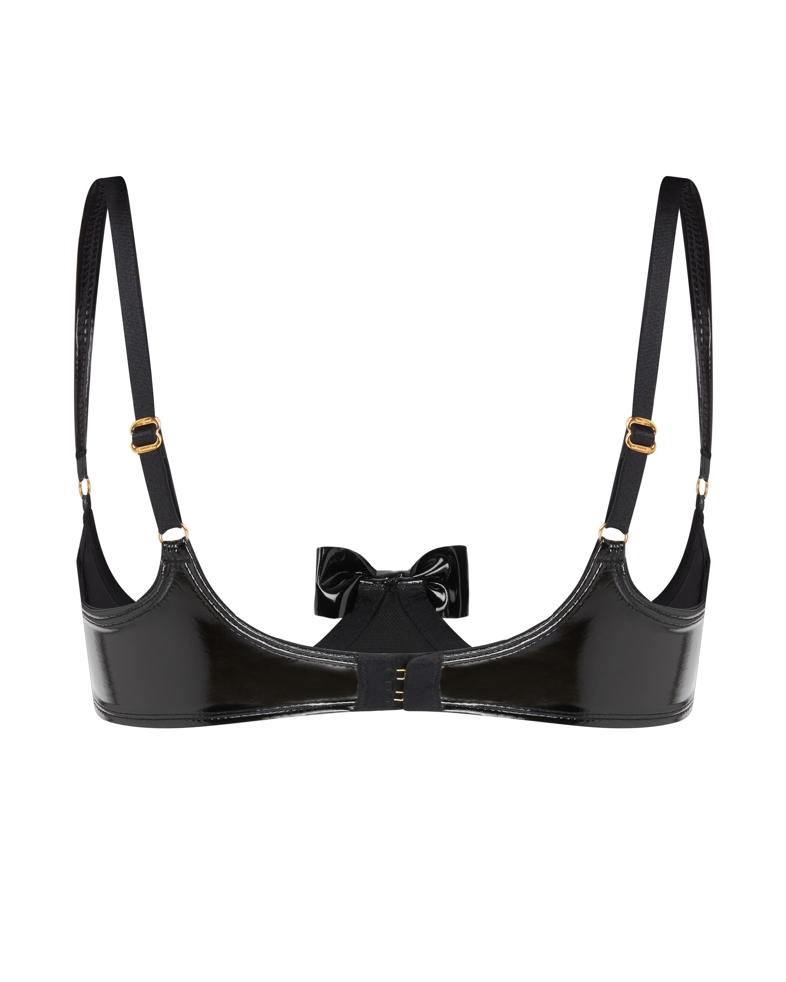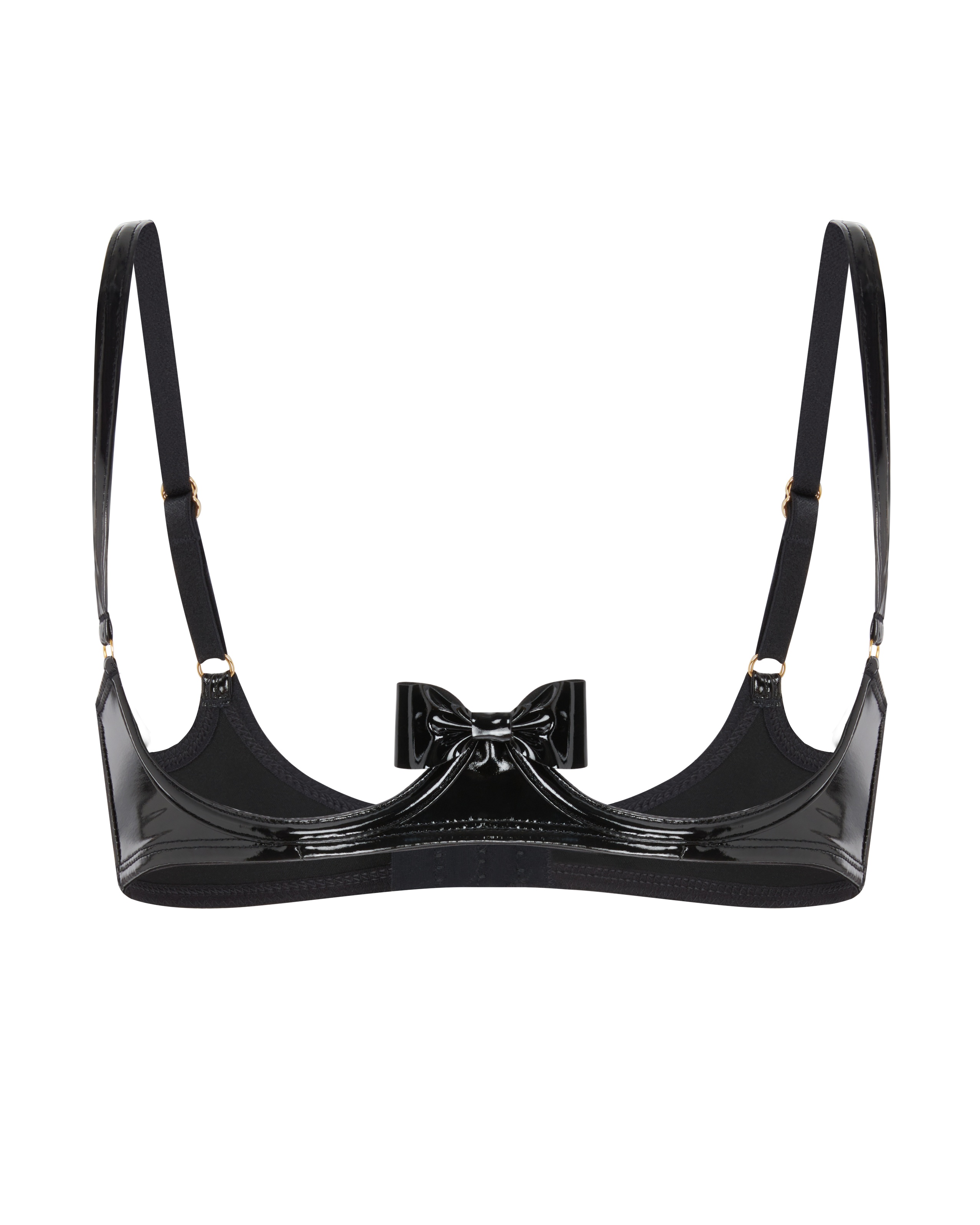 Открытый бюстгальтер Brina: глянцевый ПВХ, крупный бант в центре и золотая фурнитура. Соберите комплект с поясом и трусами Brina для провокационного ансамбля.