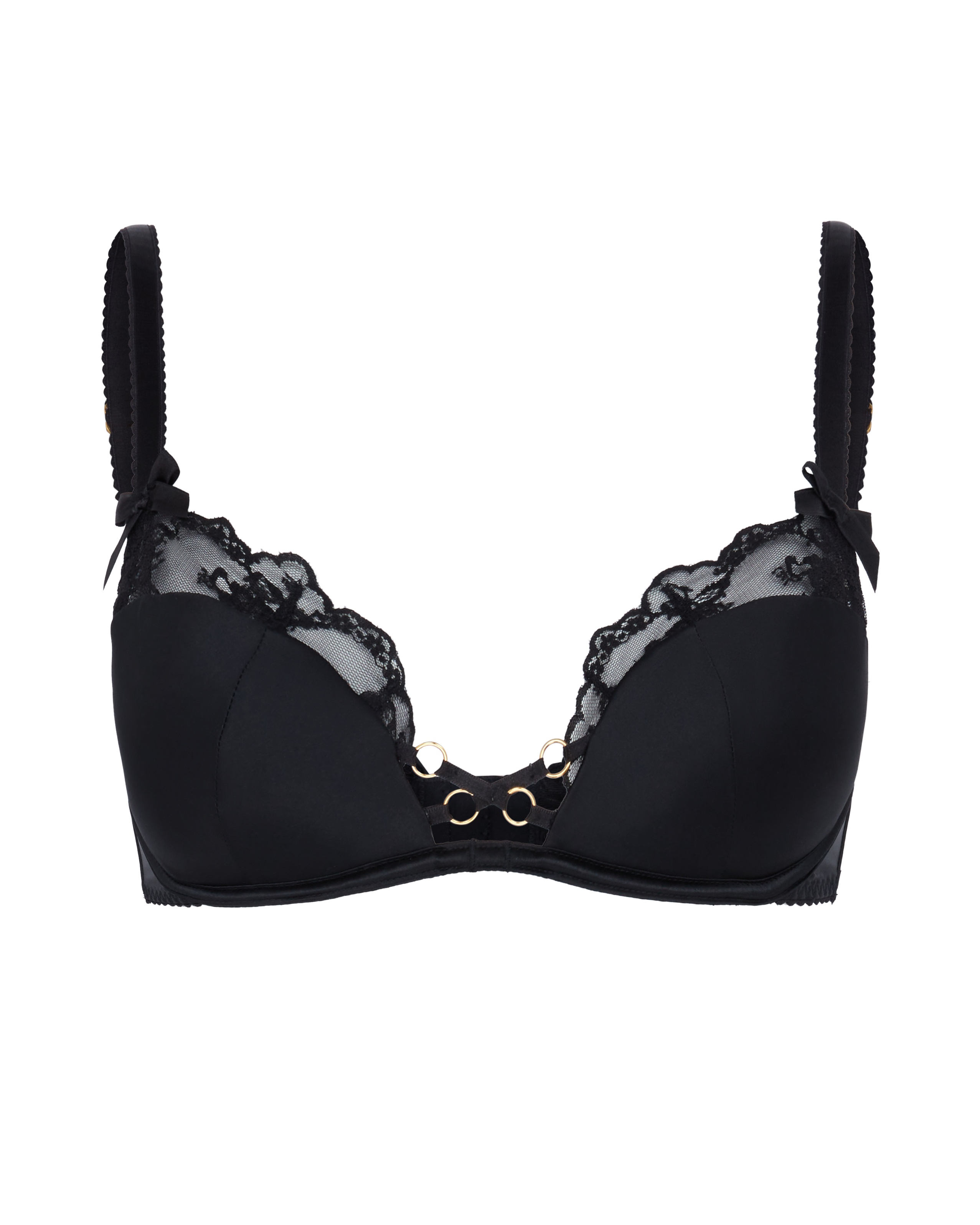 Бюстгальтер Daphnie черного цвета с плотными чашками и глубоким вырезом. Съемные вкладки для дополнительного объема и декольте. Чашки и чехлы для косточек отделаны шелком, кружево в винтажном стиле. Деталь в виде перекрестной шнуровки с золотистыми кольцами между чашками. Ажурный край на бретелях, позолоченная фурнитура. Сочетайте с другими предметами коллекции Daphnie для создания соблазнительного образа.
