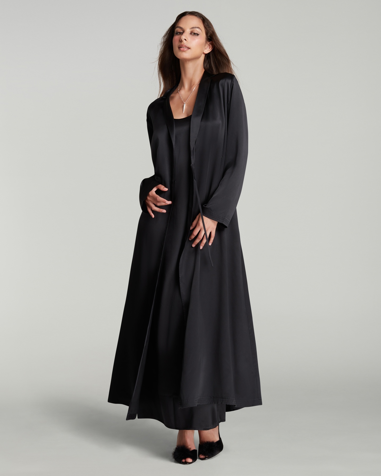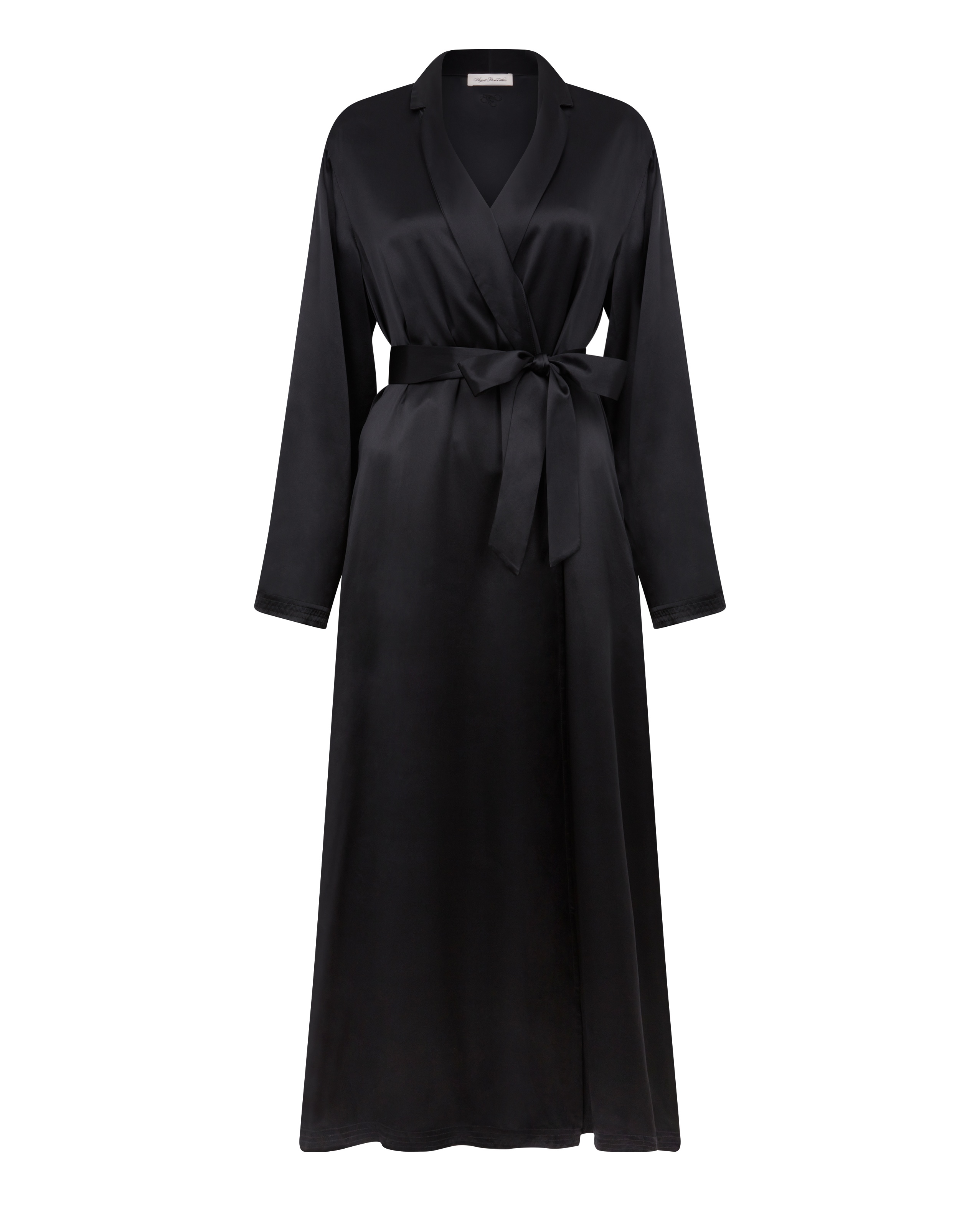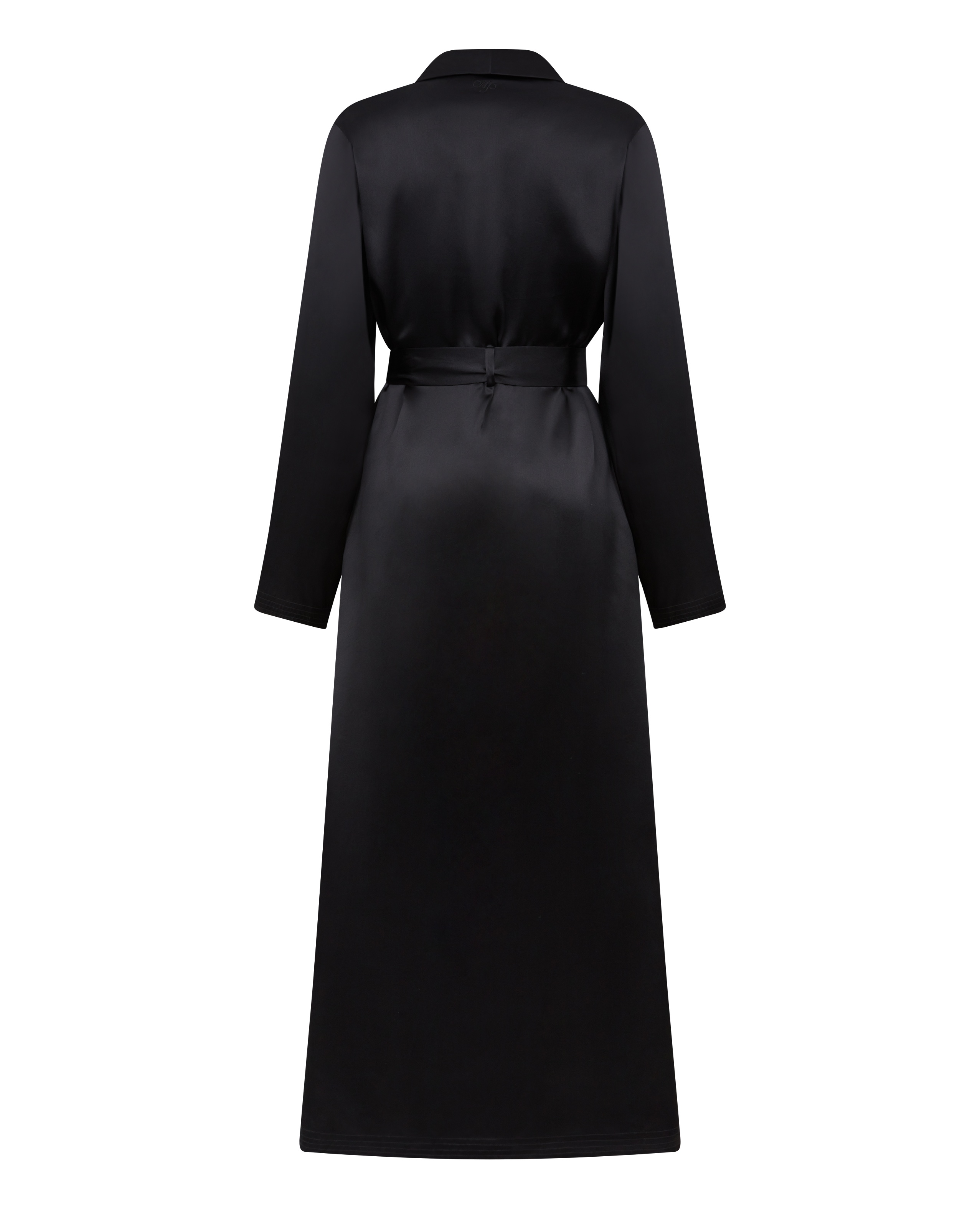 Черный длинный халат Cecily: таинственный шелк, скрывающий и открывающий. Мягкая драпировка и вечная элегантность. Идеальный партнер для нижнего белья AP.