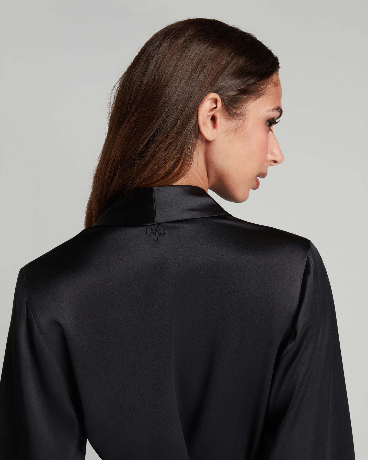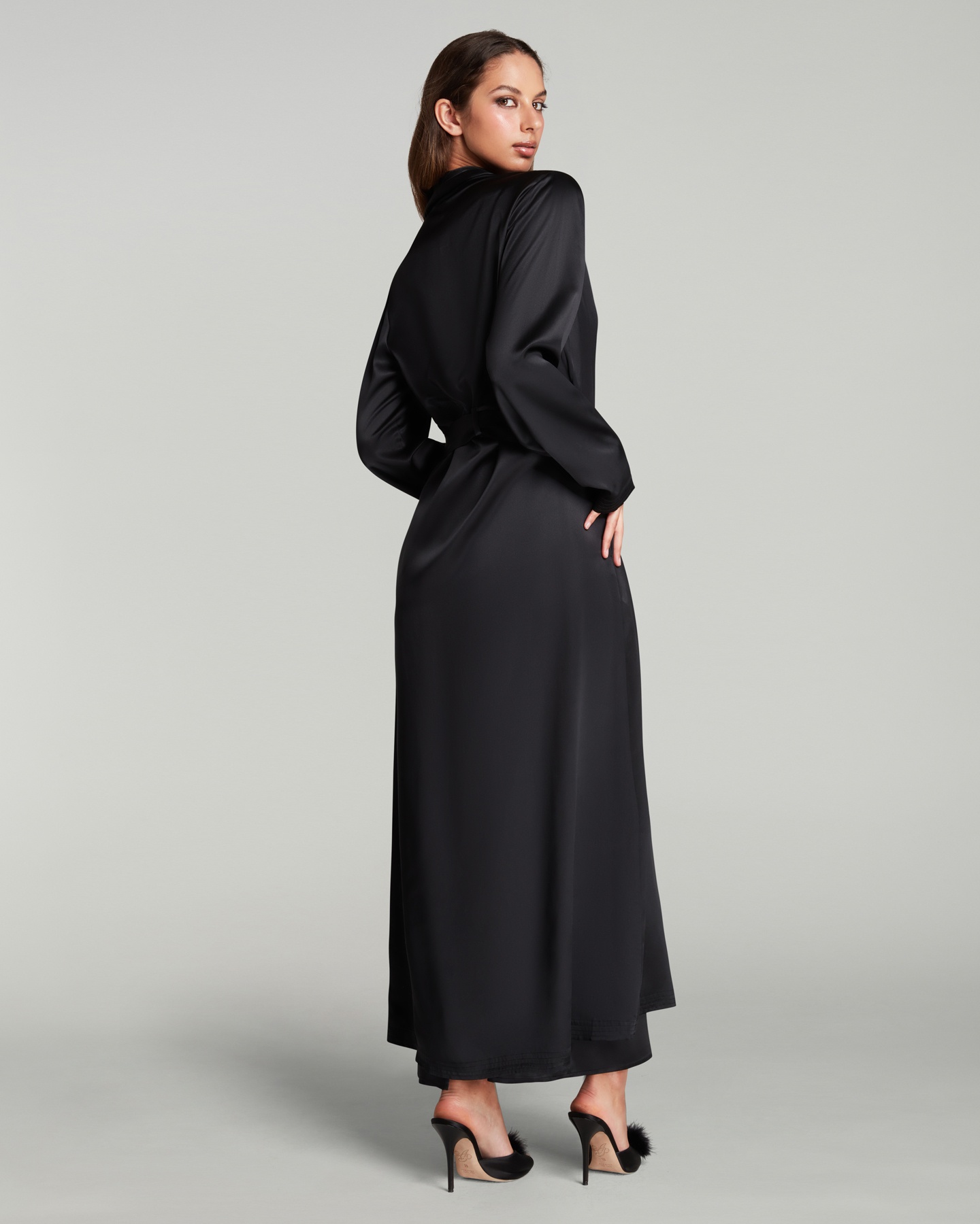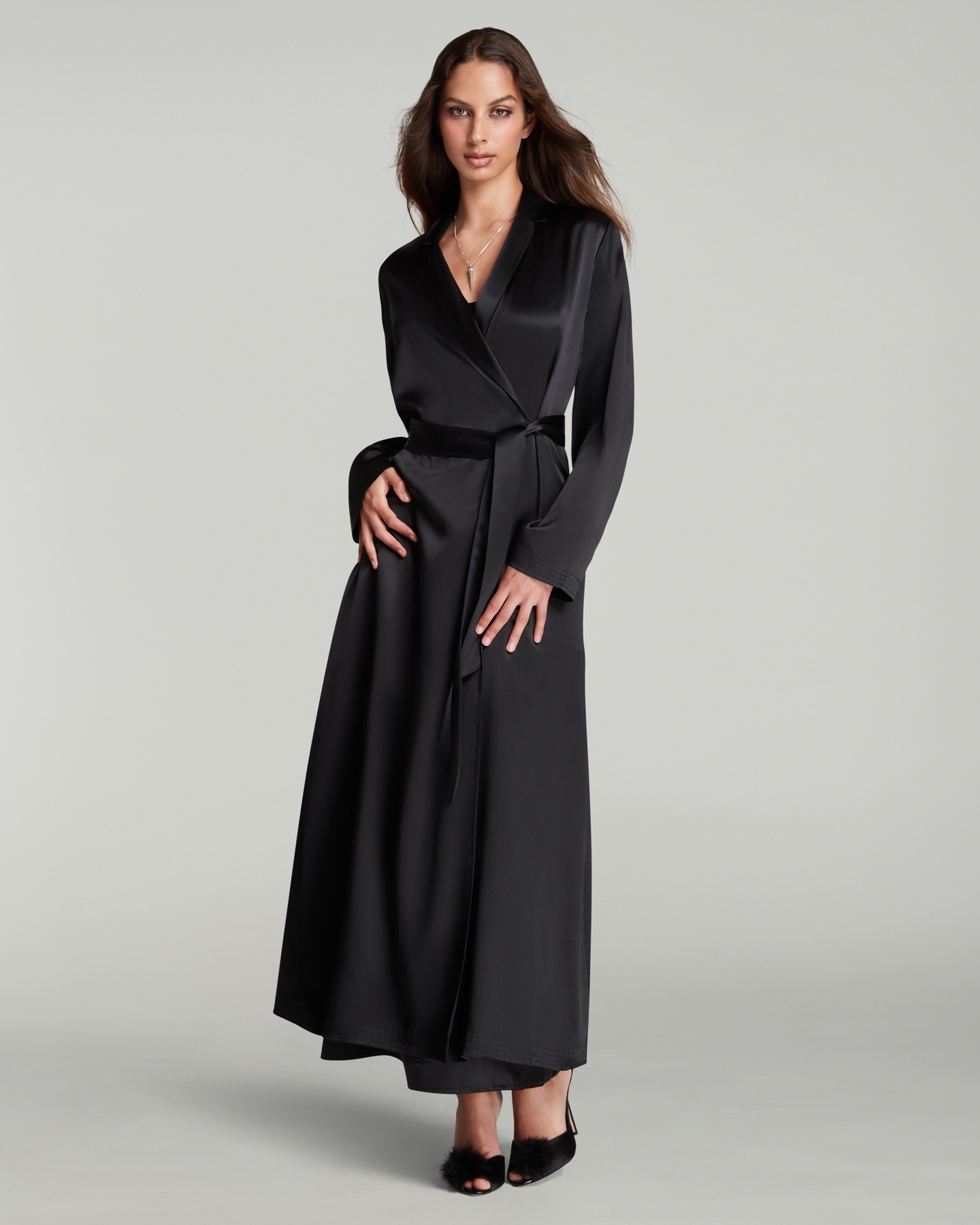 Черный длинный халат Cecily: таинственный шелк, скрывающий и открывающий. Мягкая драпировка и вечная элегантность. Идеальный партнер для нижнего белья AP.
