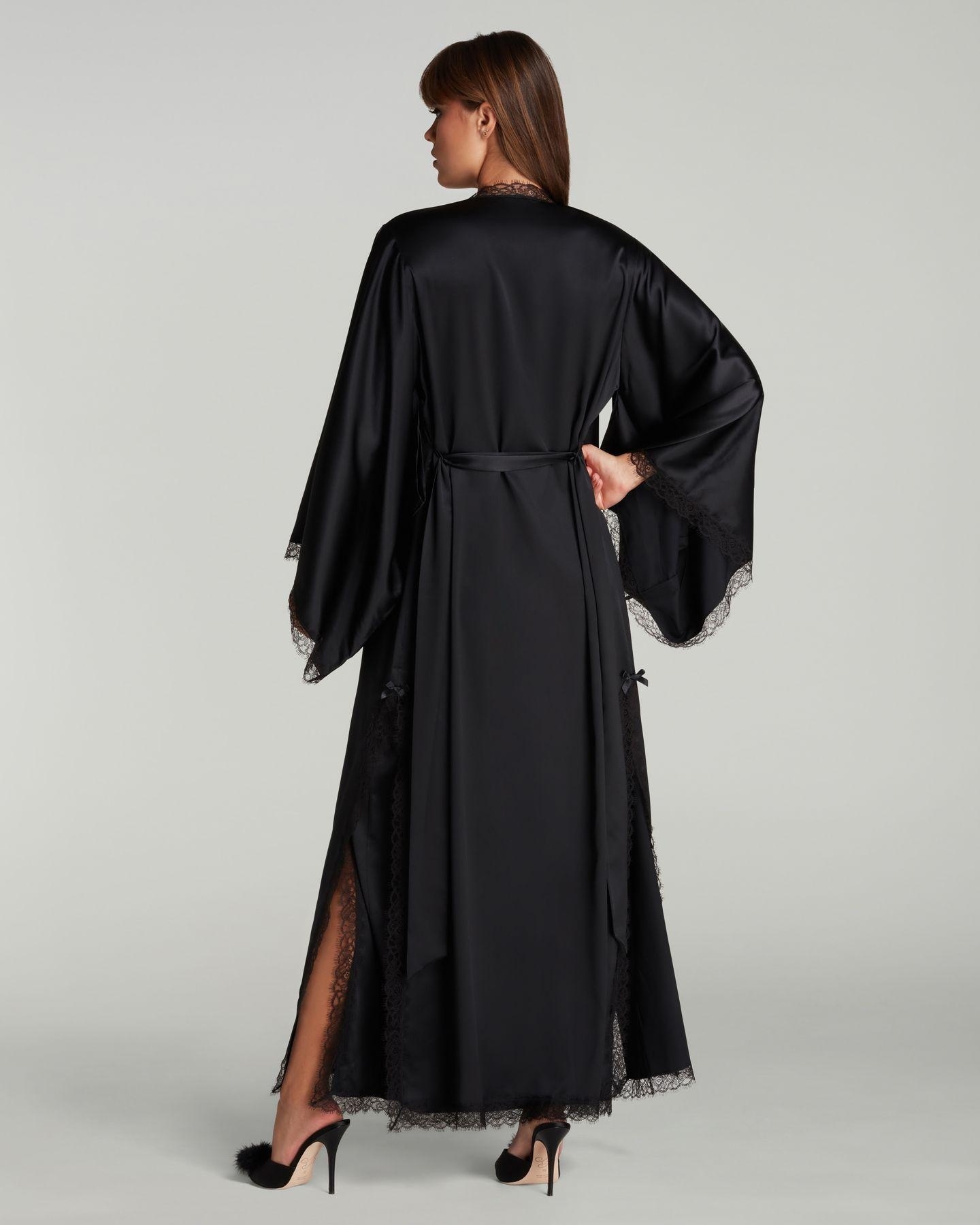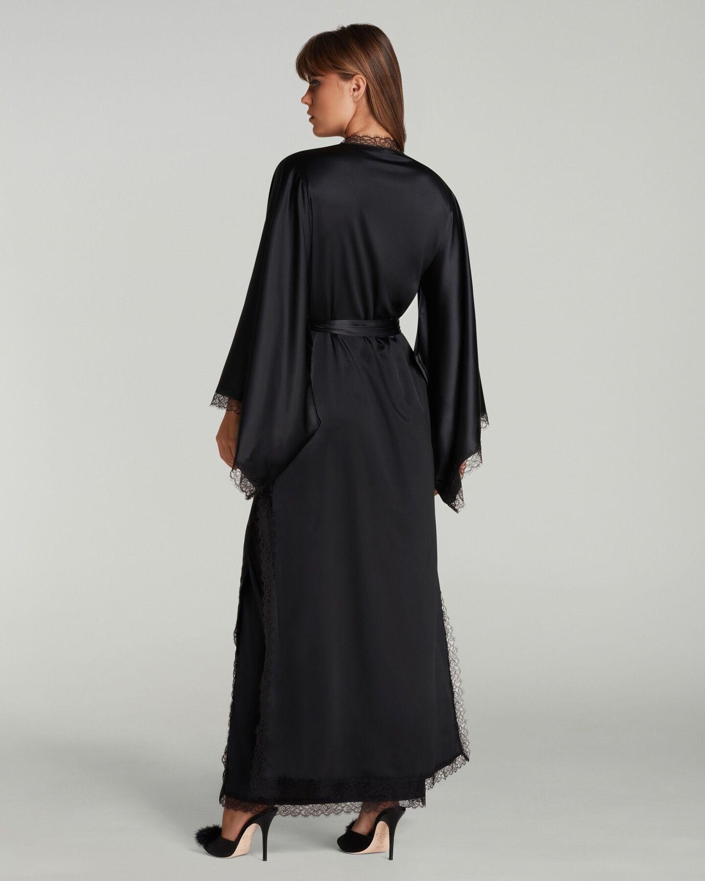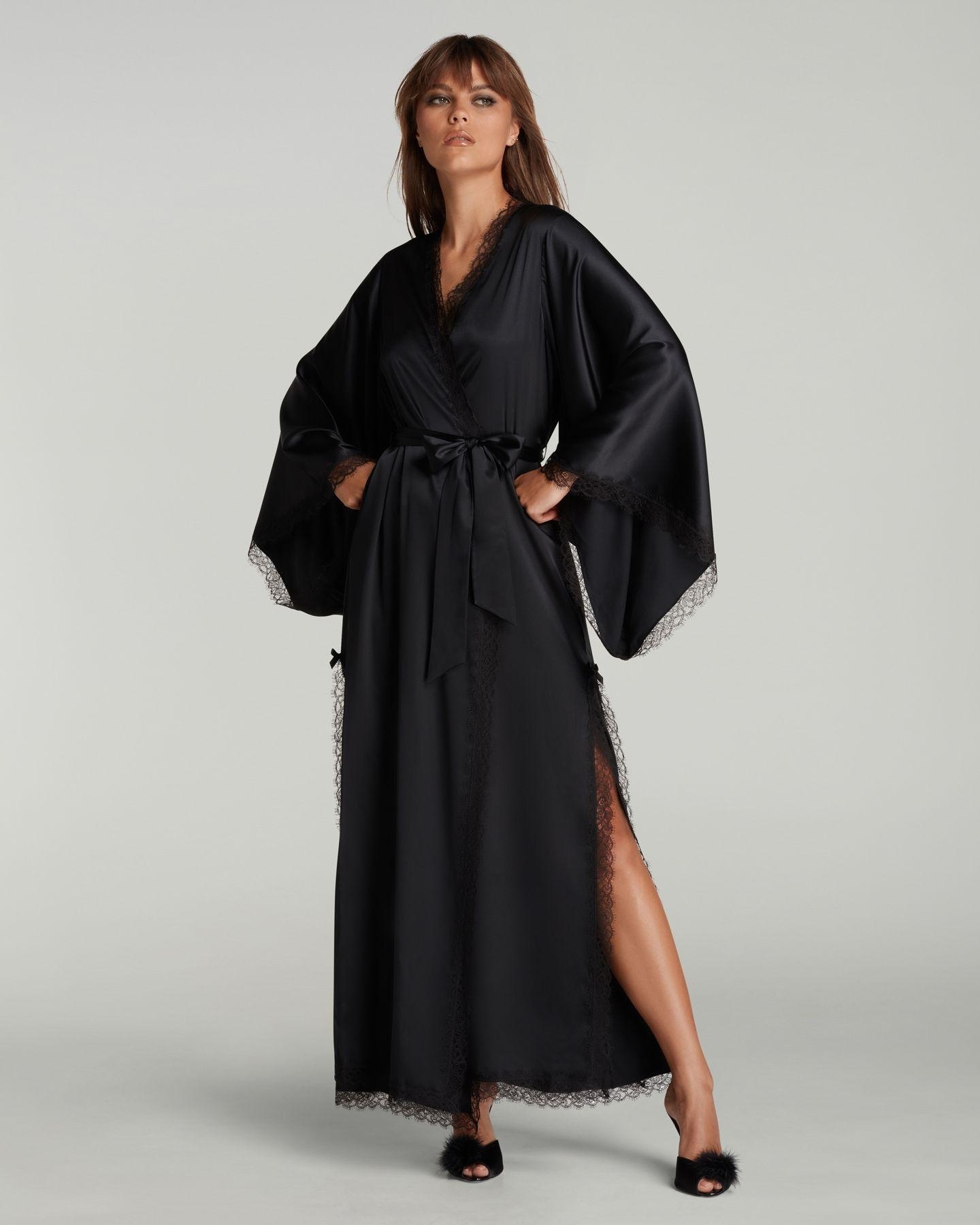 Длинный халат-кимоно Gisele черного цвета из эластичного шелкового атласа декорирован кружевом Leavers. Пояс-кушак подчеркивает талию. Наденьте поверх сорочки Gisele для создания таинственного романтического образа.