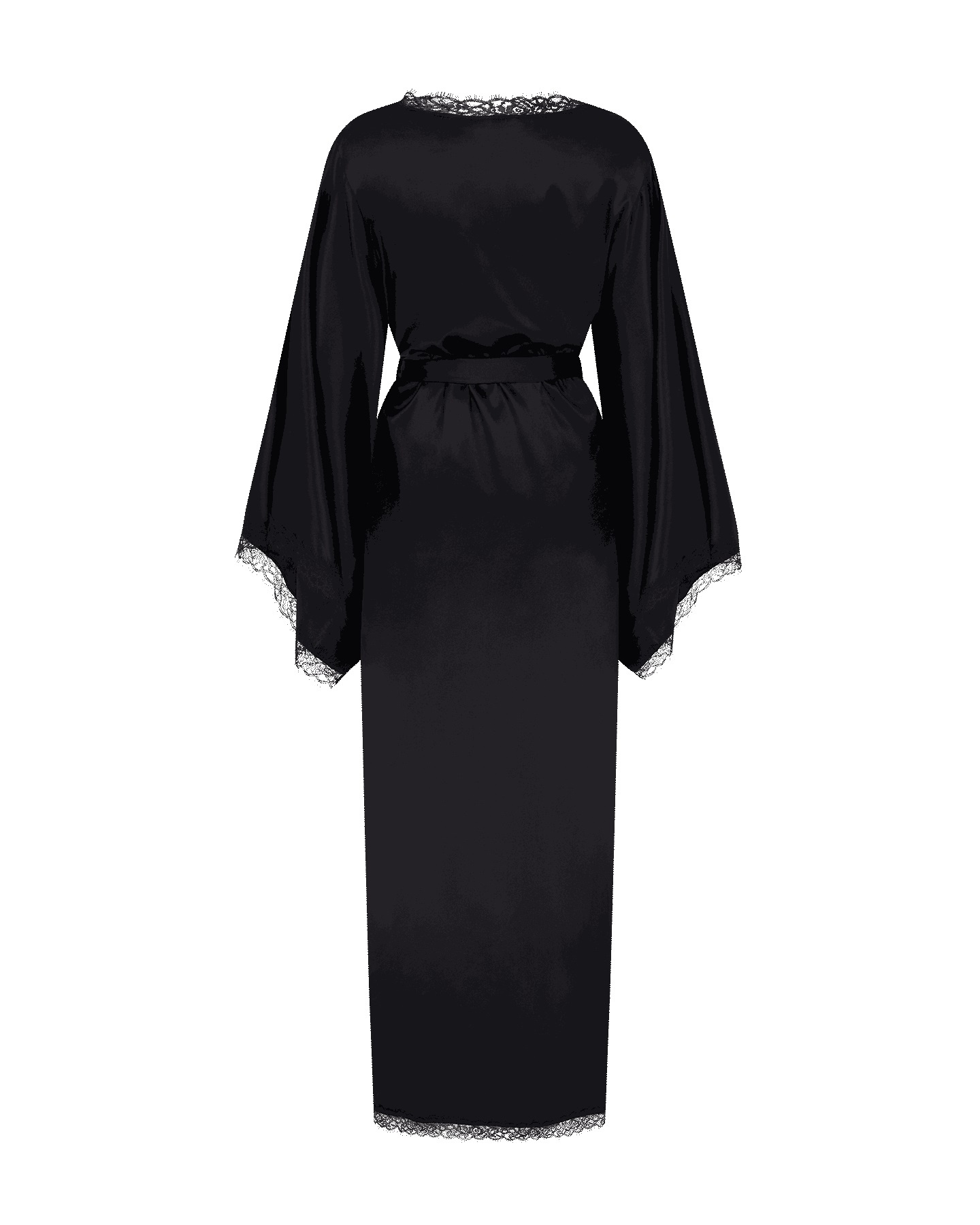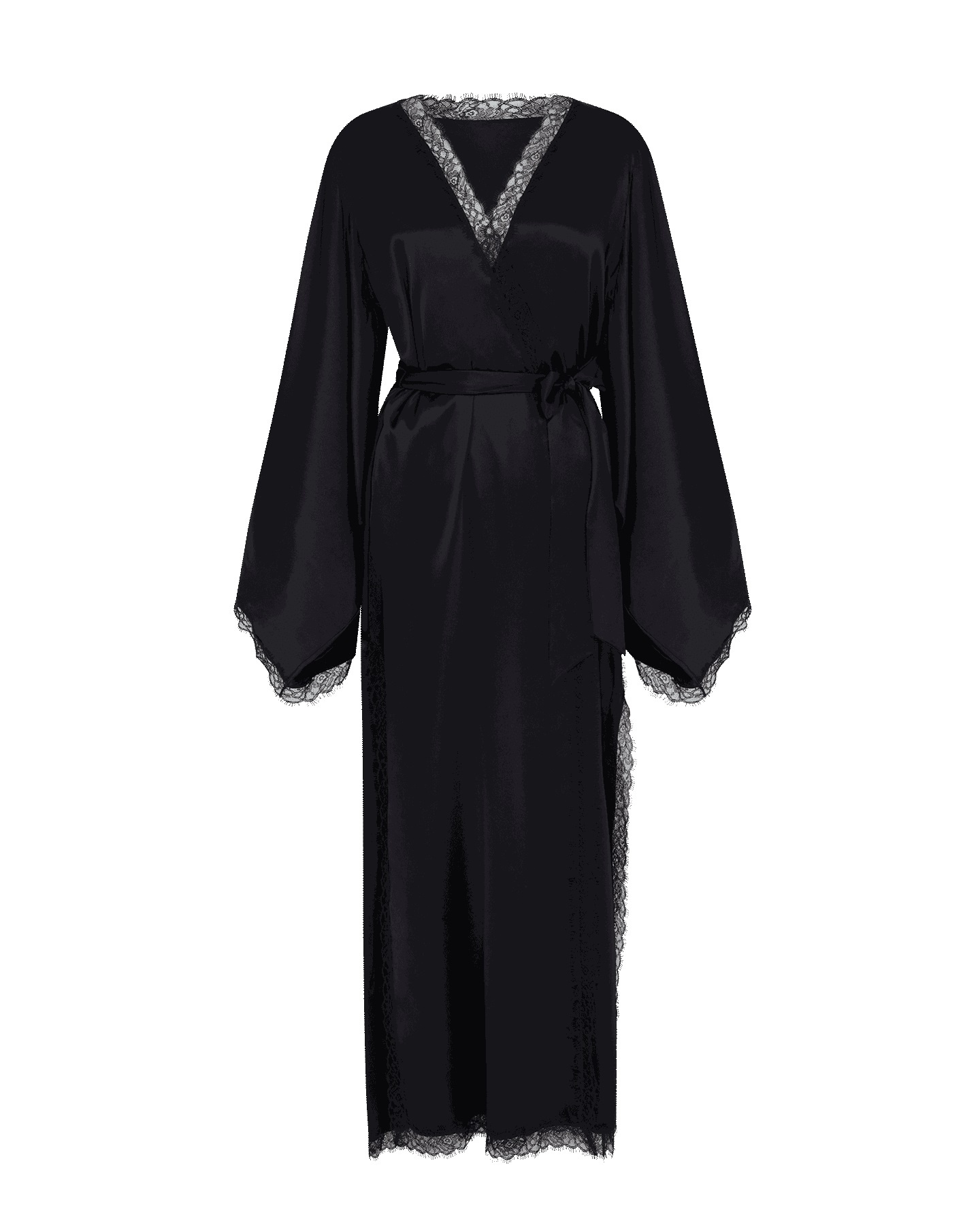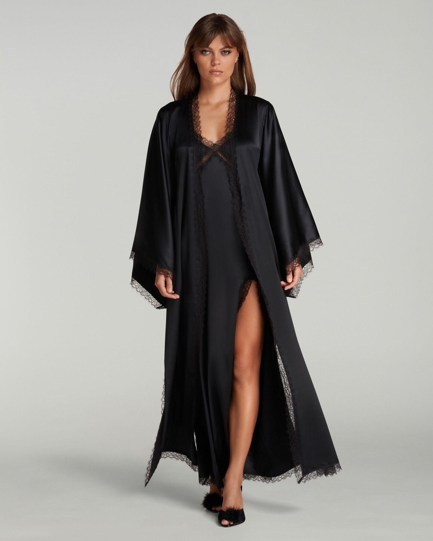 Длинный халат-кимоно Gisele черного цвета из эластичного шелкового атласа декорирован кружевом Leavers. Пояс-кушак подчеркивает талию. Наденьте поверх сорочки Gisele для создания таинственного романтического образа.