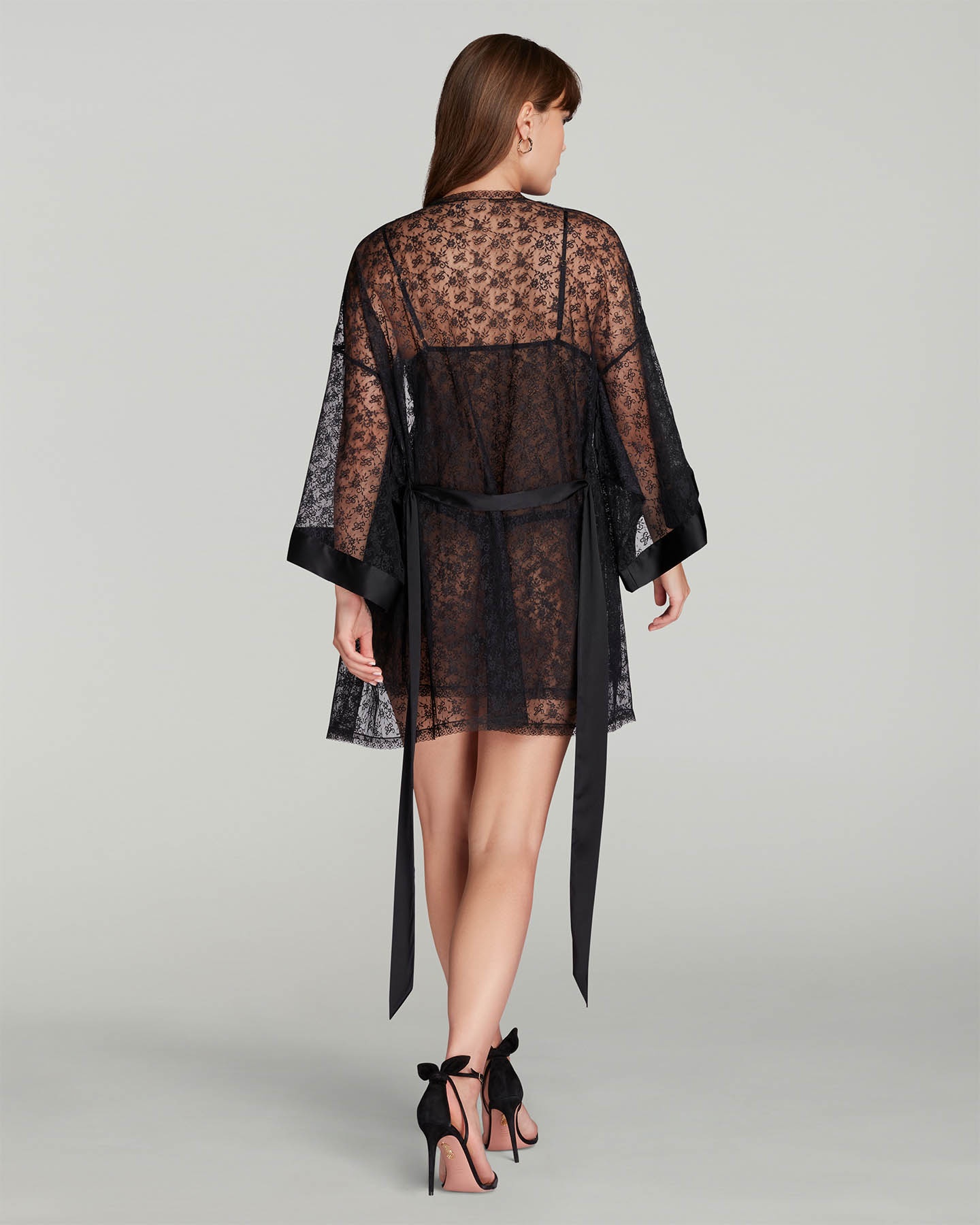 Короткое кимоно черного цвета изготовлено из итальянского кружева с цветочным узором Point d'Esprit и логотипом AP. Рифленые рукава с отделкой из шелкового атласа и мягкий пояс из него же добавляют образу винтажости. Для полного погружения в стиль ретро носите с остальной линейкой.