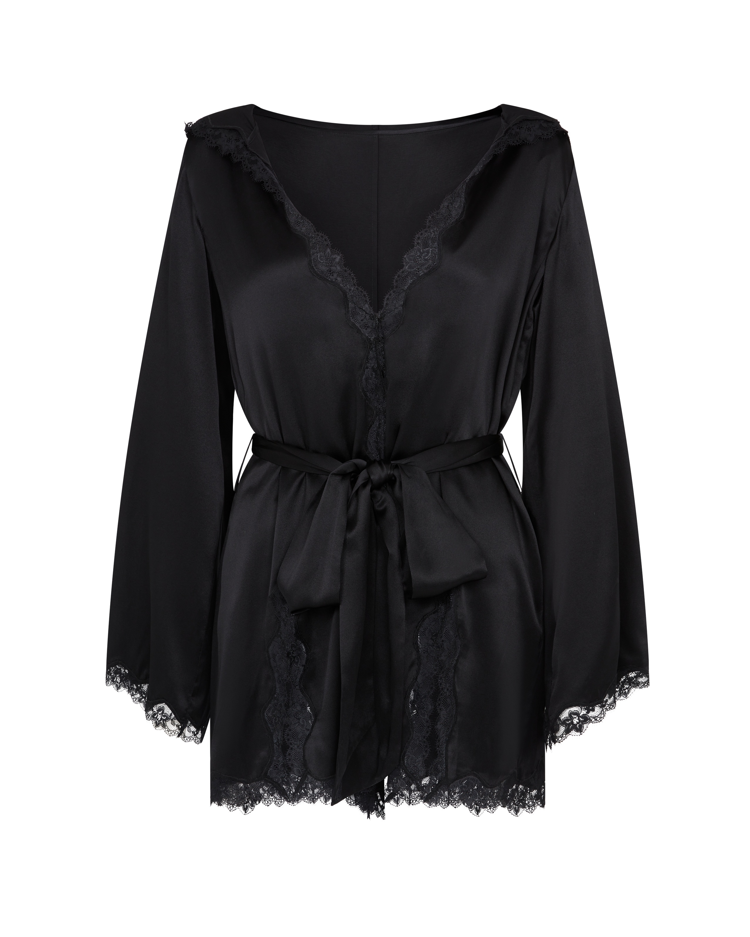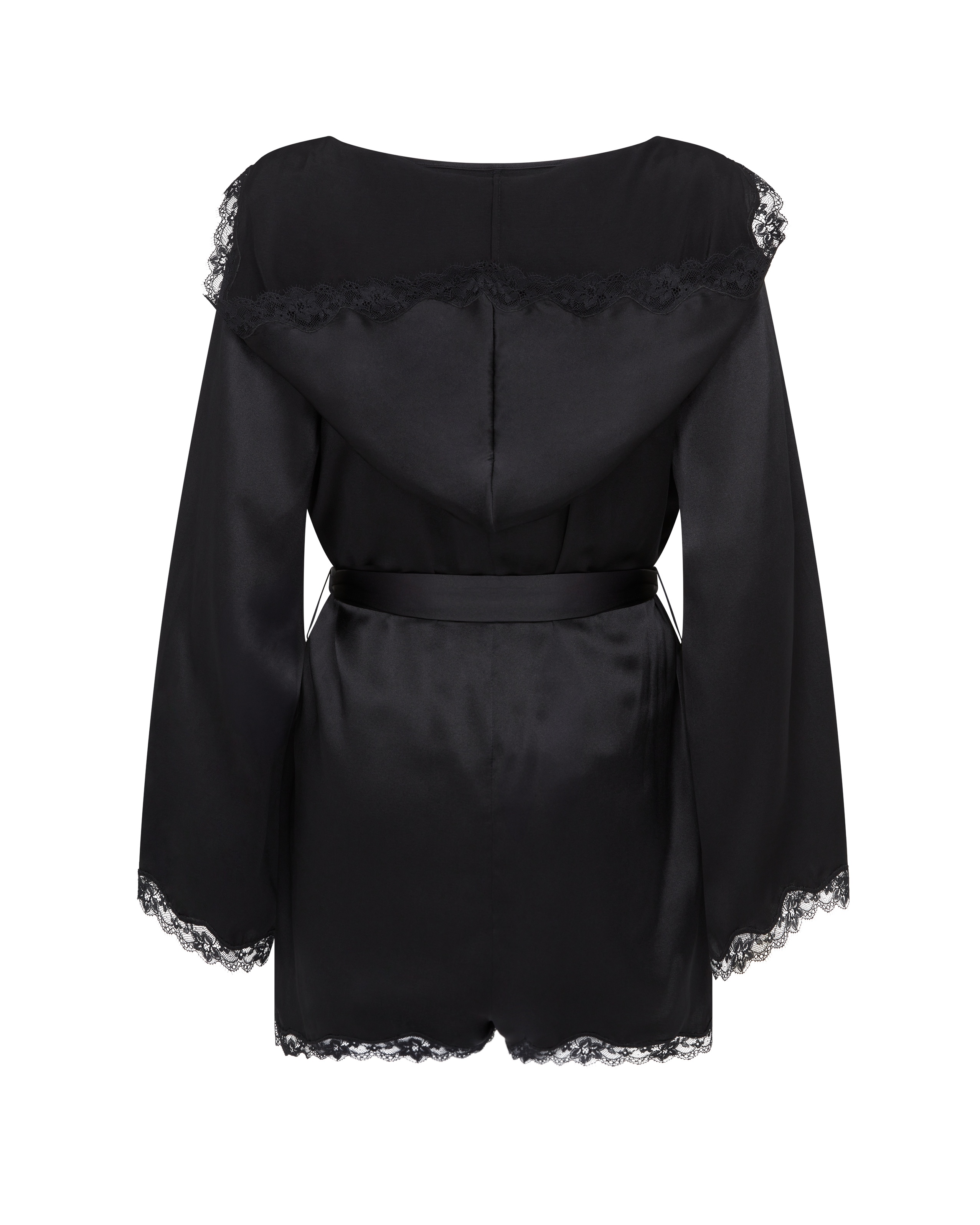 Комбинезон Freia из эластичного шелка с капюшоном и поясом на завязке сочетает комфорт и изысканные детали. Края украшены ресничным кружевом.