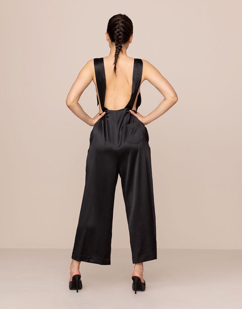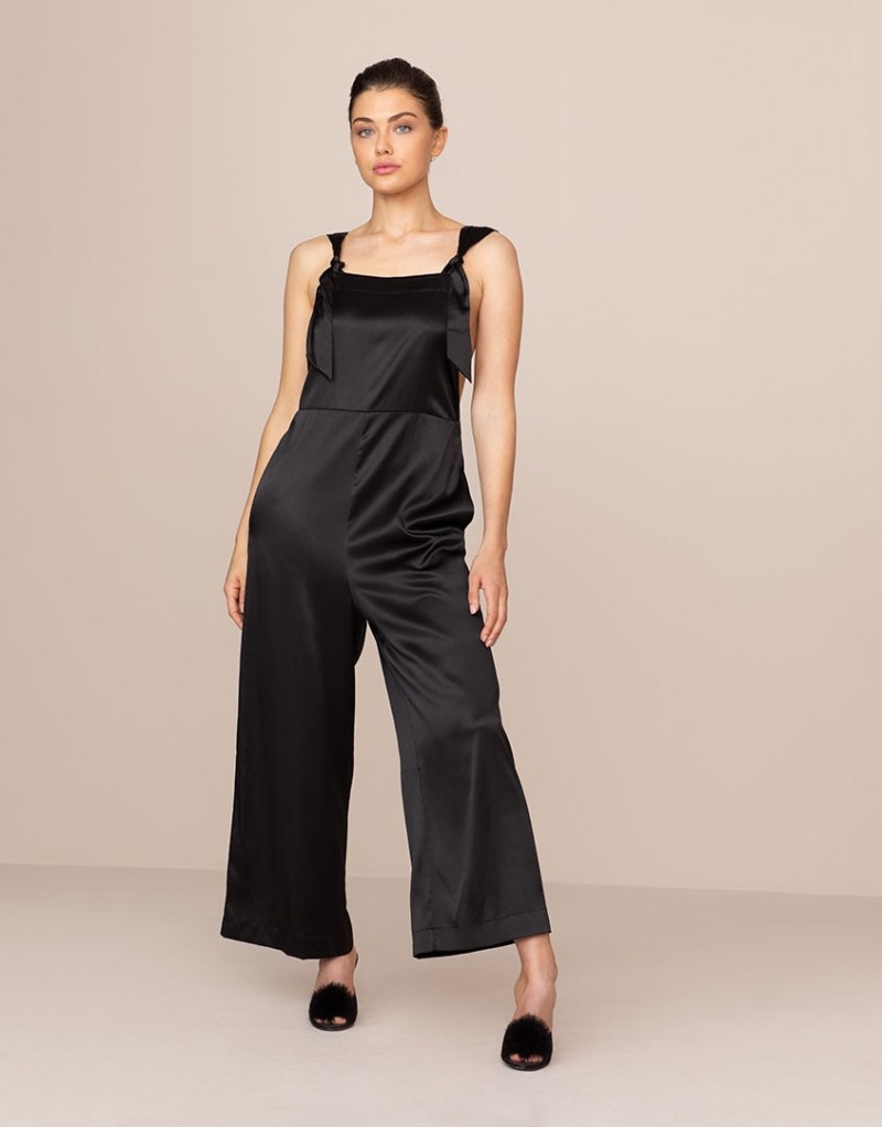 Многофункциональный элегантный черный комбинезон Jaimi можно носить как верхнюю одежду или вместо ночной сорочки. Модель свободного кроя из роскошного шелкового сатина дополнена широкими бретелями на завязках. Чувственный вырез, обнажающий спину, завершает образ.