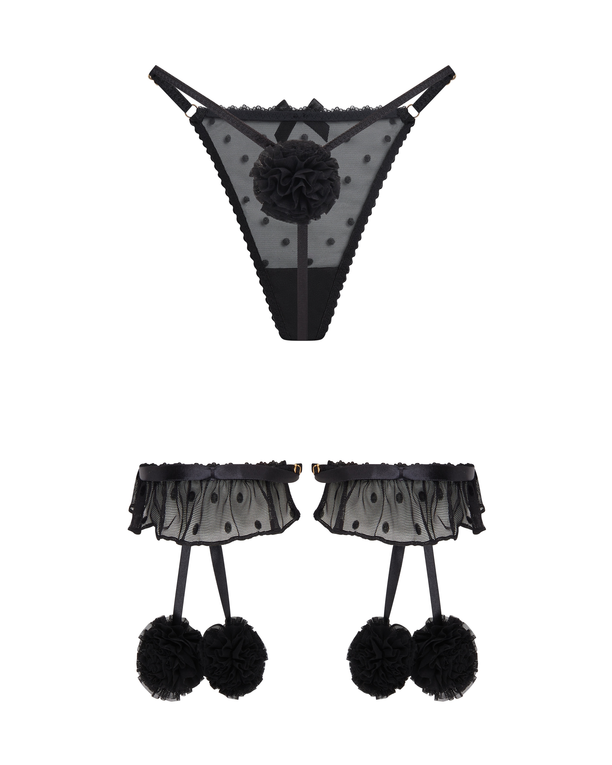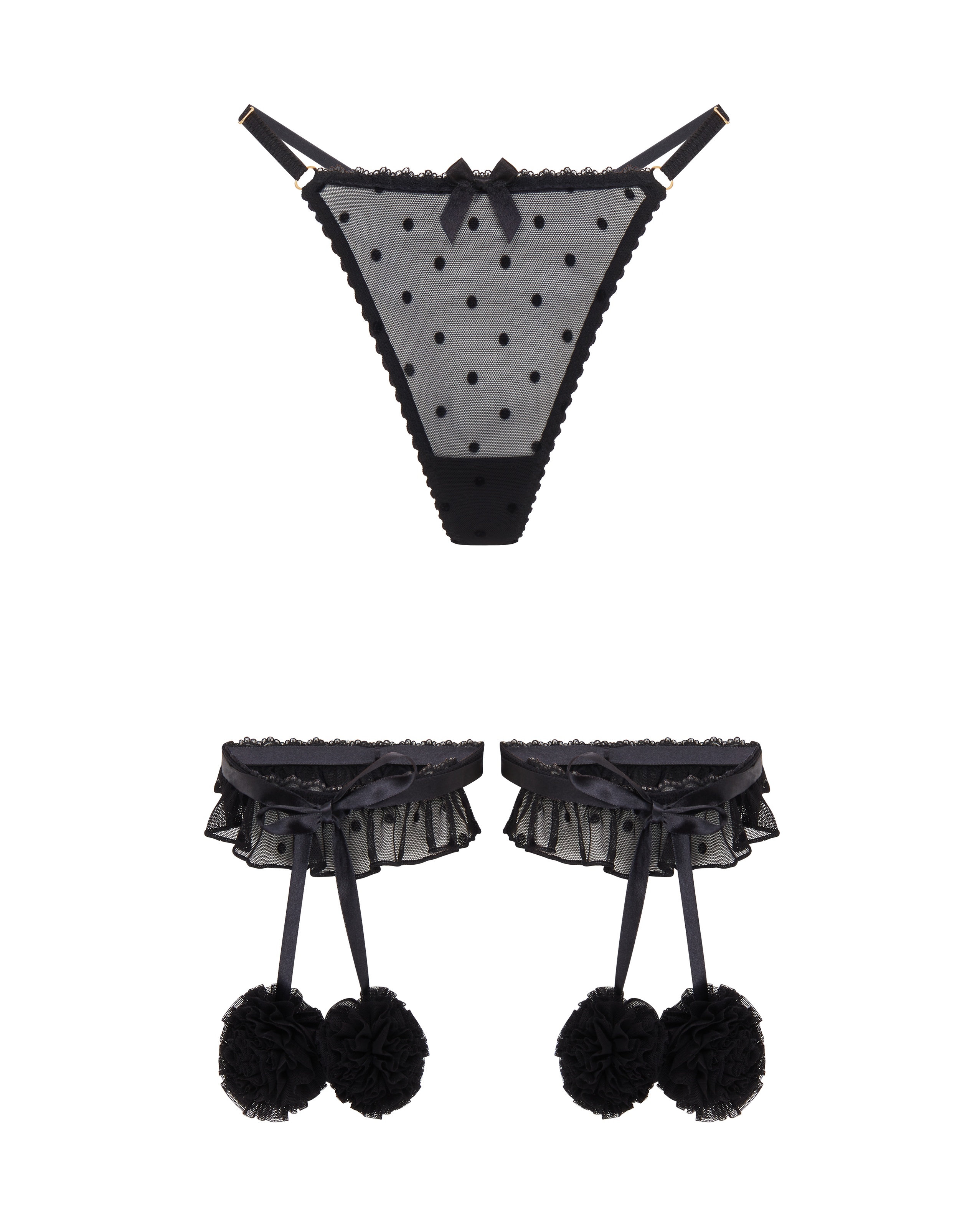 | Состав | Подвязка: Основа корпуса: 92% полиамид, 8% эластан; Флокирование: 100% полиамид; Лента: 100% полиамид; Отделка пампона: Основная часть: 92% полиамид, 8% эластан; Флокирование: 100% полиамид; Стринги: Основа верха: 92% полиамид, 8% эластан; Флокирование: 100% полиамид |