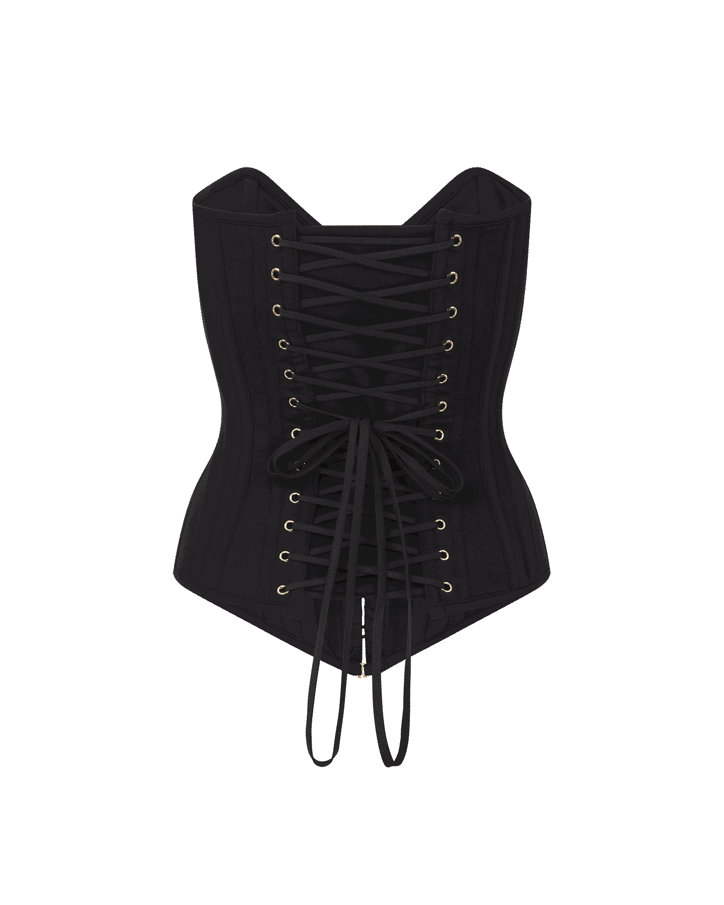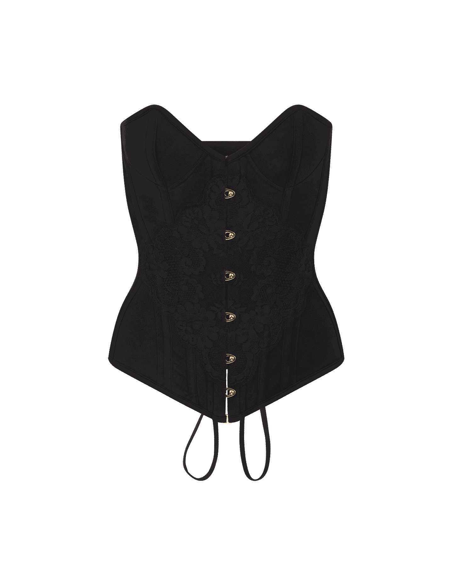 Лаконичный и изысканный, корсет Carri создаст роскошный будуарный образ. Эта модель отличается архитектурными линиями кроя и жесткими косточками, которые моделируют силуэт. Гладкая ткань черного цвета украшена изысканным кружевом в тон. Застежка на золотистые крючки спереди, а на спине расположена декоративная шнуровка.