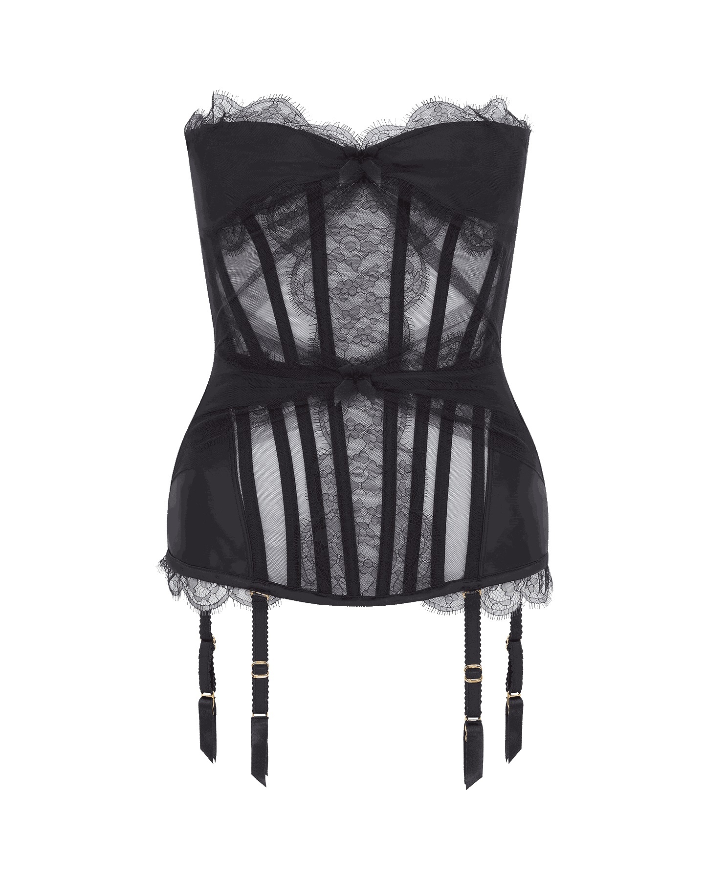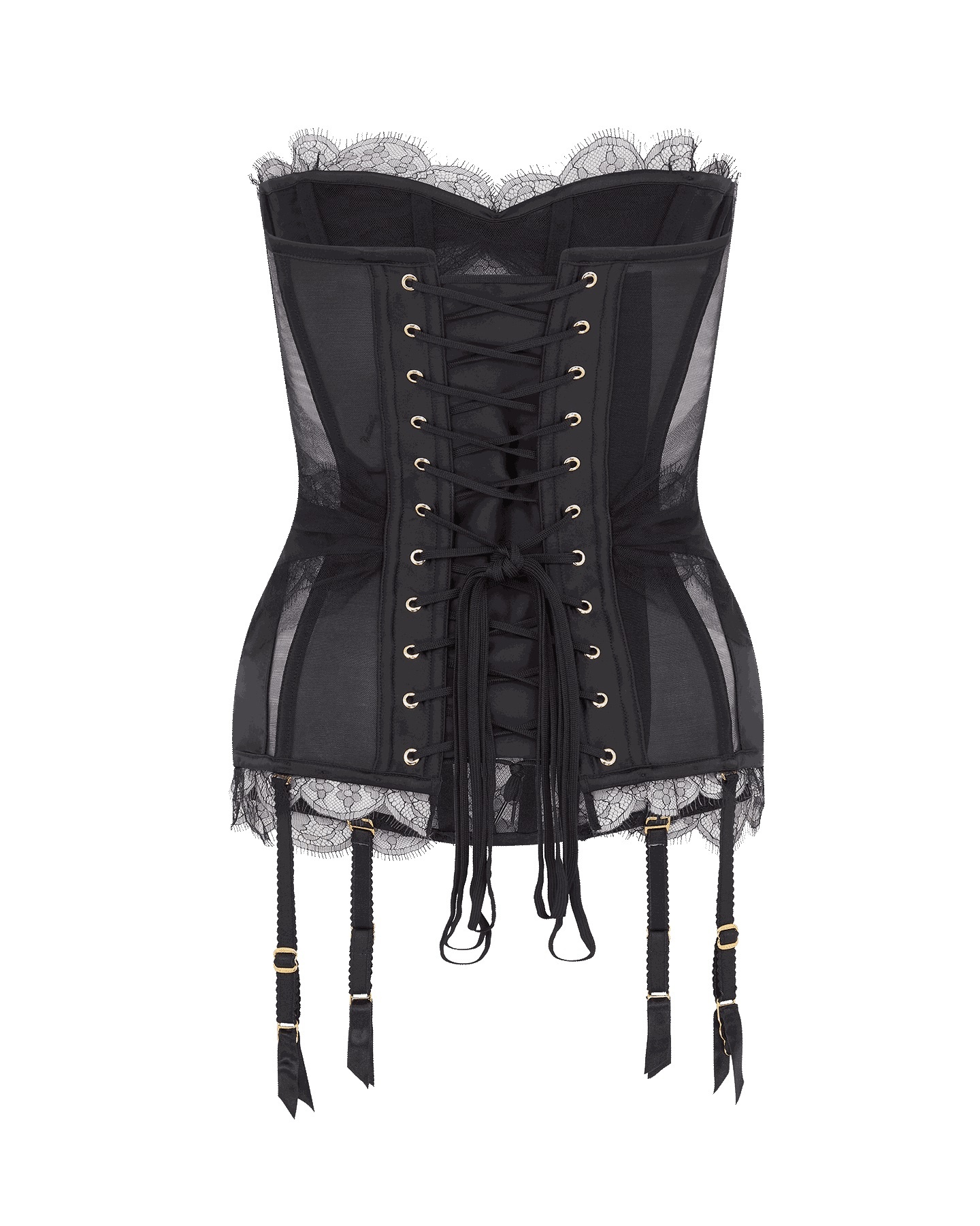 Воздушный черный корсет Halley из тюля сочетает атласные вставки на груди и талии, окантованные ажурным кружевом, с тюлевой сборкой. Декольте "сердечко" с атласной окантовкой, банты мз органзы спереди и съемные подвязки создают романтичный образ. Лепестковый подол и шнуровка сзади с атласной планкой завершают дизайн. Только в полном комплекте Halley этот корсет откроет все грани своего очарования.